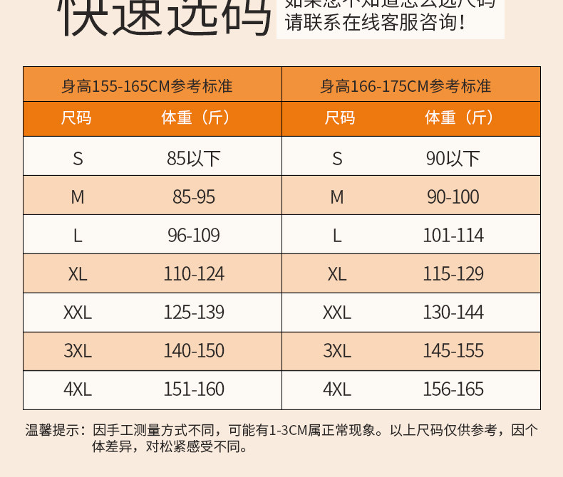 尺码 【版型不大,请勿买小一码】,S(建议85斤以下),M(建议85-95斤),L(建议95-109斤),XL(建议110-124斤),XXL(建议125-139斤),3XL(建议140-150斤),4XL(建议151-160斤)
