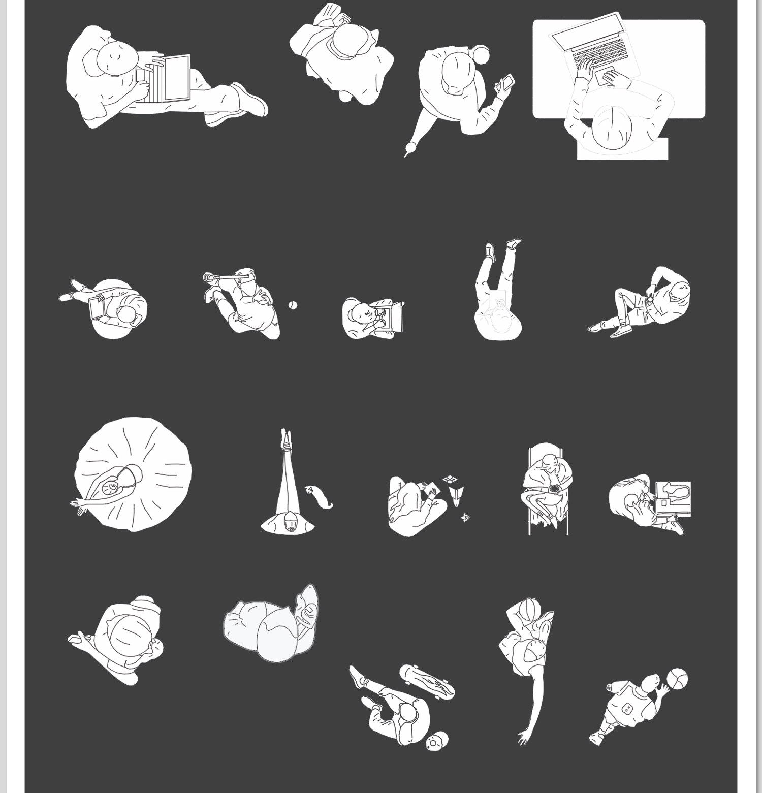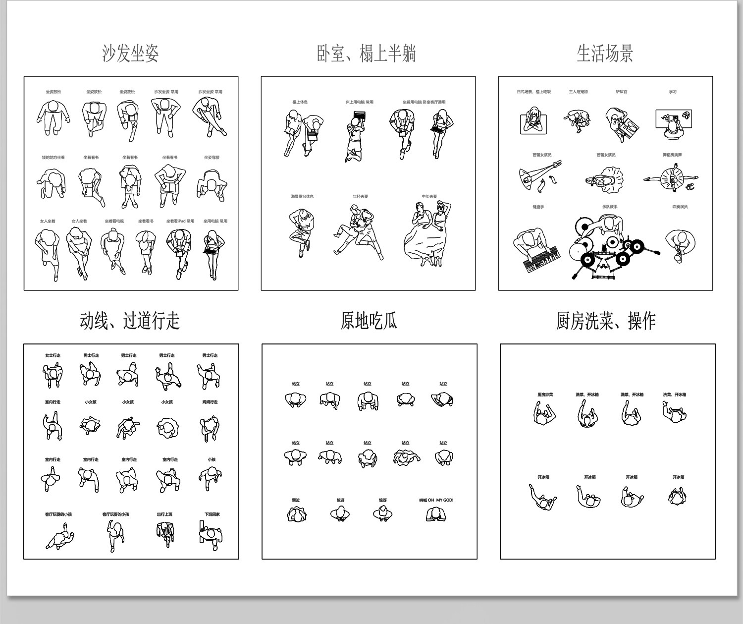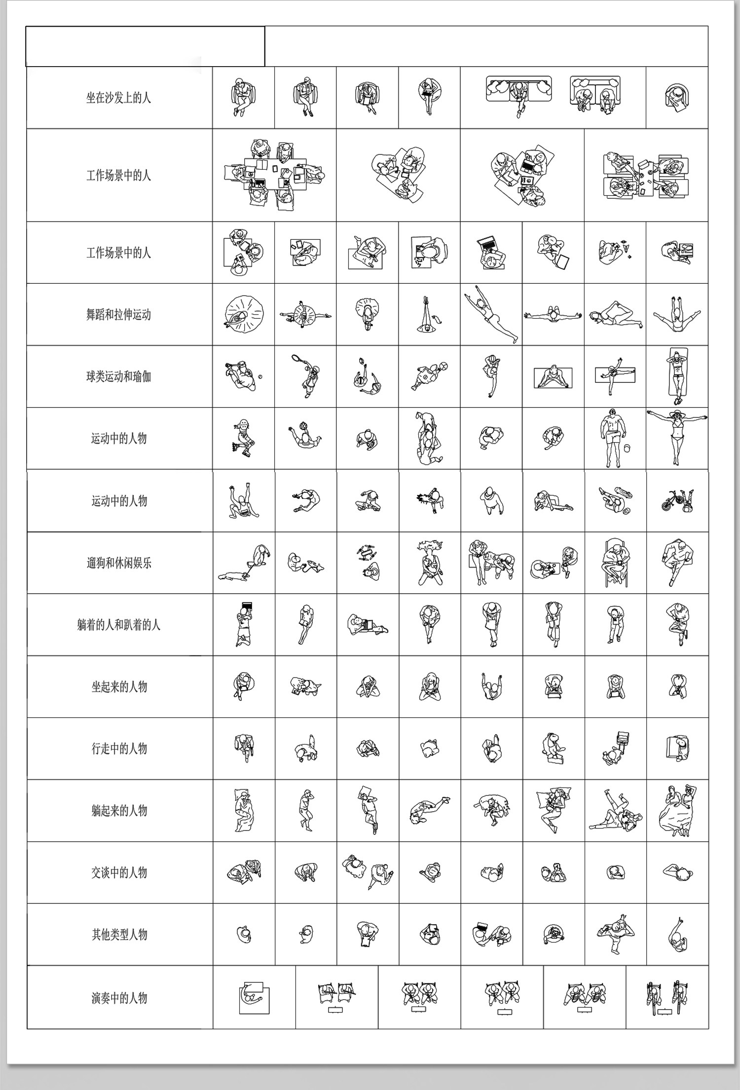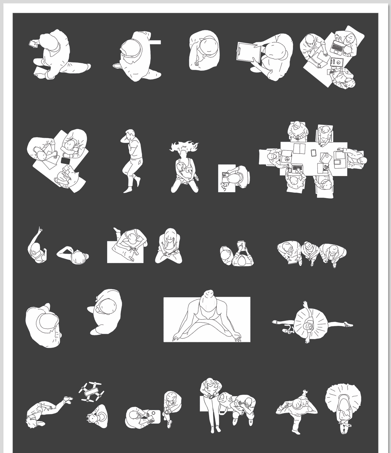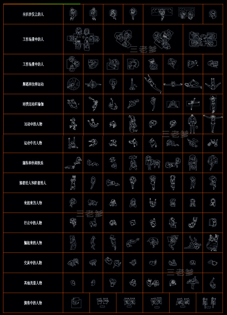人物俯视顶视CAD图库图块站坐人体动作素材运动线稿dwg模块素材