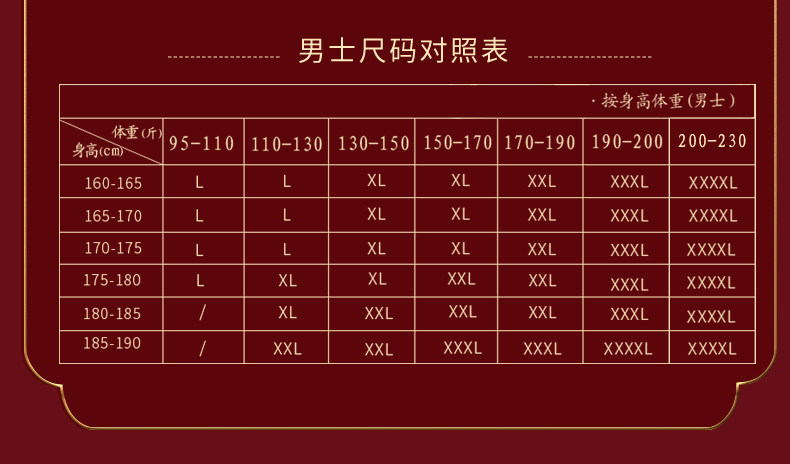 China (cm) 165 / 88-90 170 / 96-98 175 / 108-110 180 / 118-122 185 / 126-130