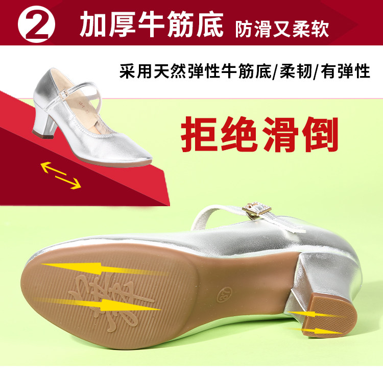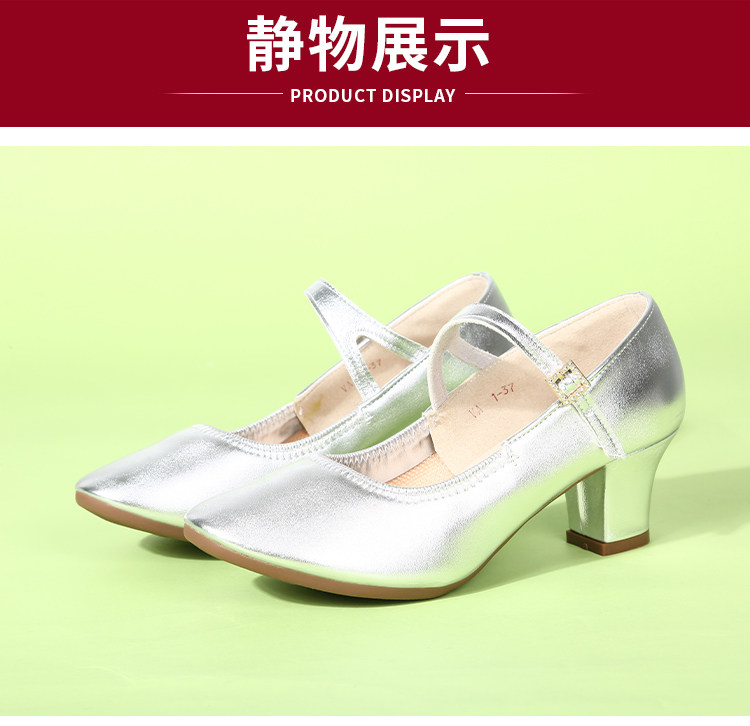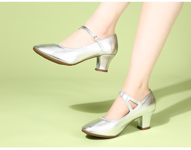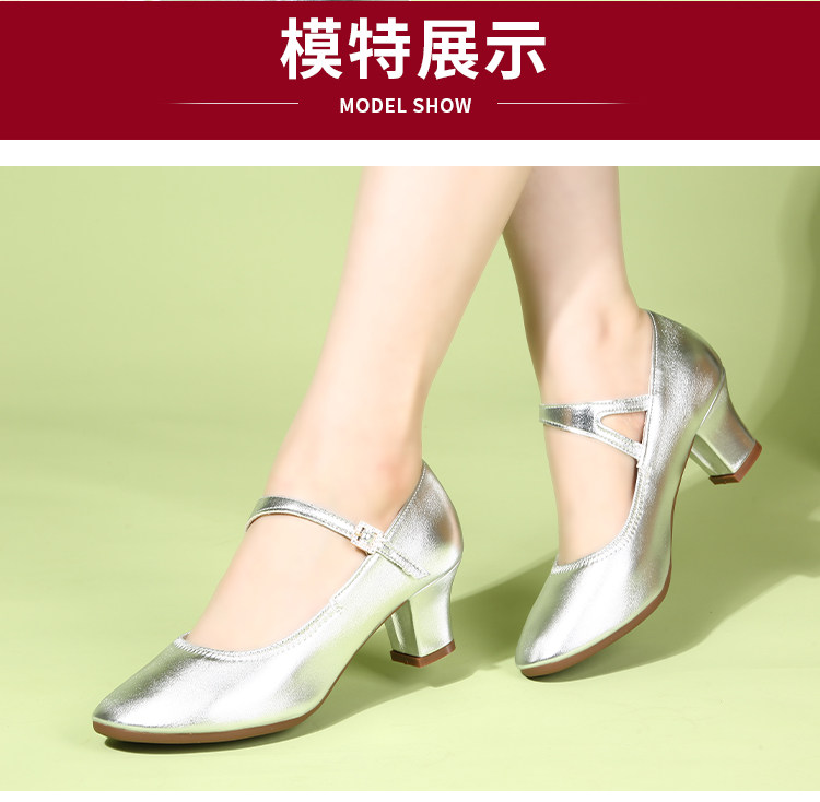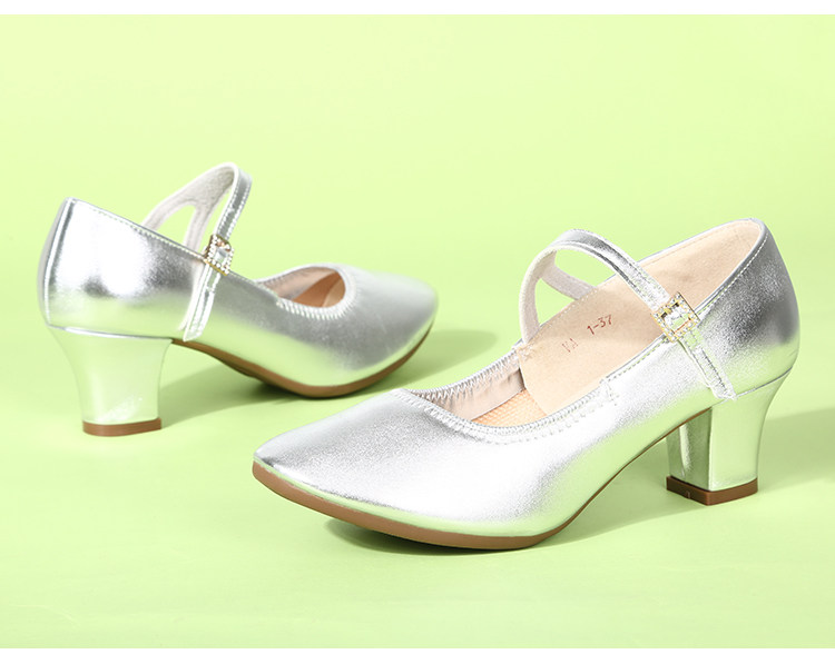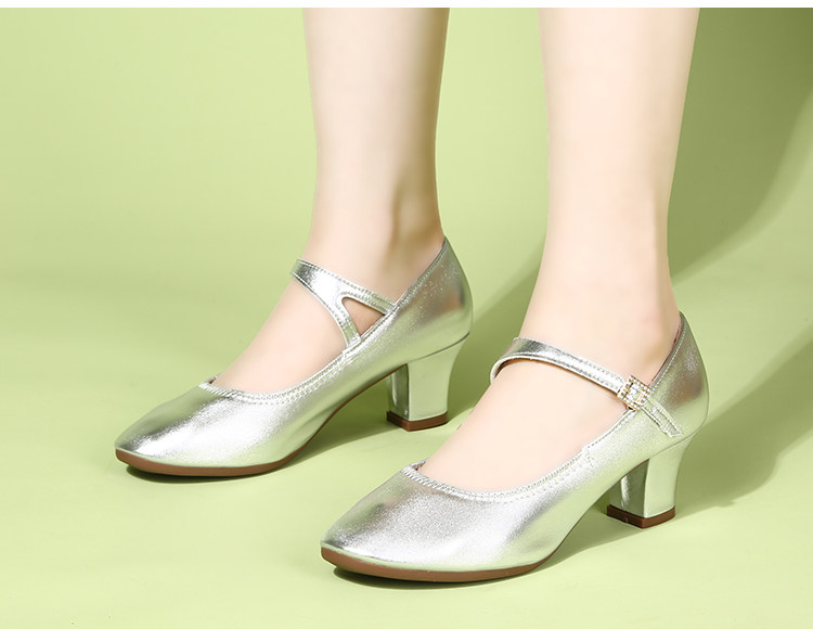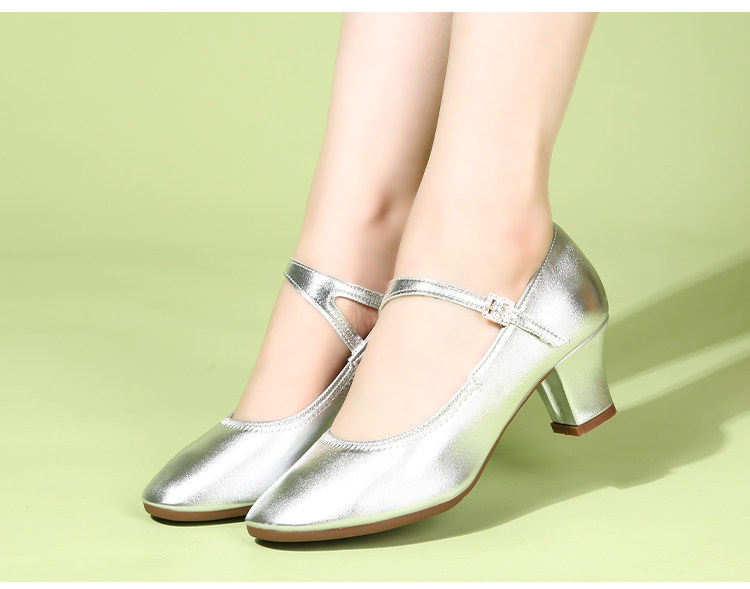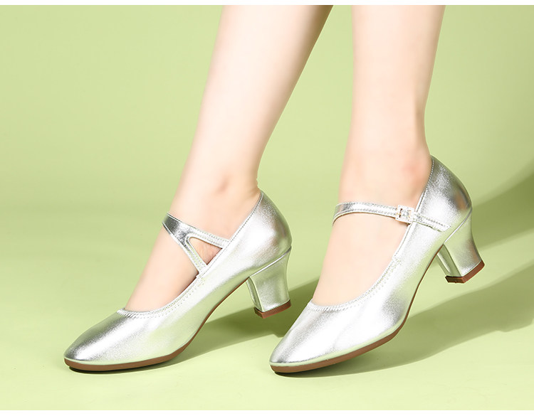 Genuine Leather Silver-Gray Women's Performance Shoes, Square Dance Shoes, Double-Row Buckle Performance Shoes, Cheongsam Model Chunky Heel Single Shoes