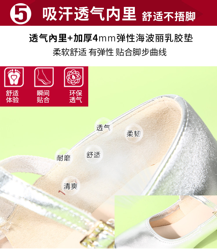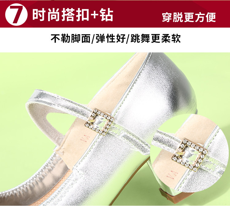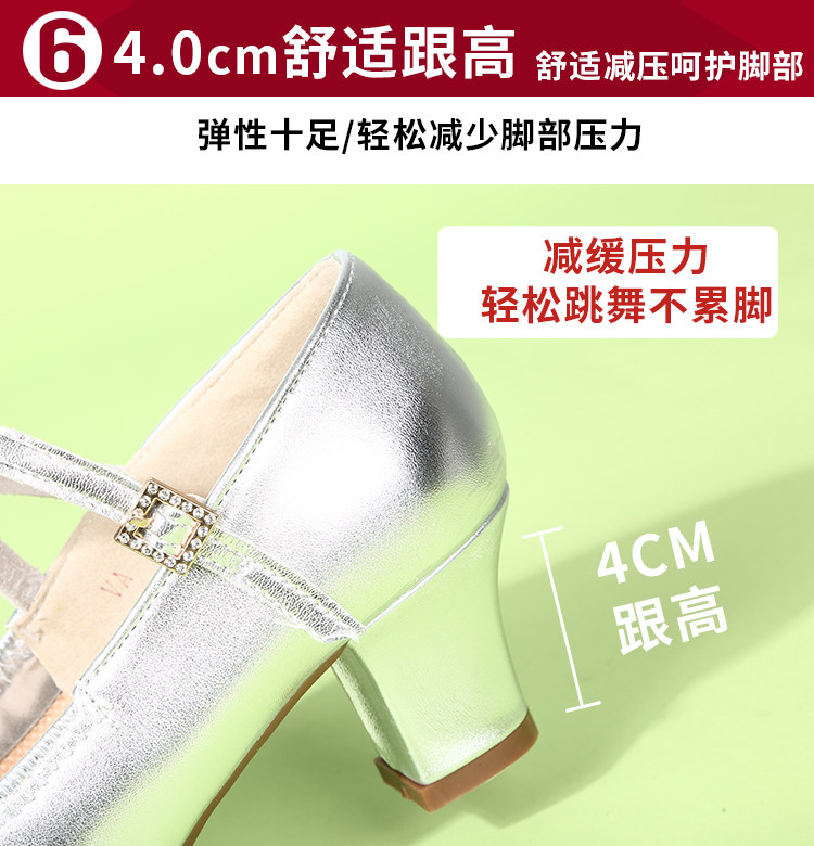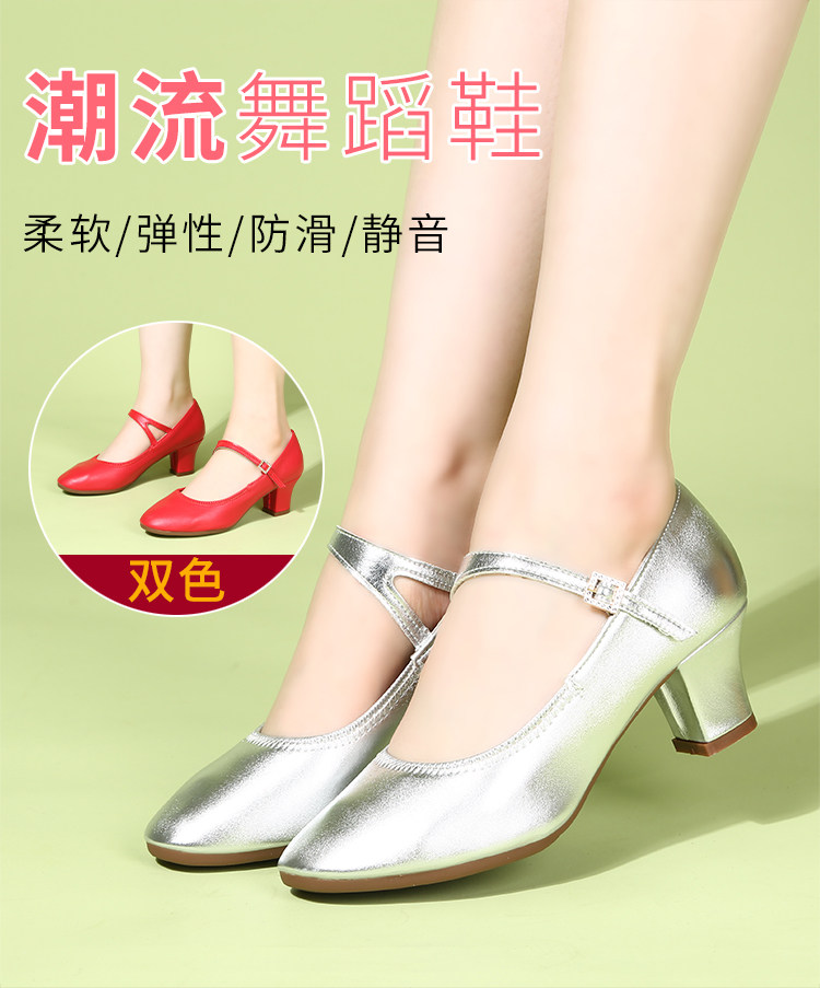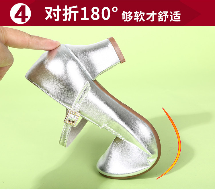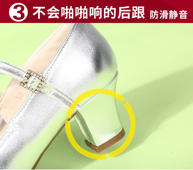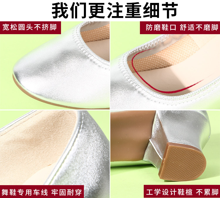 Genuine Leather Silver-Gray Women's Performance Shoes, Square Dance Shoes, Double-Row Buckle Performance Shoes, Cheongsam Model Chunky Heel Single Shoes