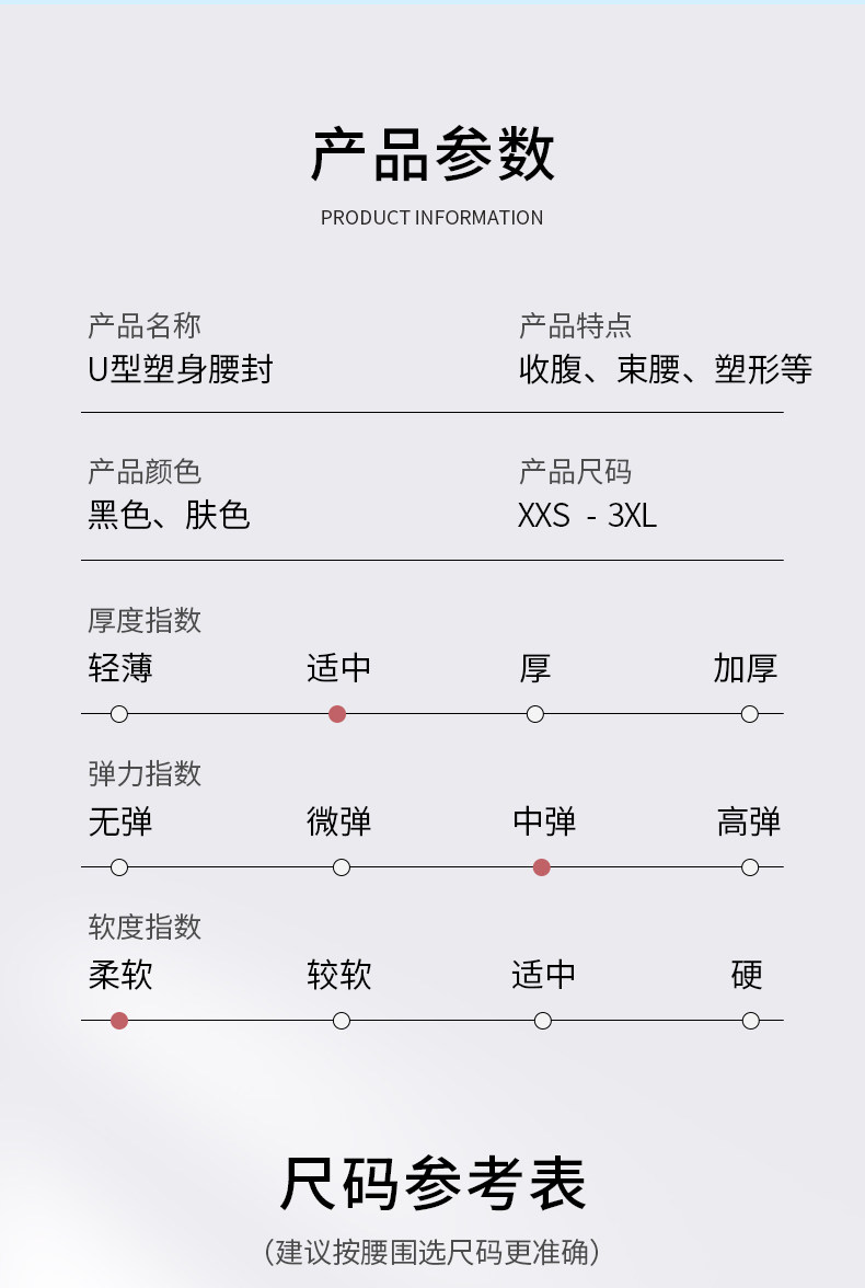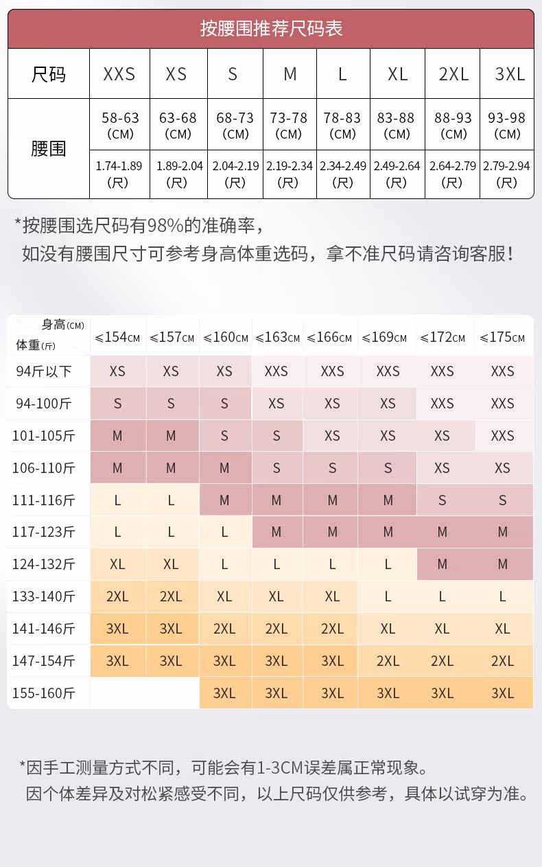 尺码 按腰围选尺码更准或咨询在线客服,XXS(建议75-94斤)腰围(58-63cm),XS(建议95-100斤)腰围(63-68cm),S(建议101-110斤)腰围(68-73cm),M(建议111-120斤)腰围(73-78cm),L(建议121-130斤)腰围(78-83cm),XL(建议131-140斤)腰围(83-88cm),XXL(建议141-150斤)腰围(88-93cm),3XL(建议151-160斤)腰围(83-98cm)