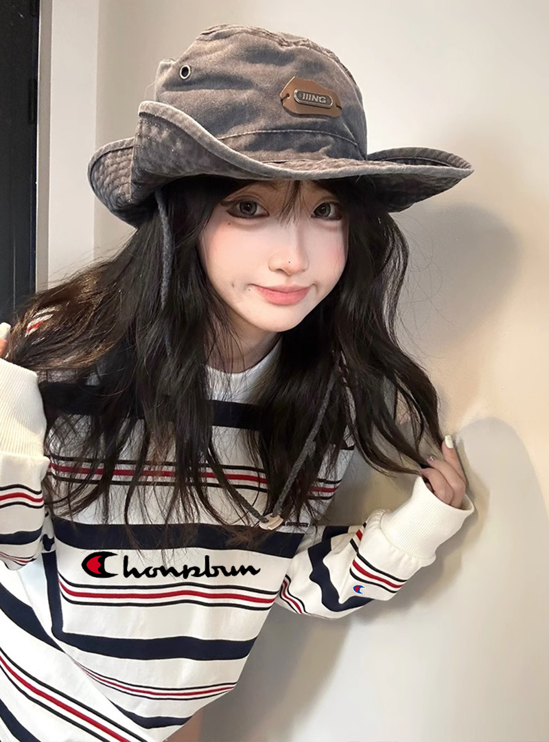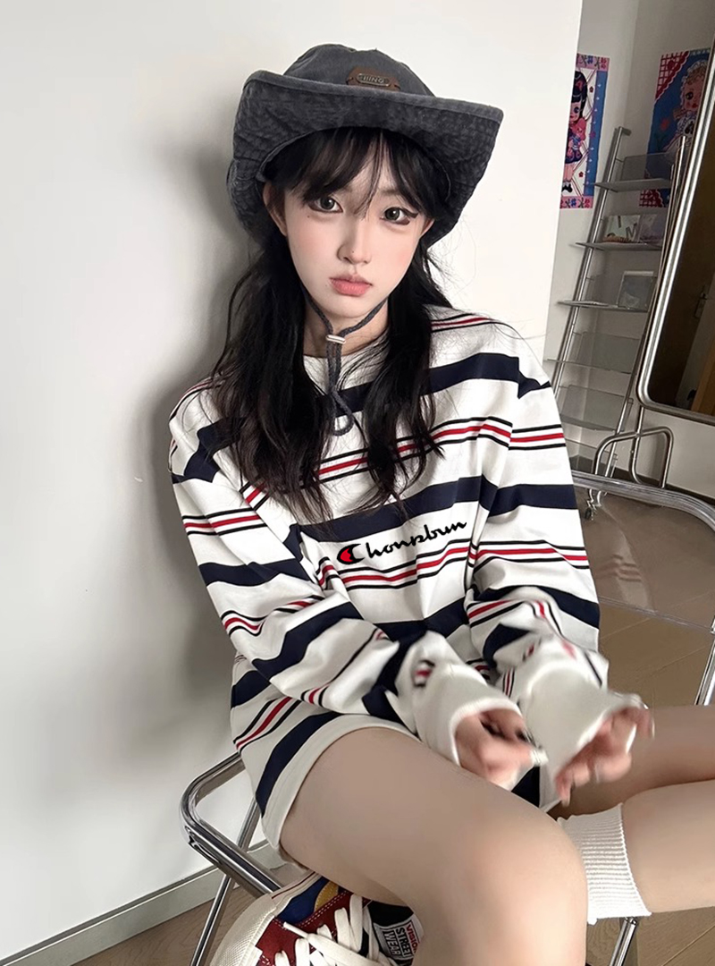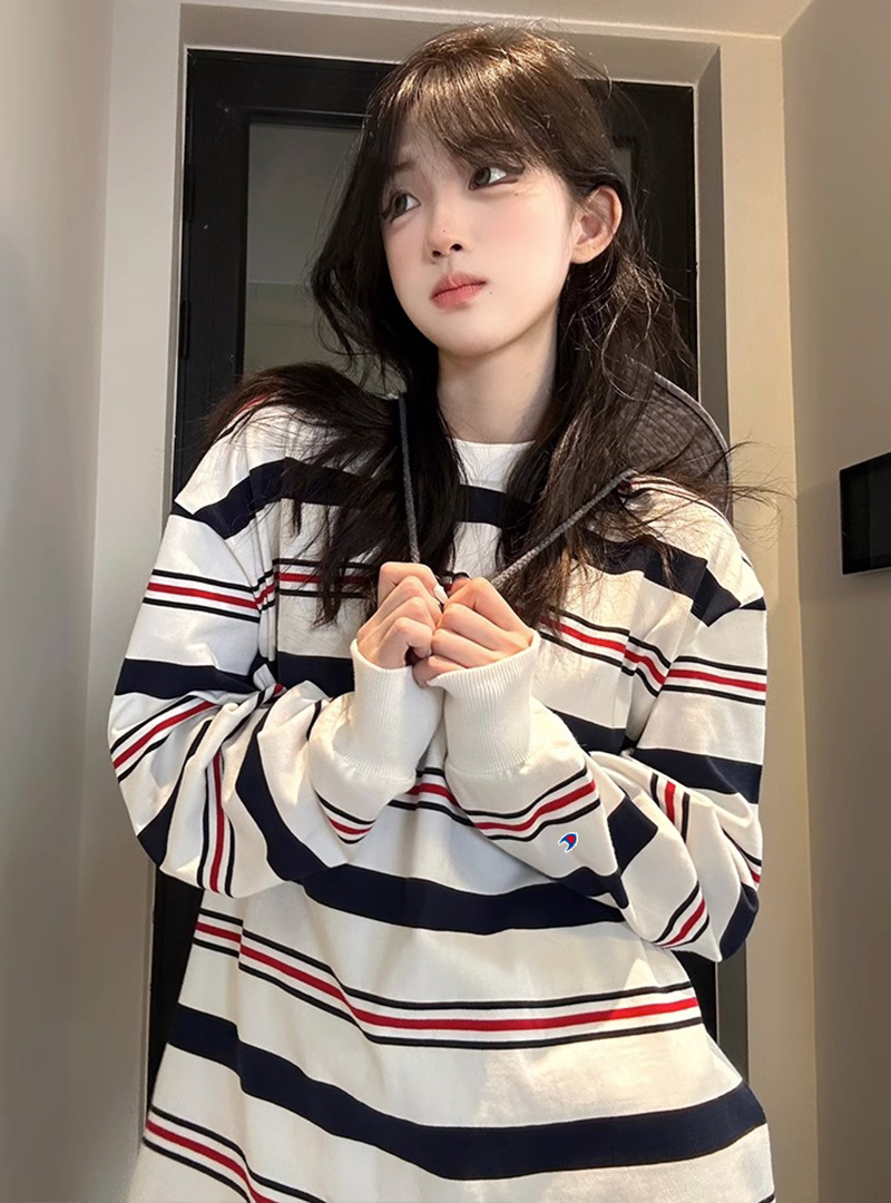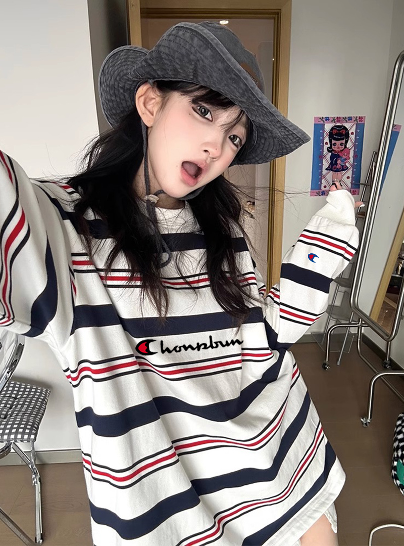 冠军彩虹撞色条纹长袖卫衣女春秋宽松oversize学院风纯棉t恤上衣