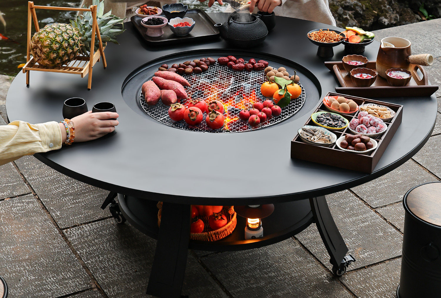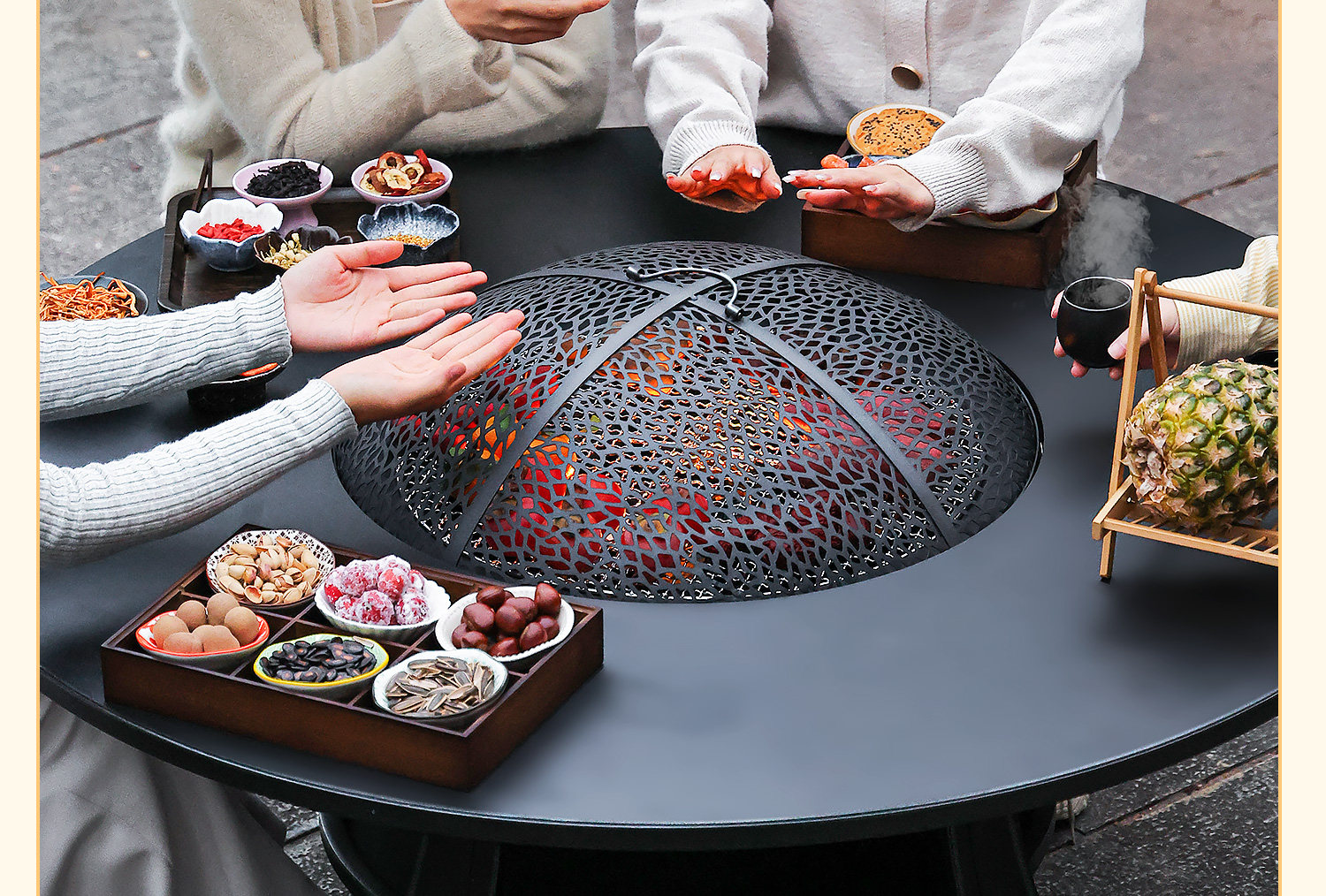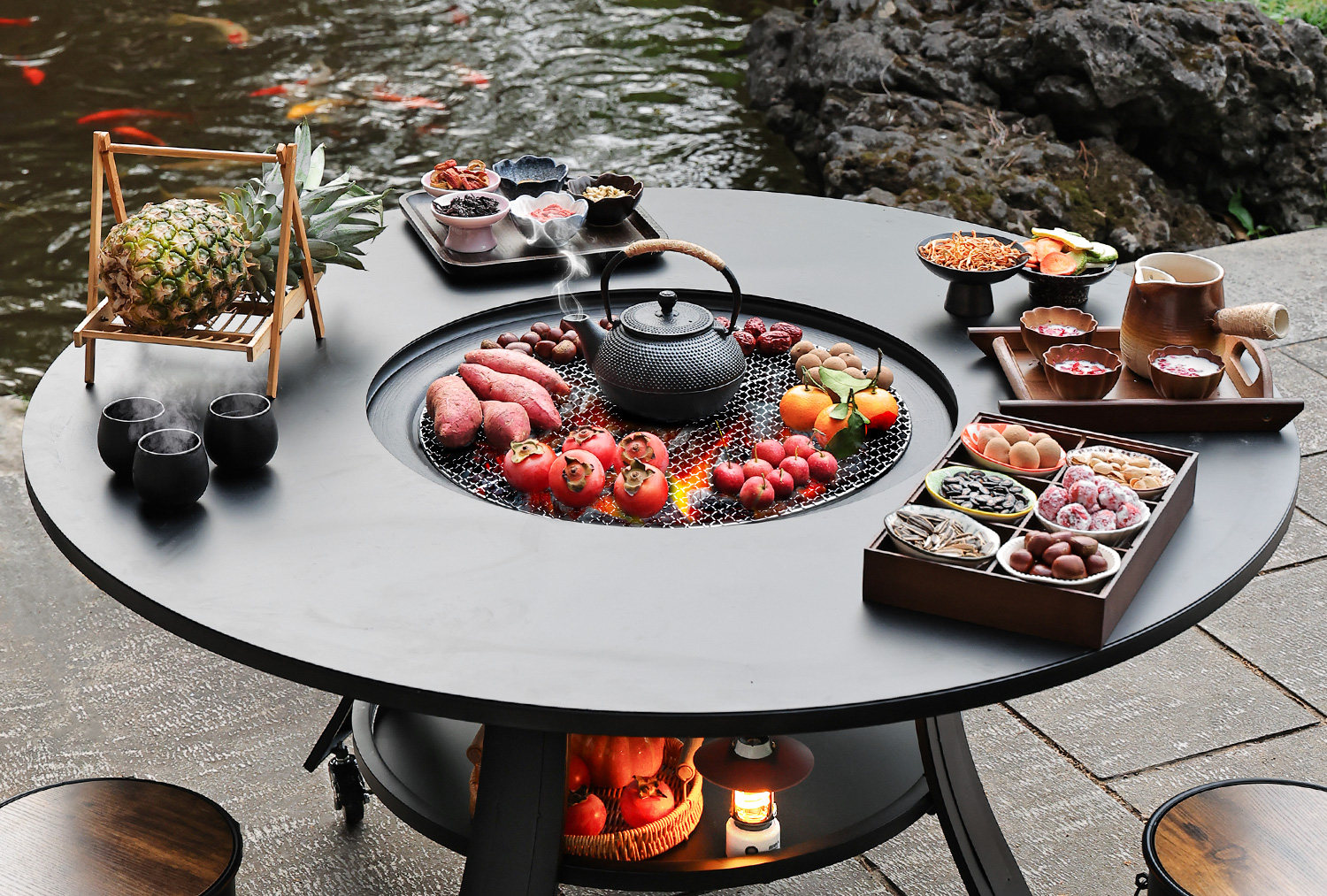 Cocinar té alrededor de la estufa, juego de estufa para asar en el interior del hogar, juego completo de electrodomésticos, reunirse alrededor de la estufa de barbacoa del patio en invierno para calentar la mesa
