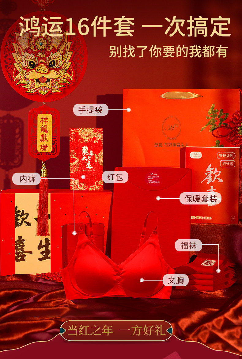 红色内衣内裤本命年女2024龙年套装无钢圈文胸背心袜子新年礼物盒