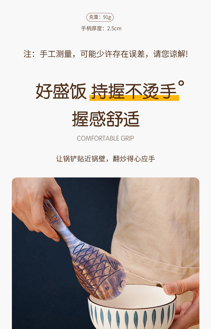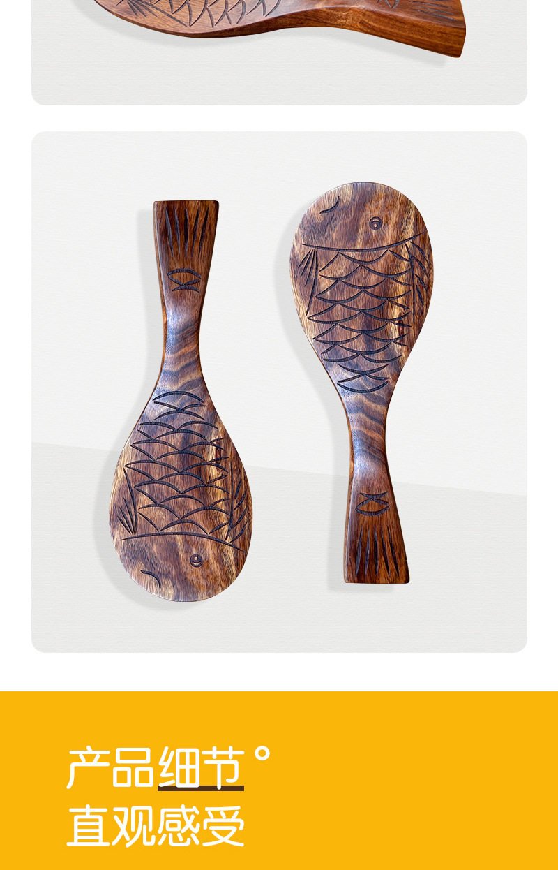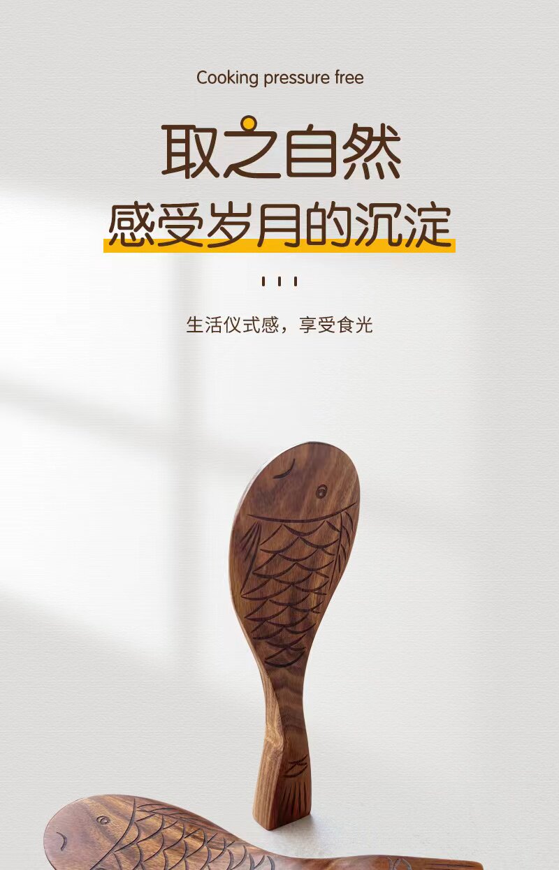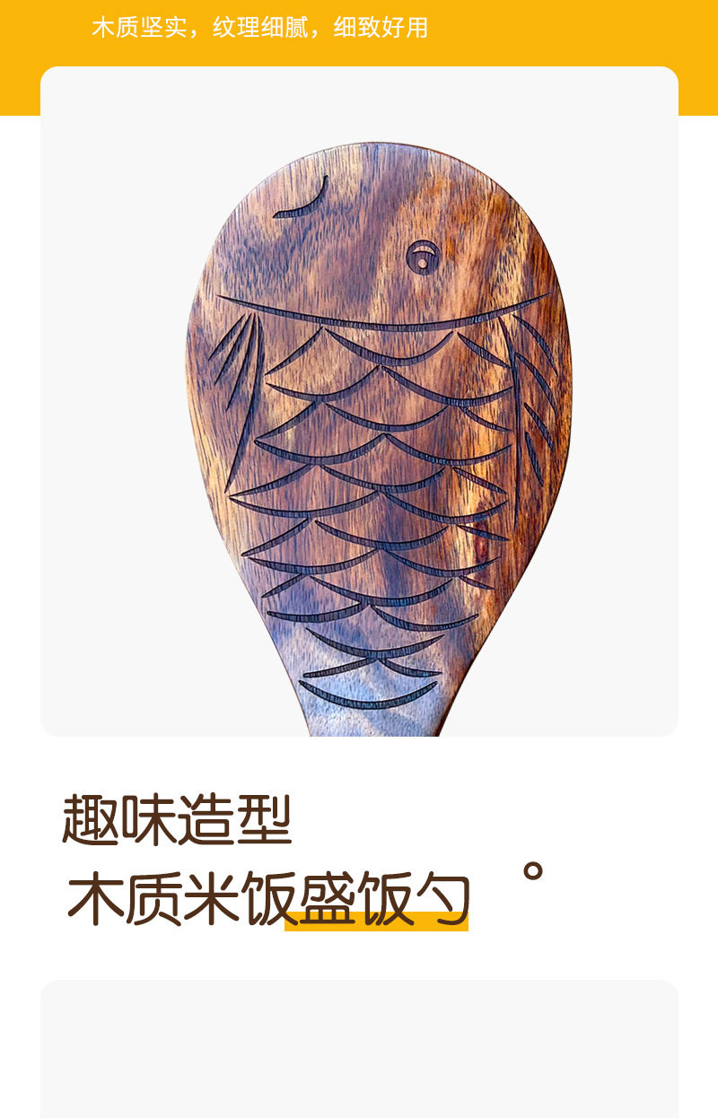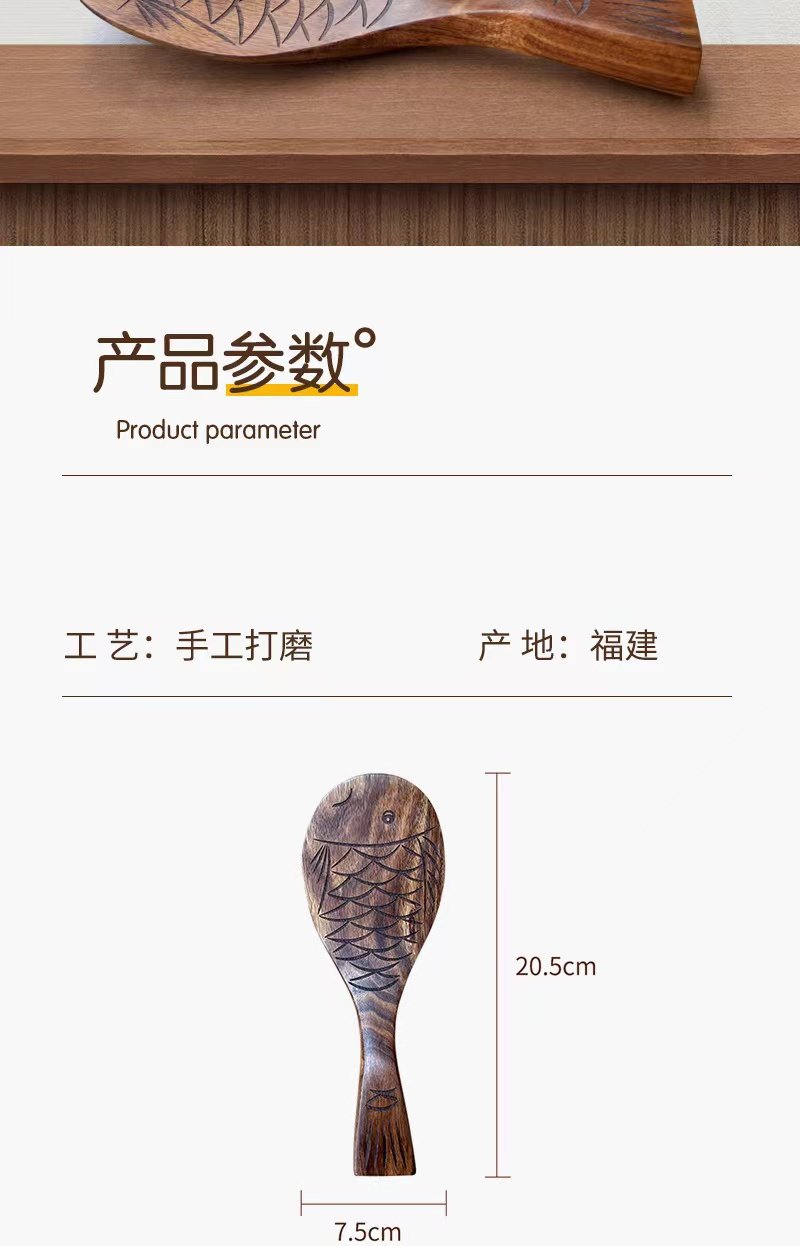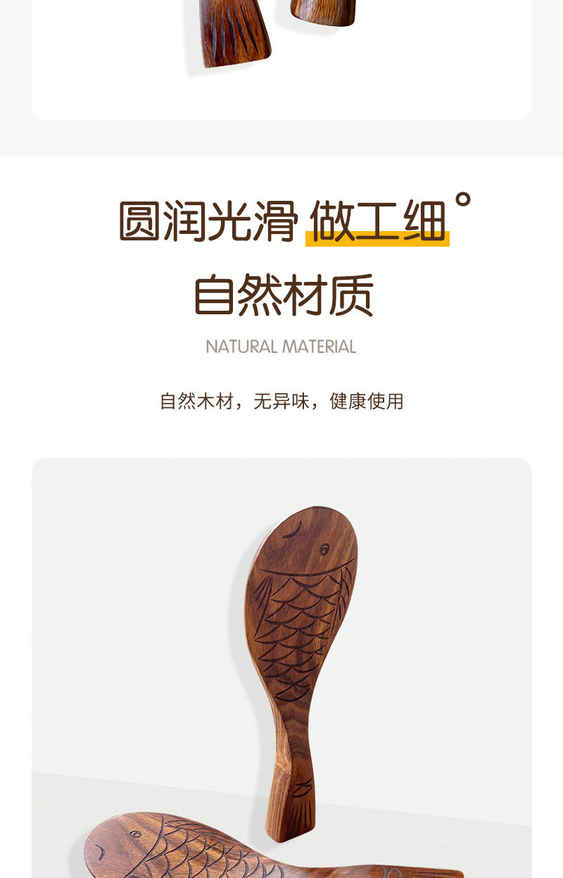 Creative Natural Teak Wood Unpainted Solid Wood Fish-Shaped Small Rice Spoon, Thickened and Can Stand, Rice Serving Spoon, Rice Cooker Spoon, Household Spoon
