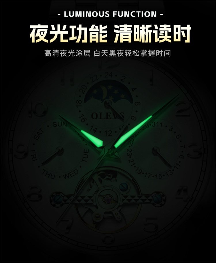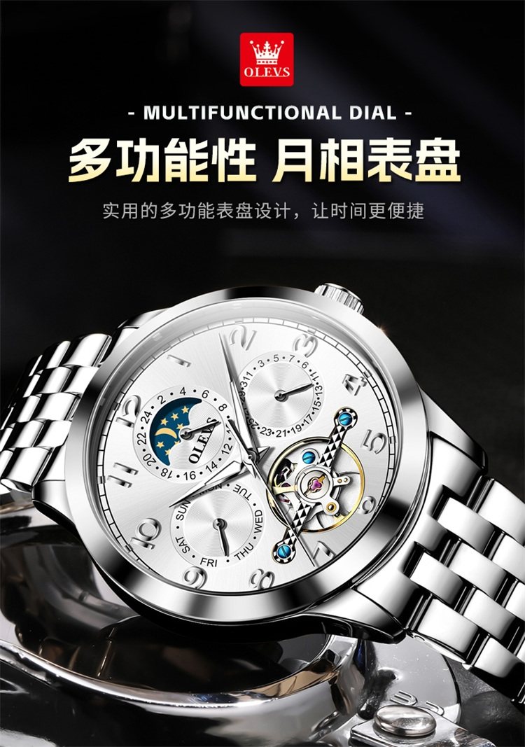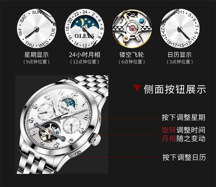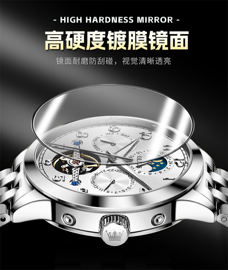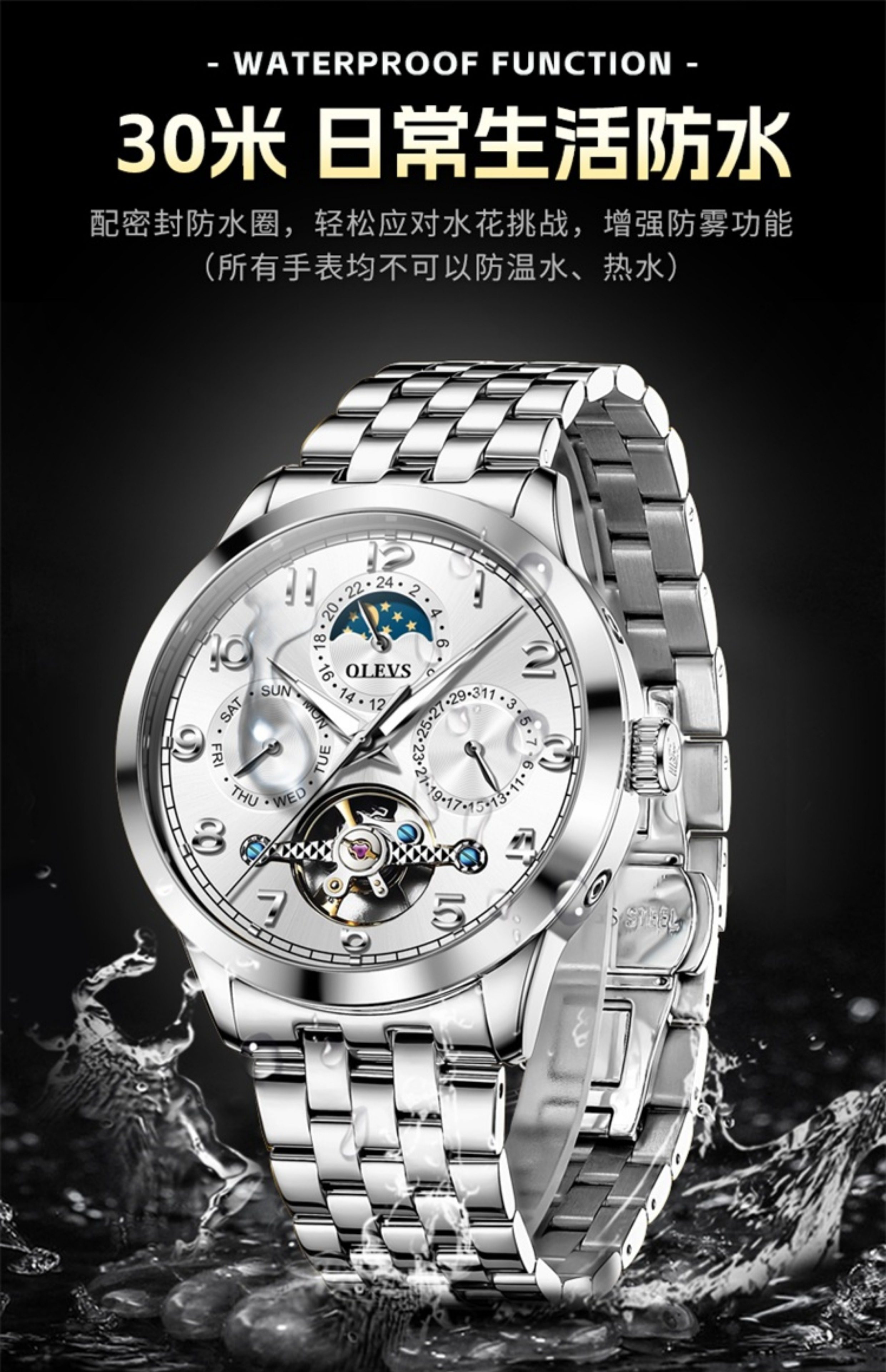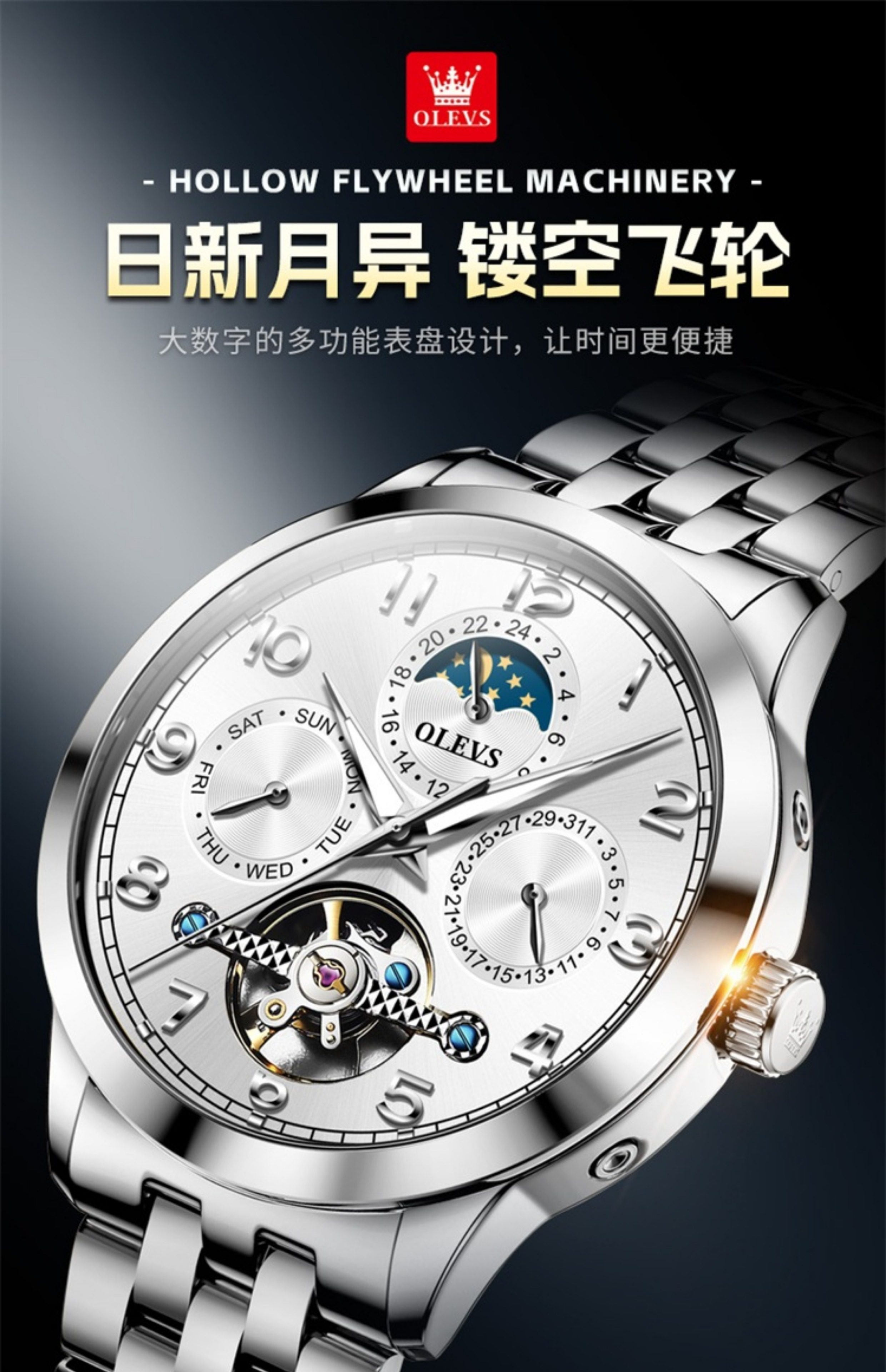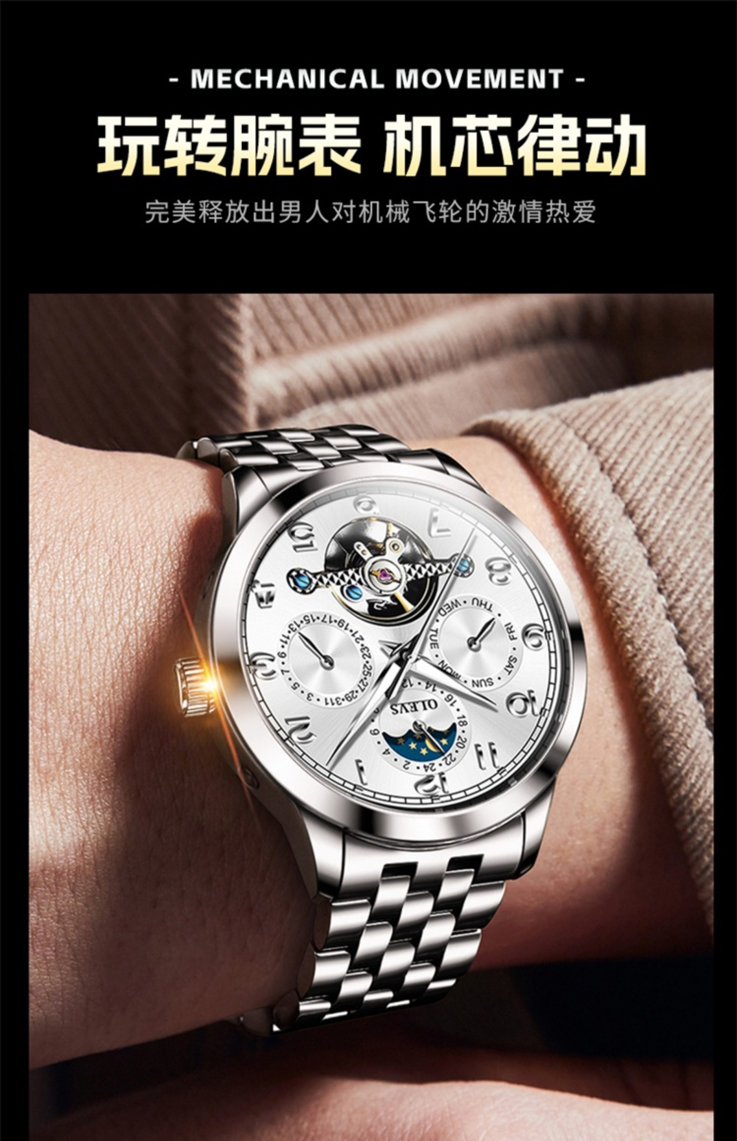 瑞士欧利时全自动纯机械手表男数字款钢带镂空陀飞轮腕表月相男表