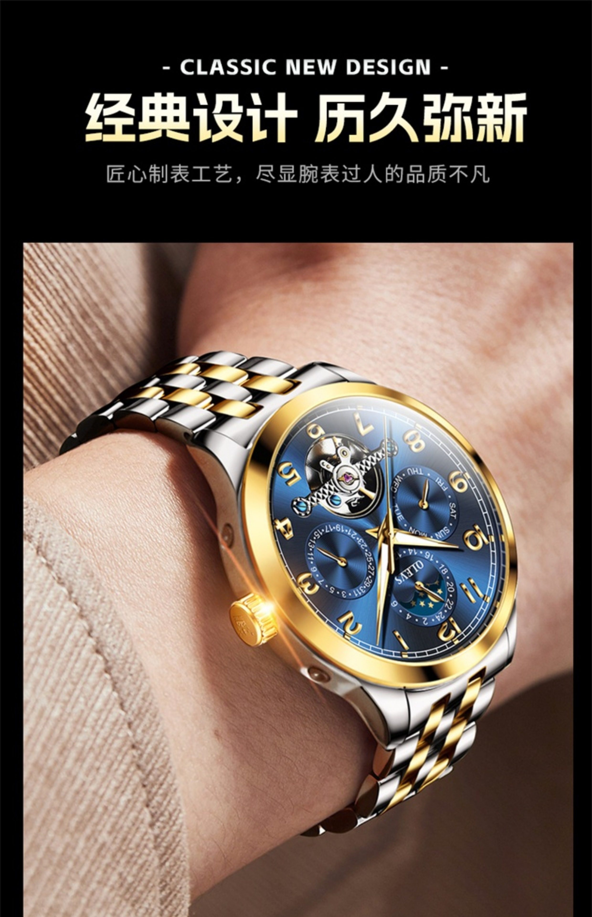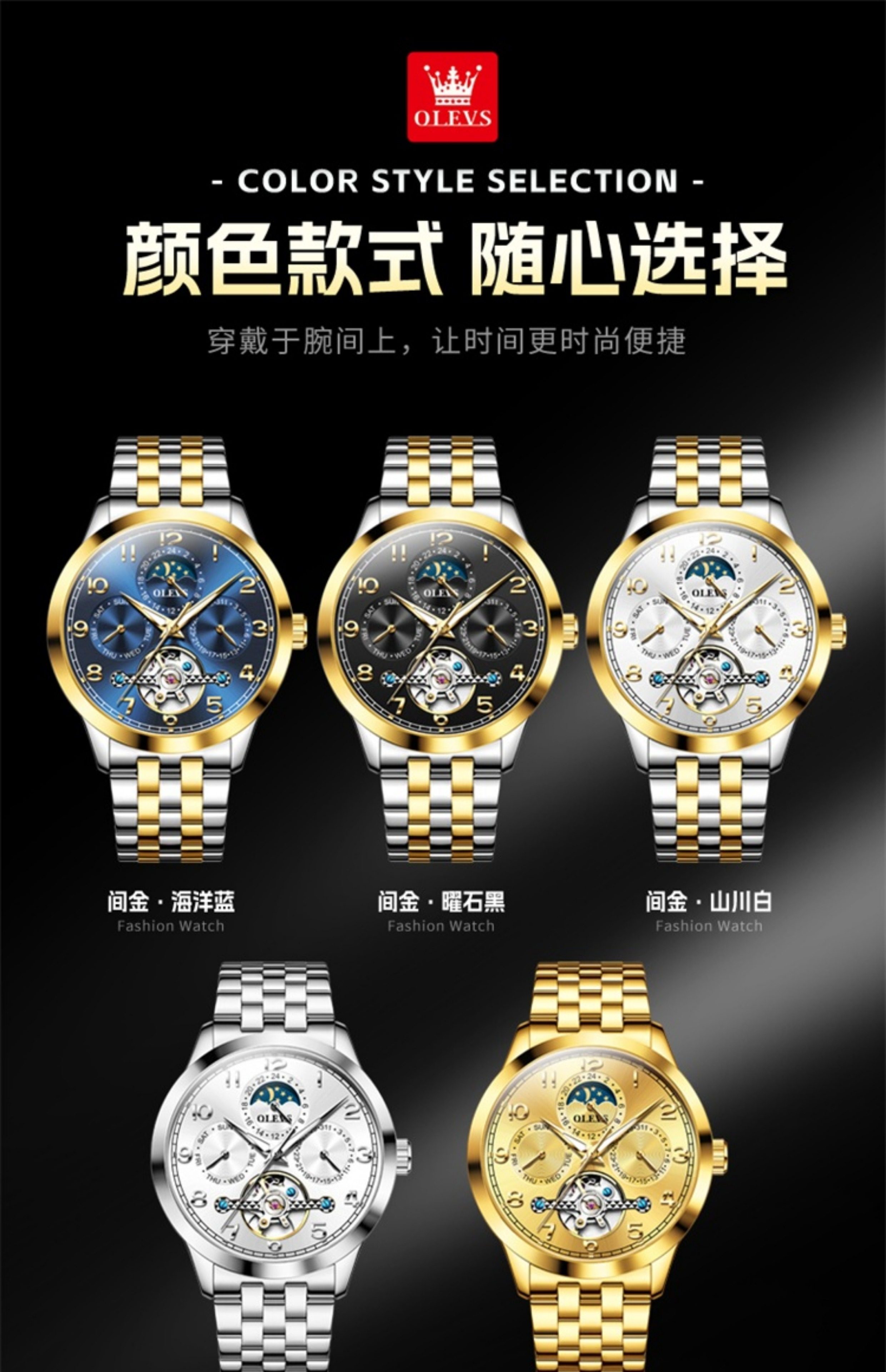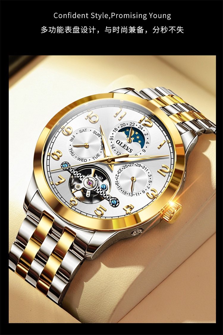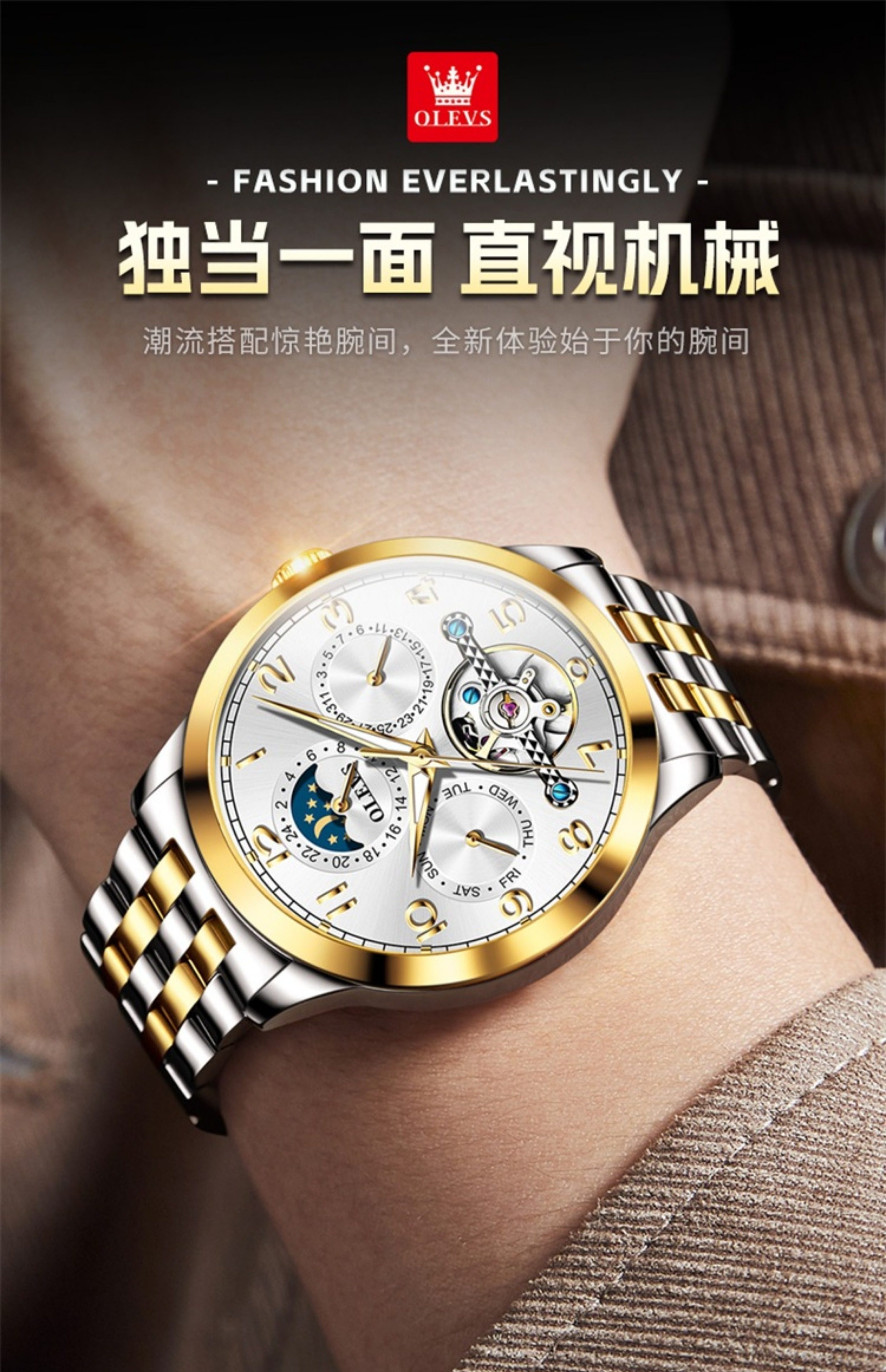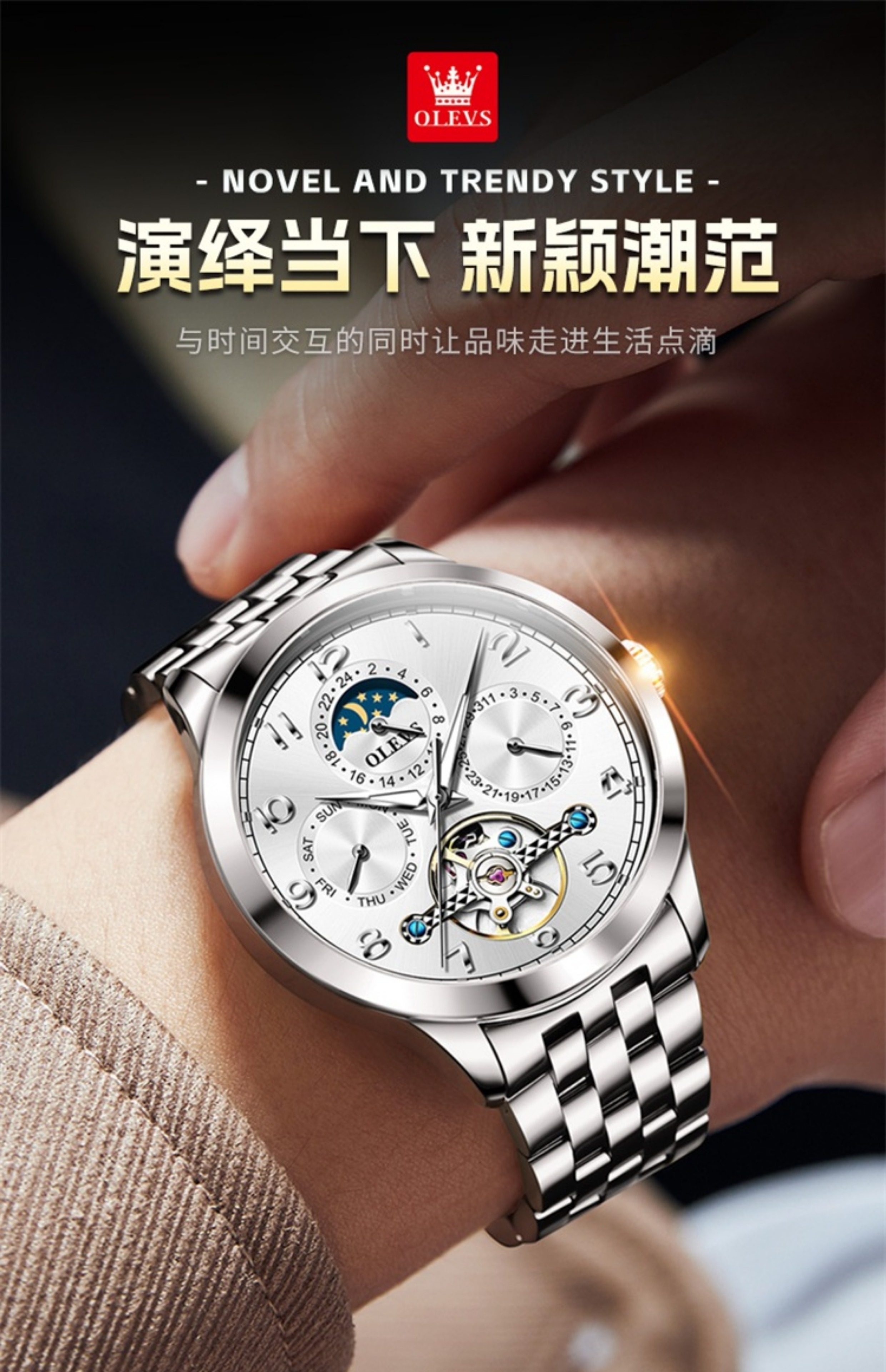 瑞士欧利时全自动纯机械手表男数字款钢带镂空陀飞轮腕表月相男表