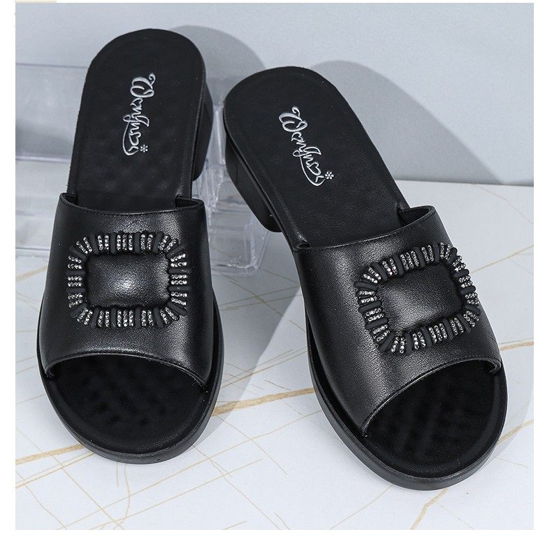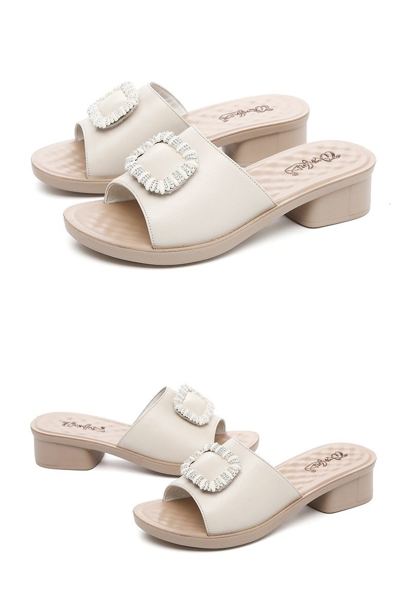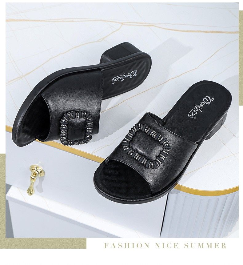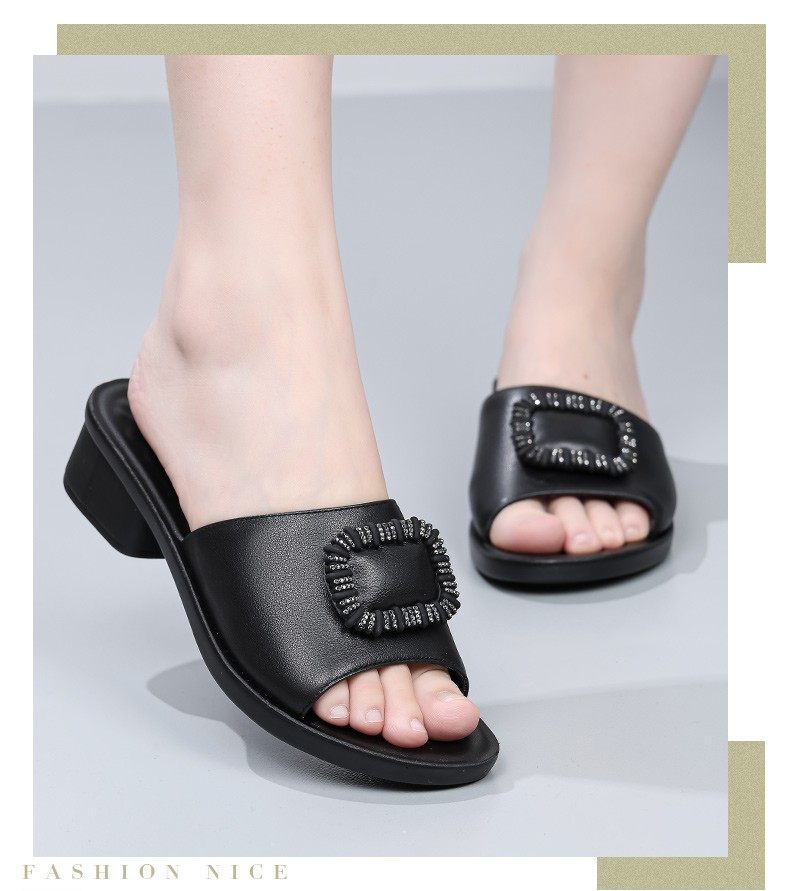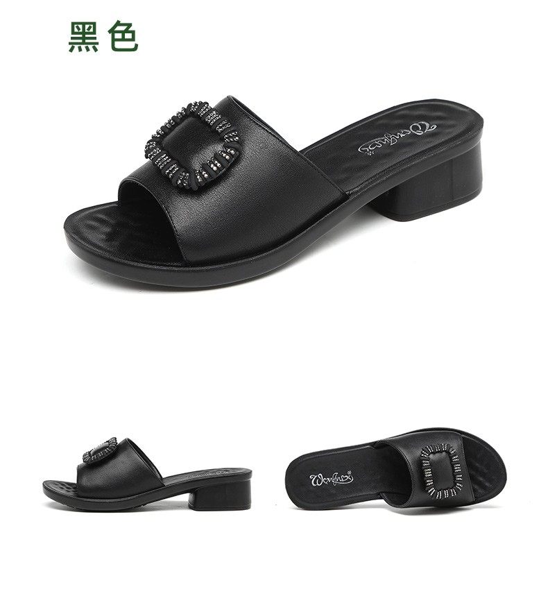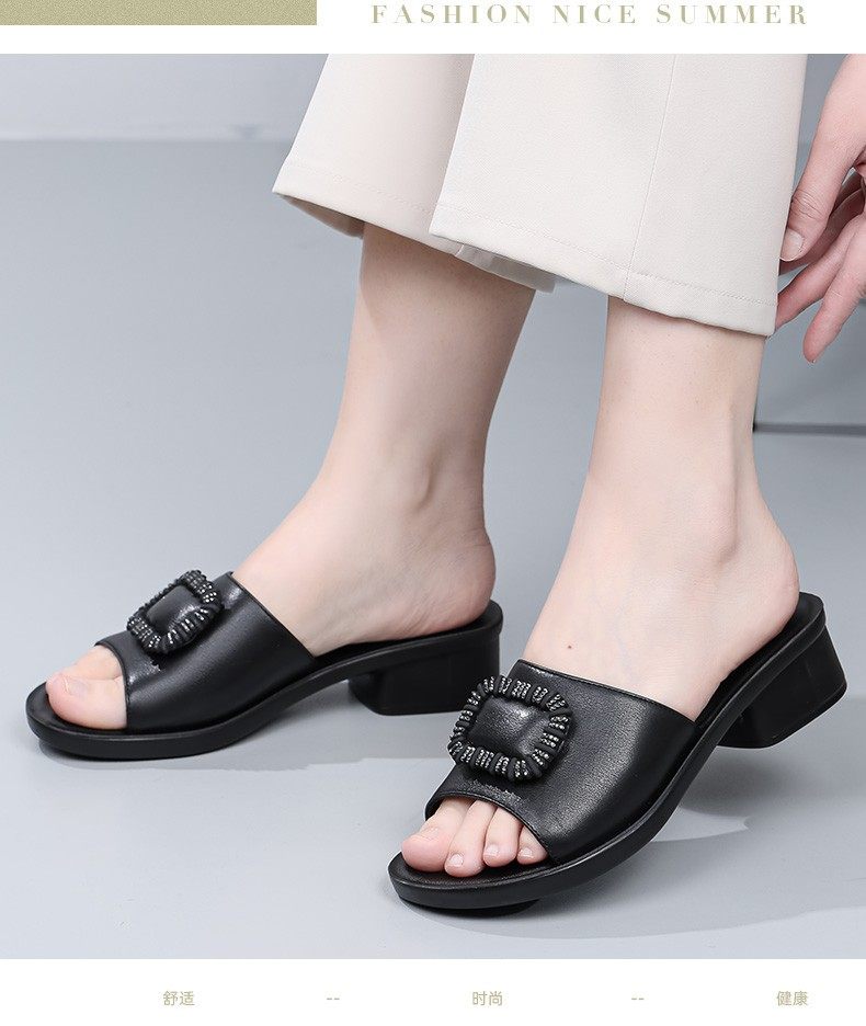 Genuine Leather Slippers for Women, Summer Mom Slippers, Thick Heels, Middle-Aged Sandals, Women's Soft Soles, Medium Heels, Women's Slippers
