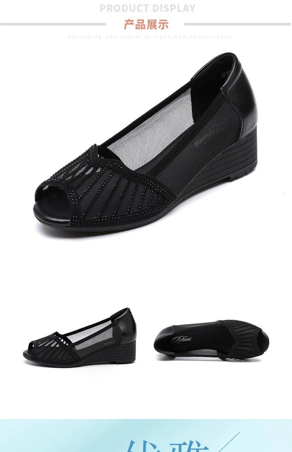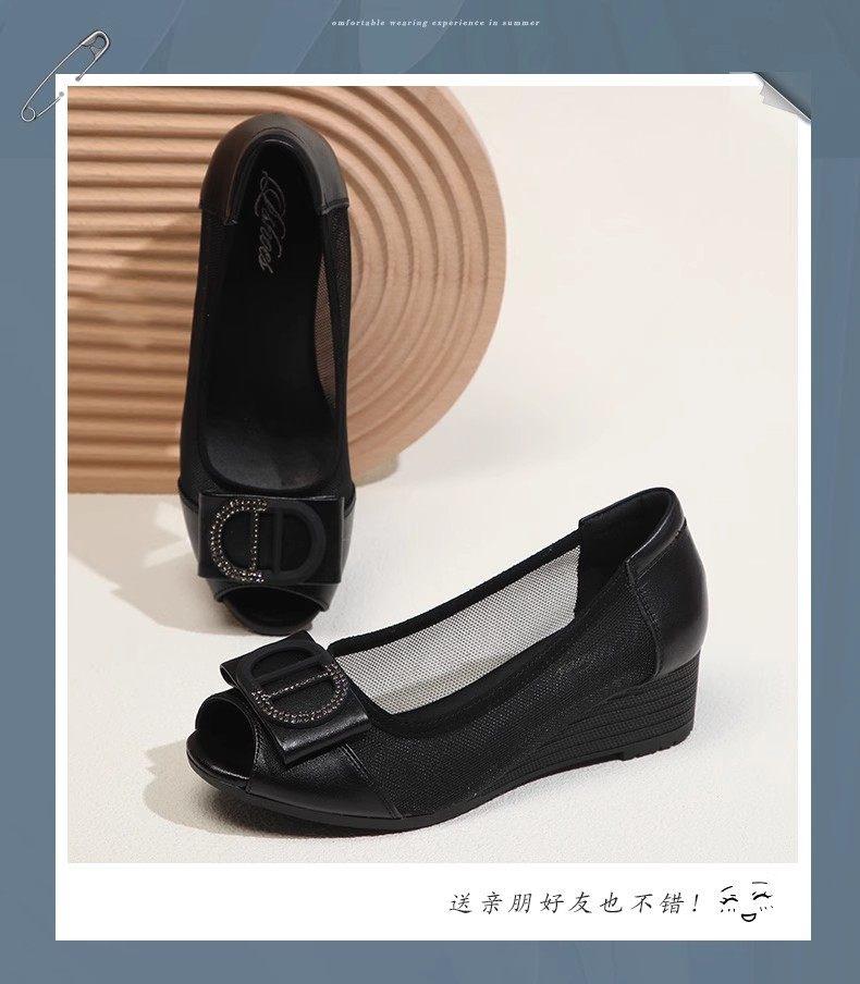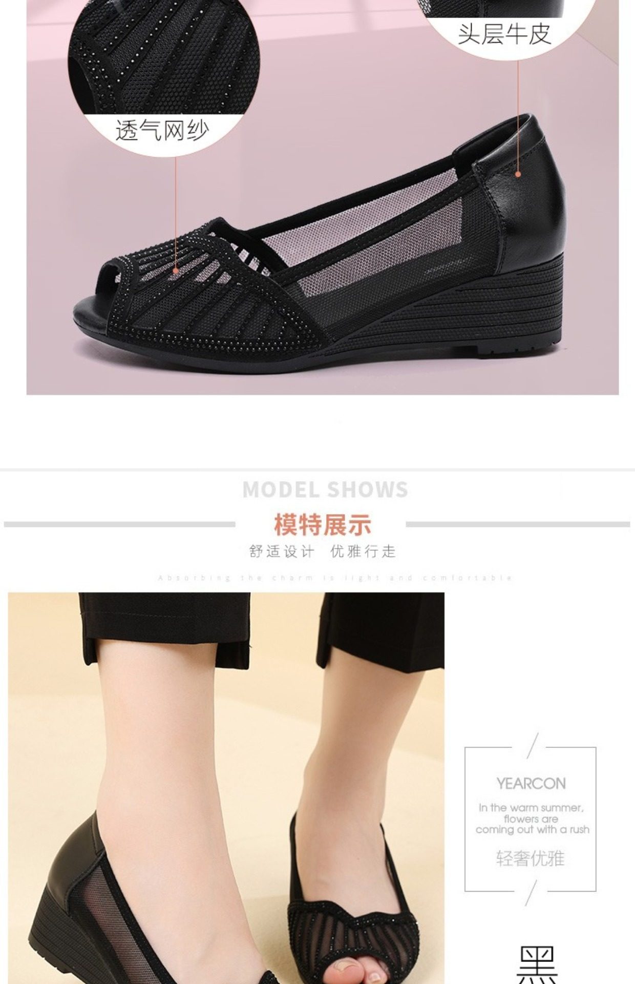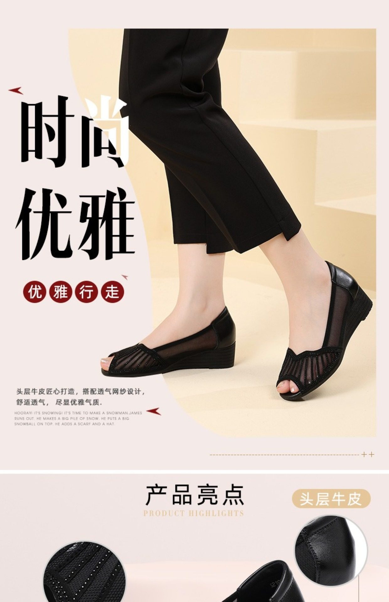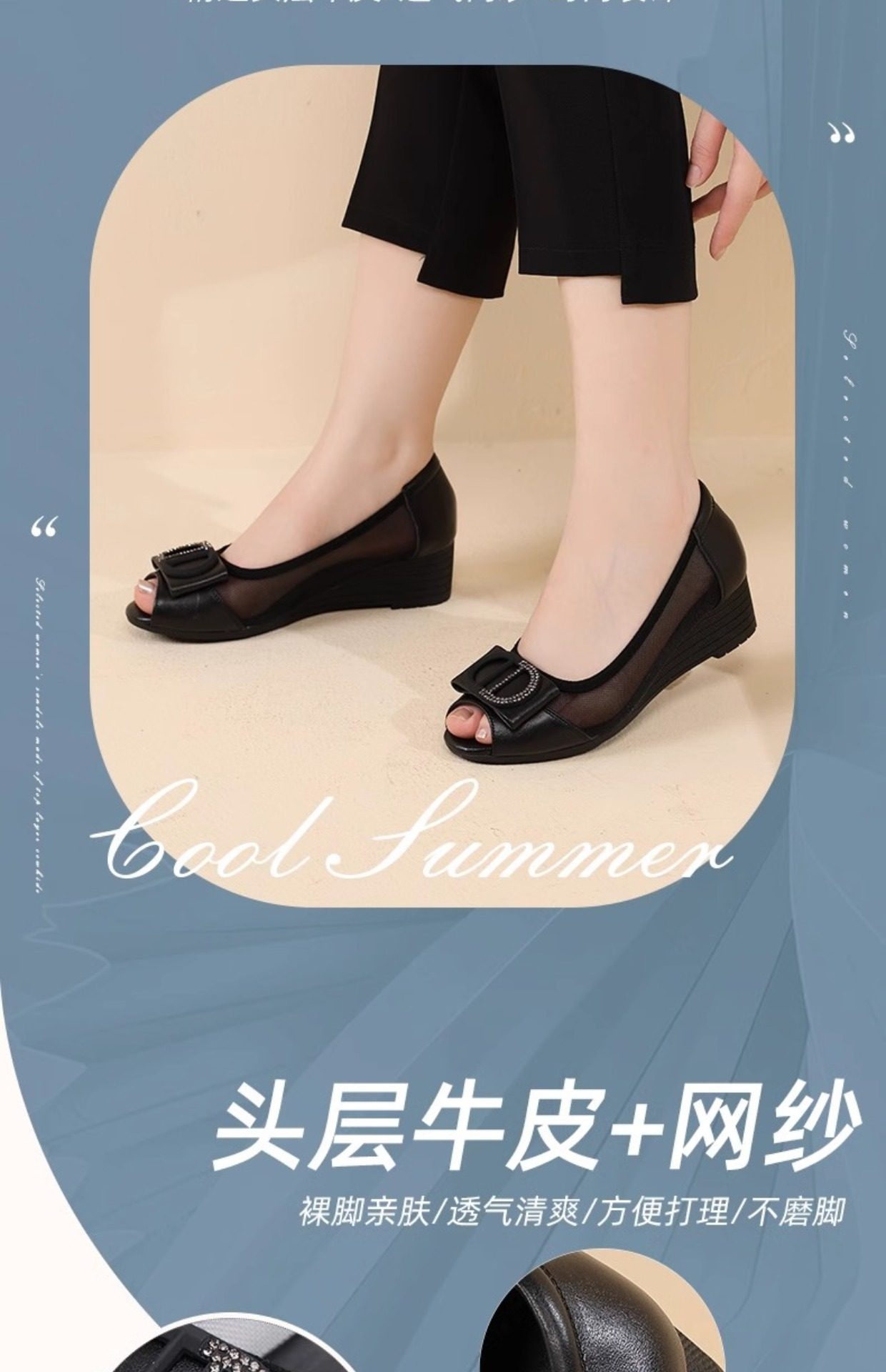 Fish Mouth Sandals for Women, Summer Mesh Mom Shoes, Breathable Genuine Leather Soft Sole Wedge Heels, Fashionable Women's Shoes, Comfortable and Breathable for the Elderly