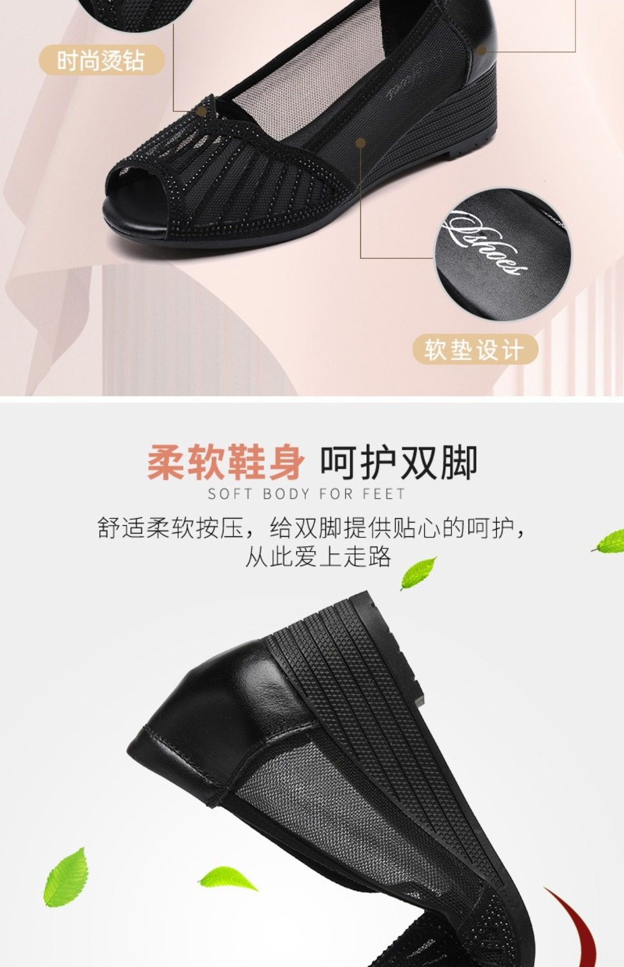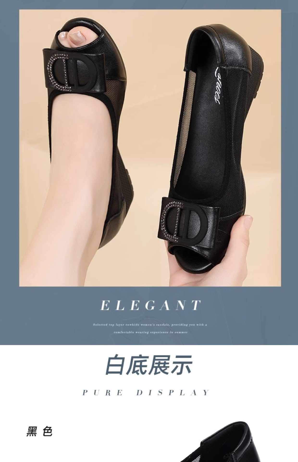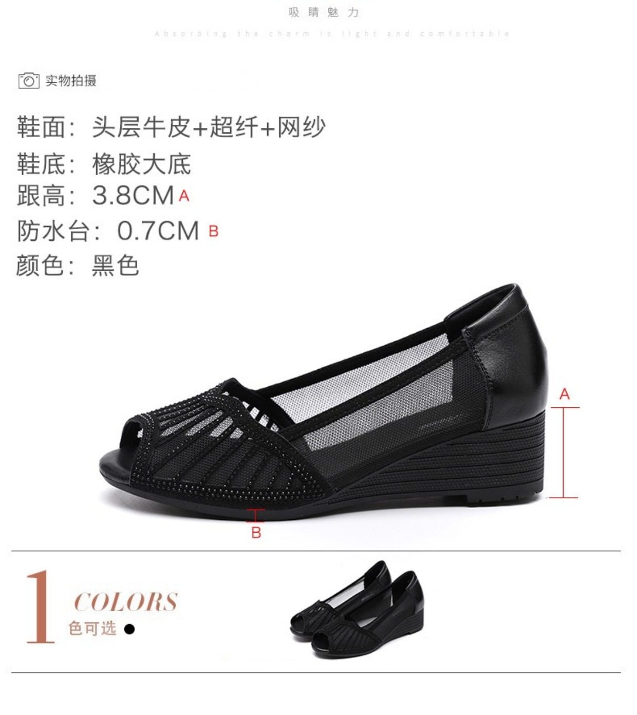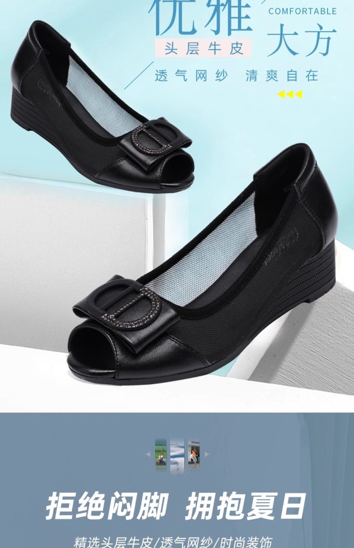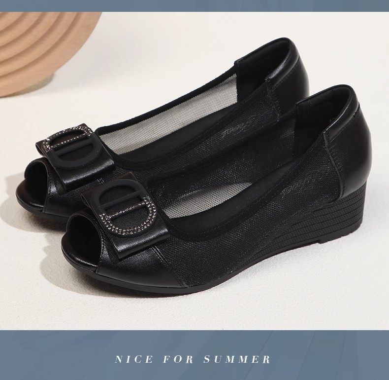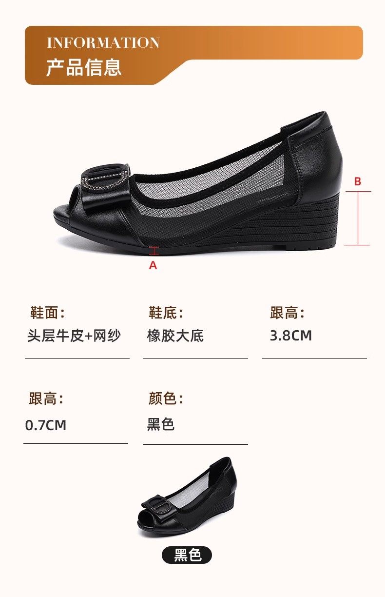 Fish Mouth Sandals for Women, Summer Mesh Mom Shoes, Breathable Genuine Leather Soft Sole Wedge Heels, Fashionable Women's Shoes, Comfortable and Breathable for the Elderly