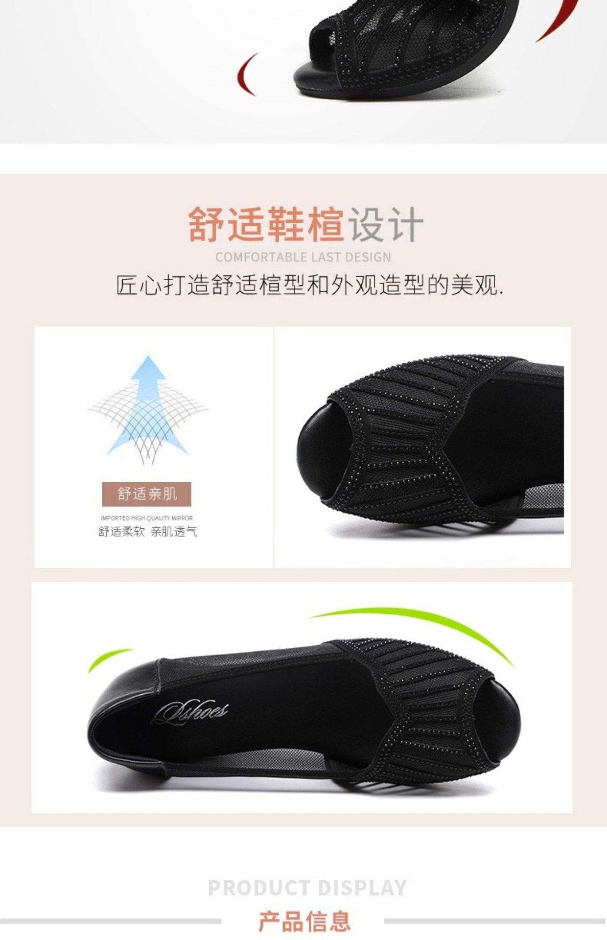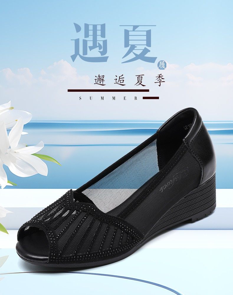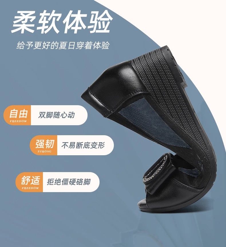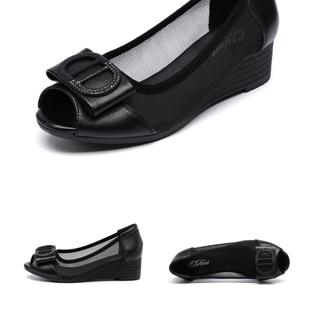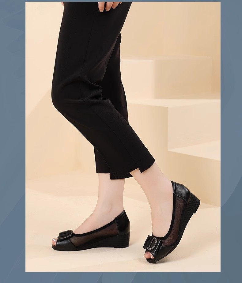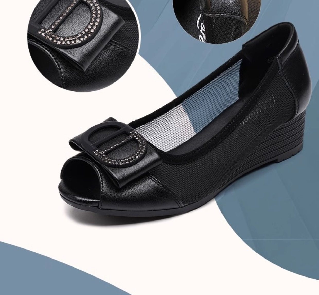 Fish Mouth Sandals for Women, Summer Mesh Mom Shoes, Breathable Genuine Leather Soft Sole Wedge Heels, Fashionable Women's Shoes, Comfortable and Breathable for the Elderly