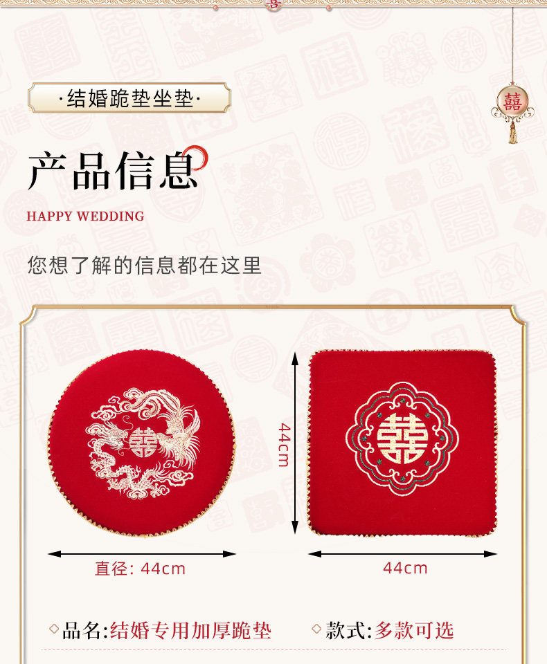 颜色分类 【方形】龙凤呈祥-跪坐喜垫1对,【方形】天赐良缘-跪坐喜垫1对,【方形】双喜盈门-跪坐喜垫1对,【方形】吾家有喜-跪坐喜垫1对,【方形】五福临门-跪坐喜垫1对,【方形】喜结良缘-跪坐喜垫1对,【方形】欢天喜地-跪坐喜垫1对,【圆形】龙凤呈祥-跪坐喜垫1对,【圆形】天赐良缘-跪坐喜垫1对,【圆形】双喜盈门-跪坐喜垫1对,【圆形】吾家有喜-跪坐喜垫1对,【圆形】五福临门-跪坐喜垫1对,【圆形】喜结良缘-跪坐喜垫1对,【圆形】欢天喜地-跪坐喜垫1对