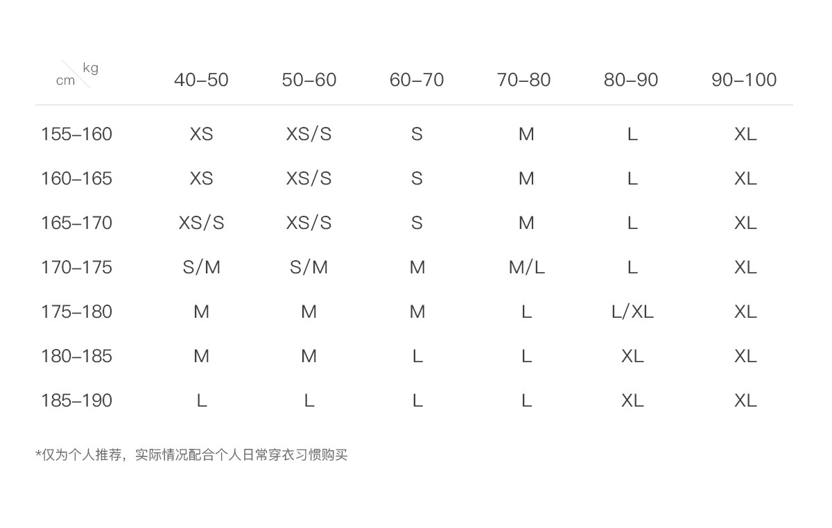 China (cm) 160-165/84-86 165-170 / 88-90 167-172 / 92-96 168-173 / 98-102 170-176 / 106-110
