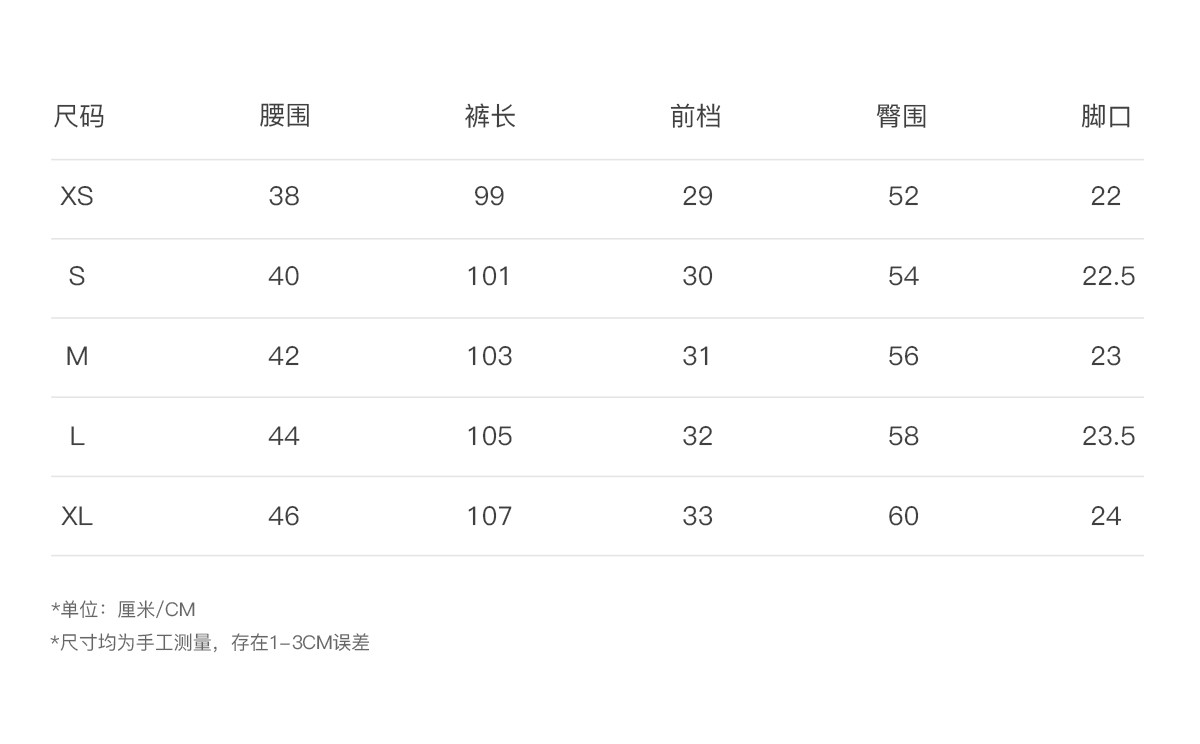 Outseam (cm) 99 cm 101.5 cm 104 cm 106.5 cm 109 cm