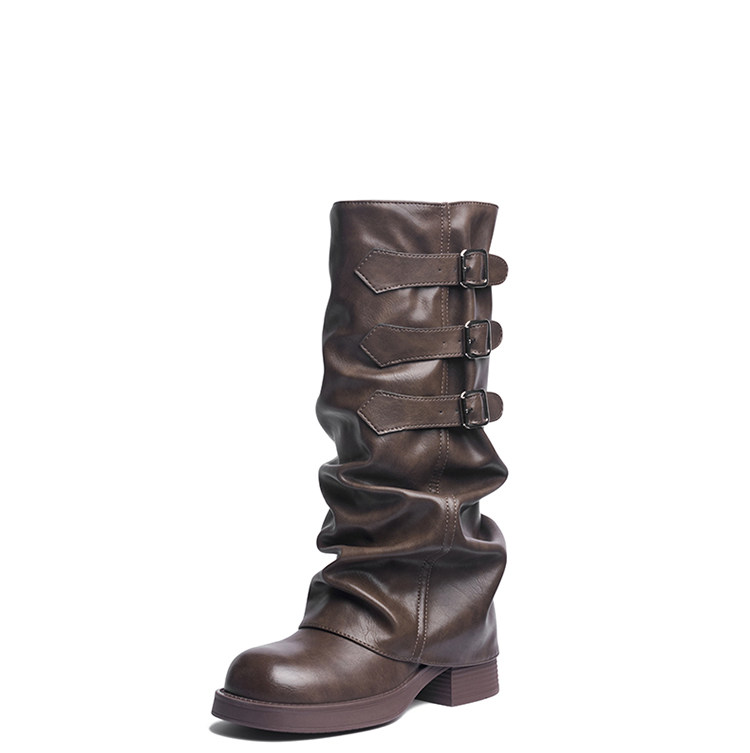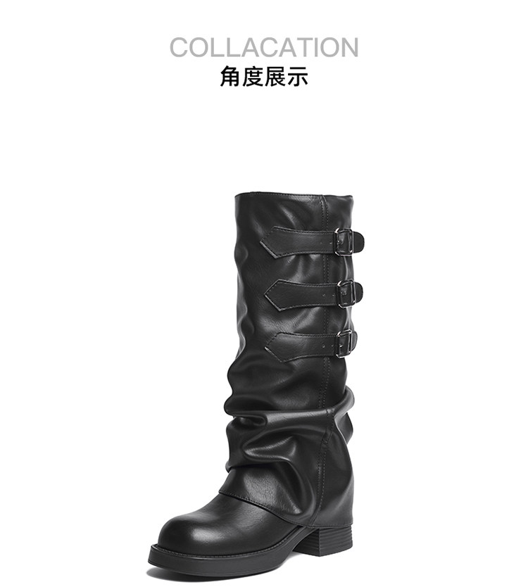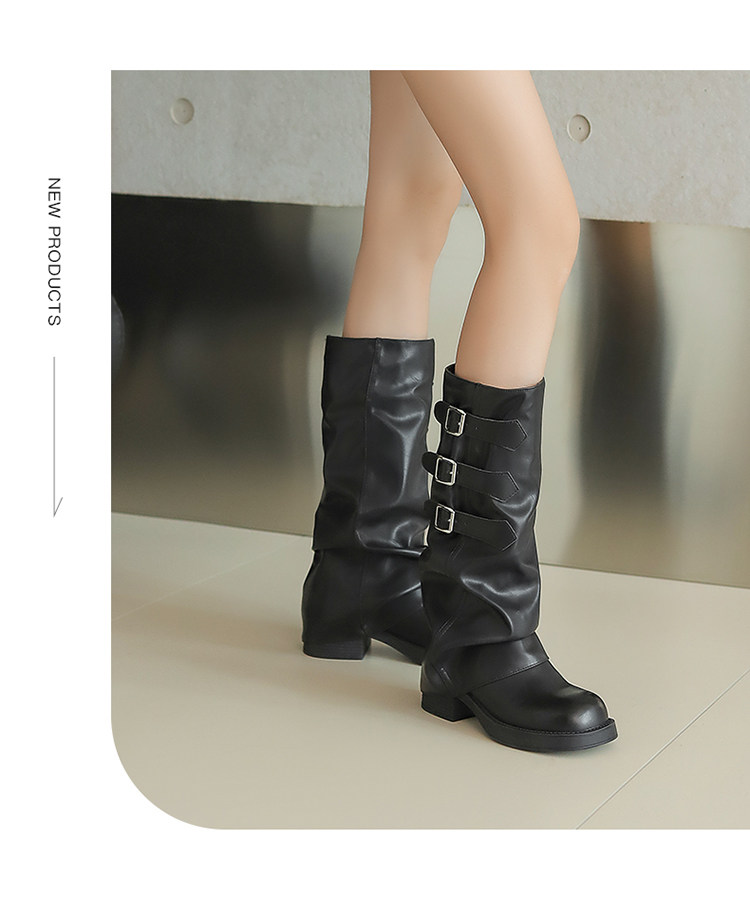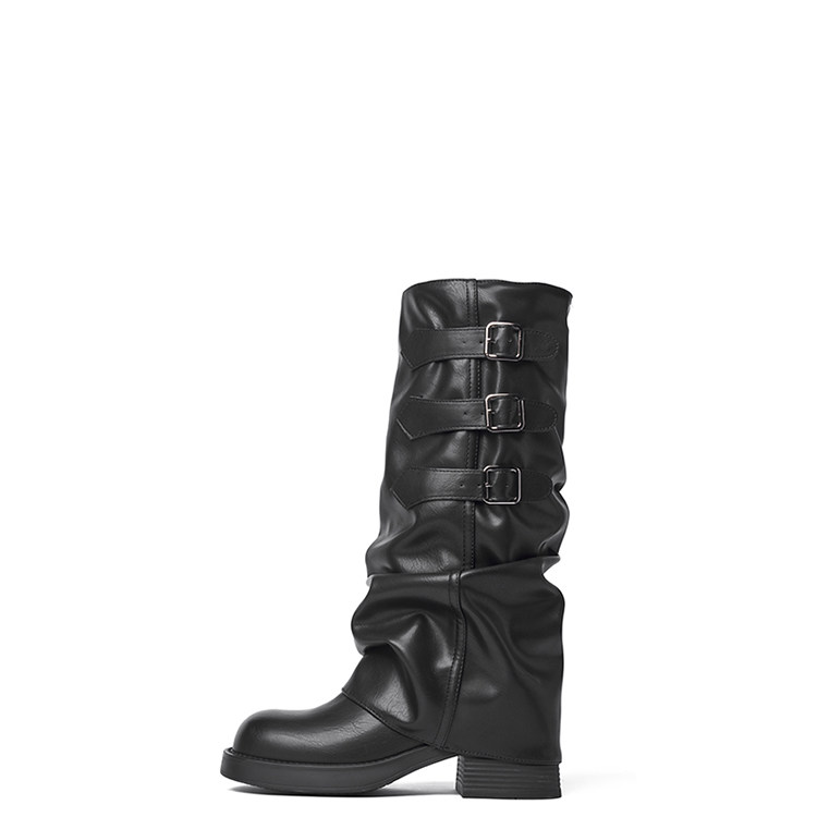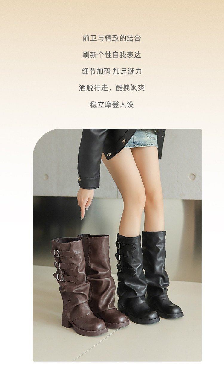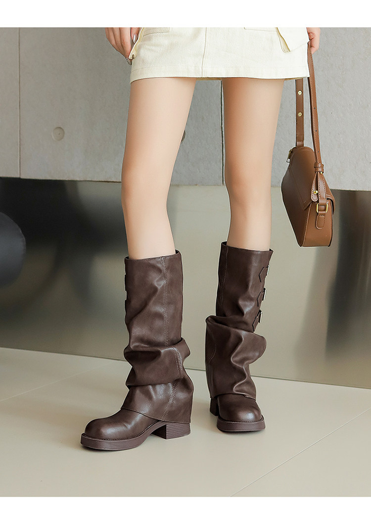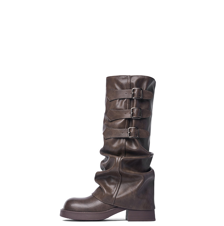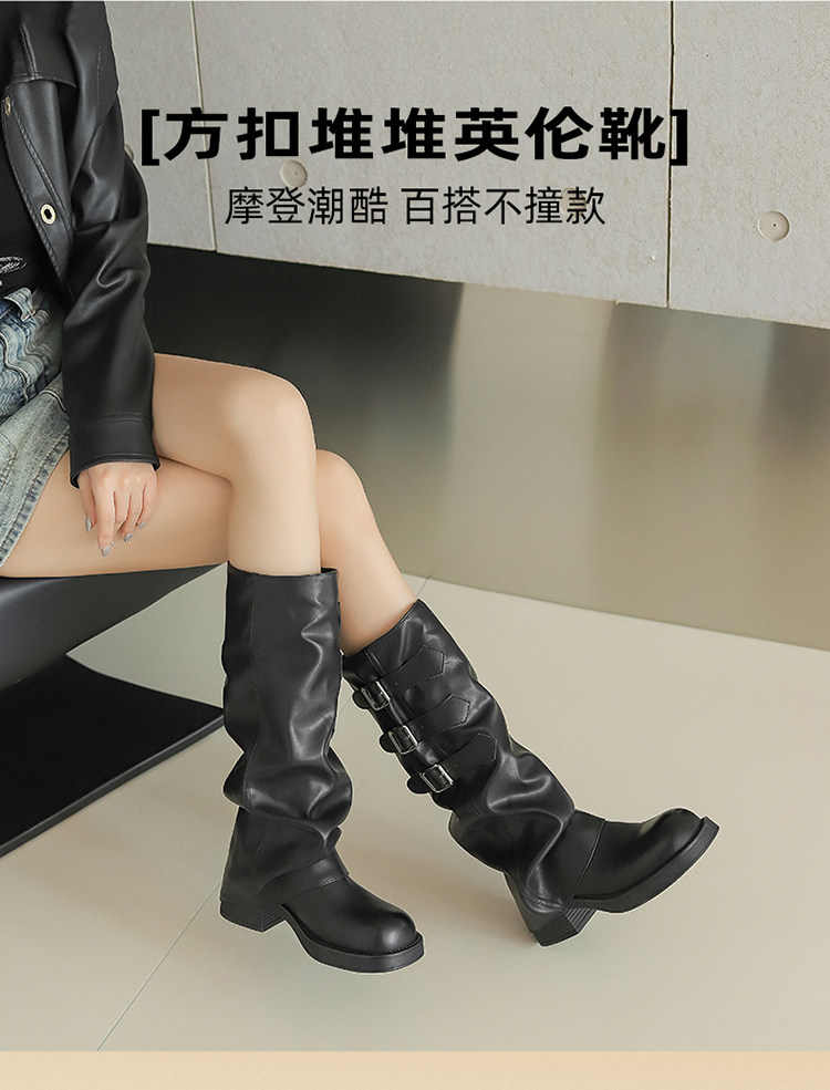 Zhuoshini bottes à poils plissés pour femmes 2025 hiver nouvelle boucle de ceinture bottes occidentales denim talon épais bottes de chevalier bottes hautes