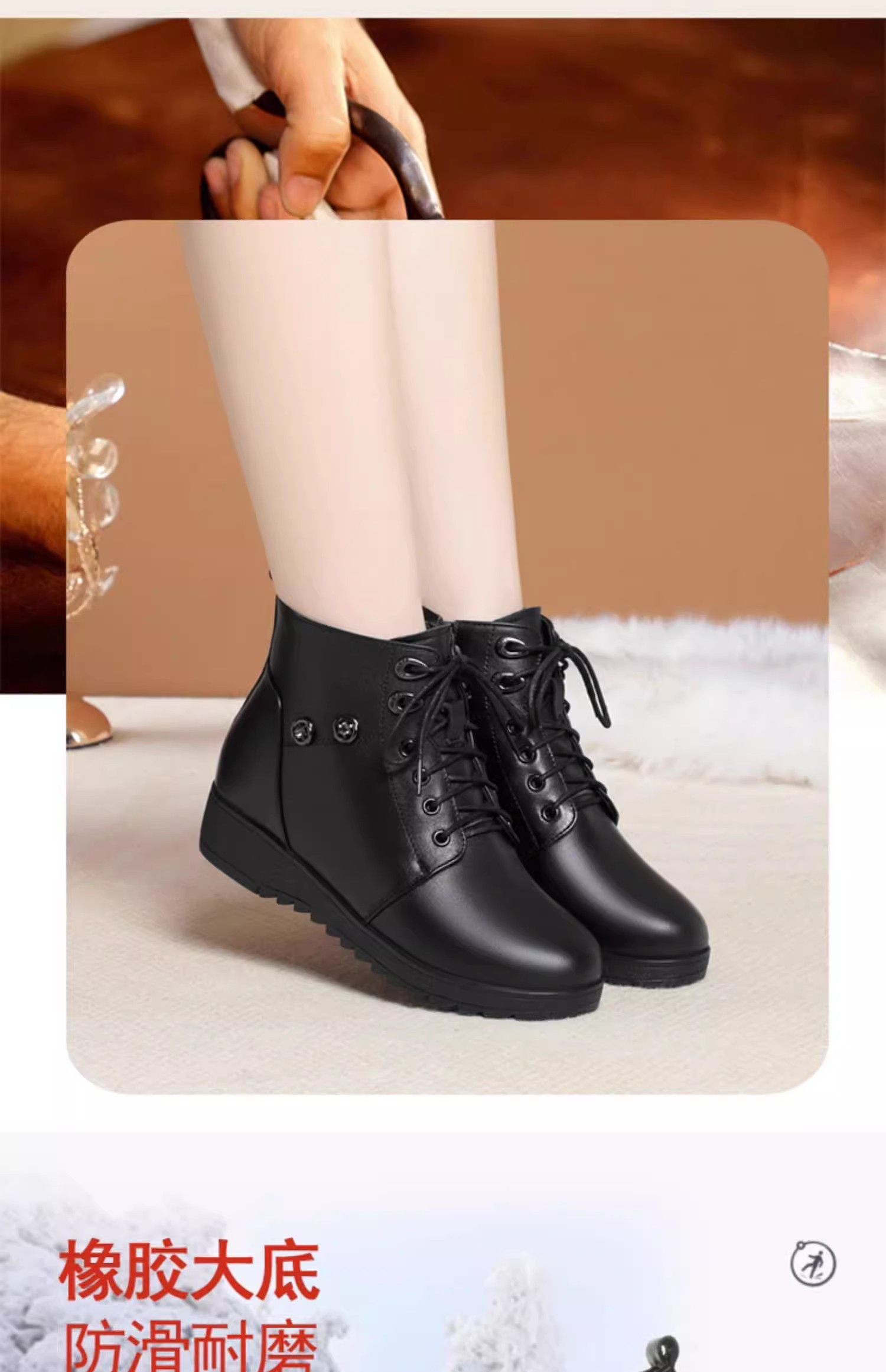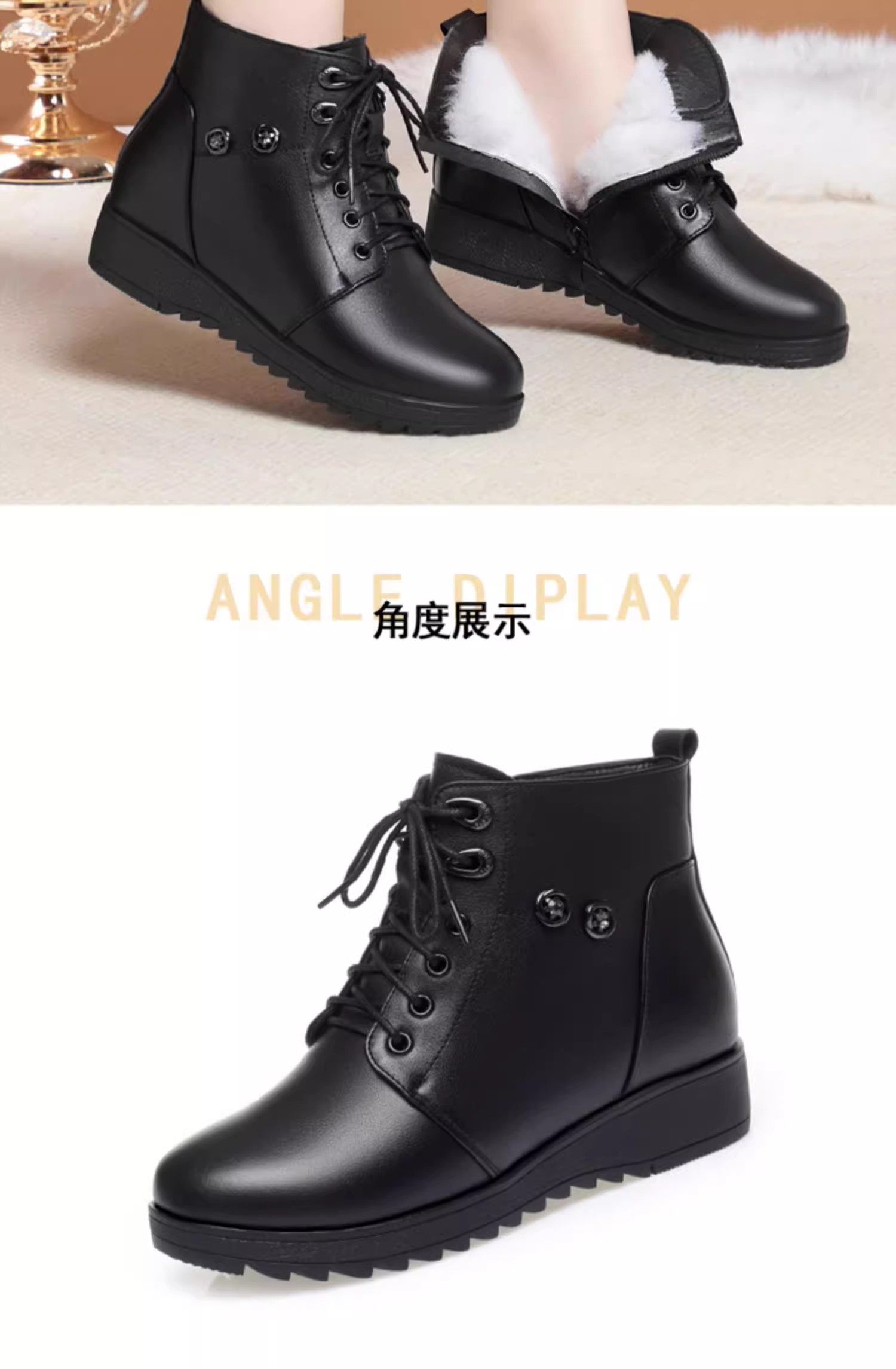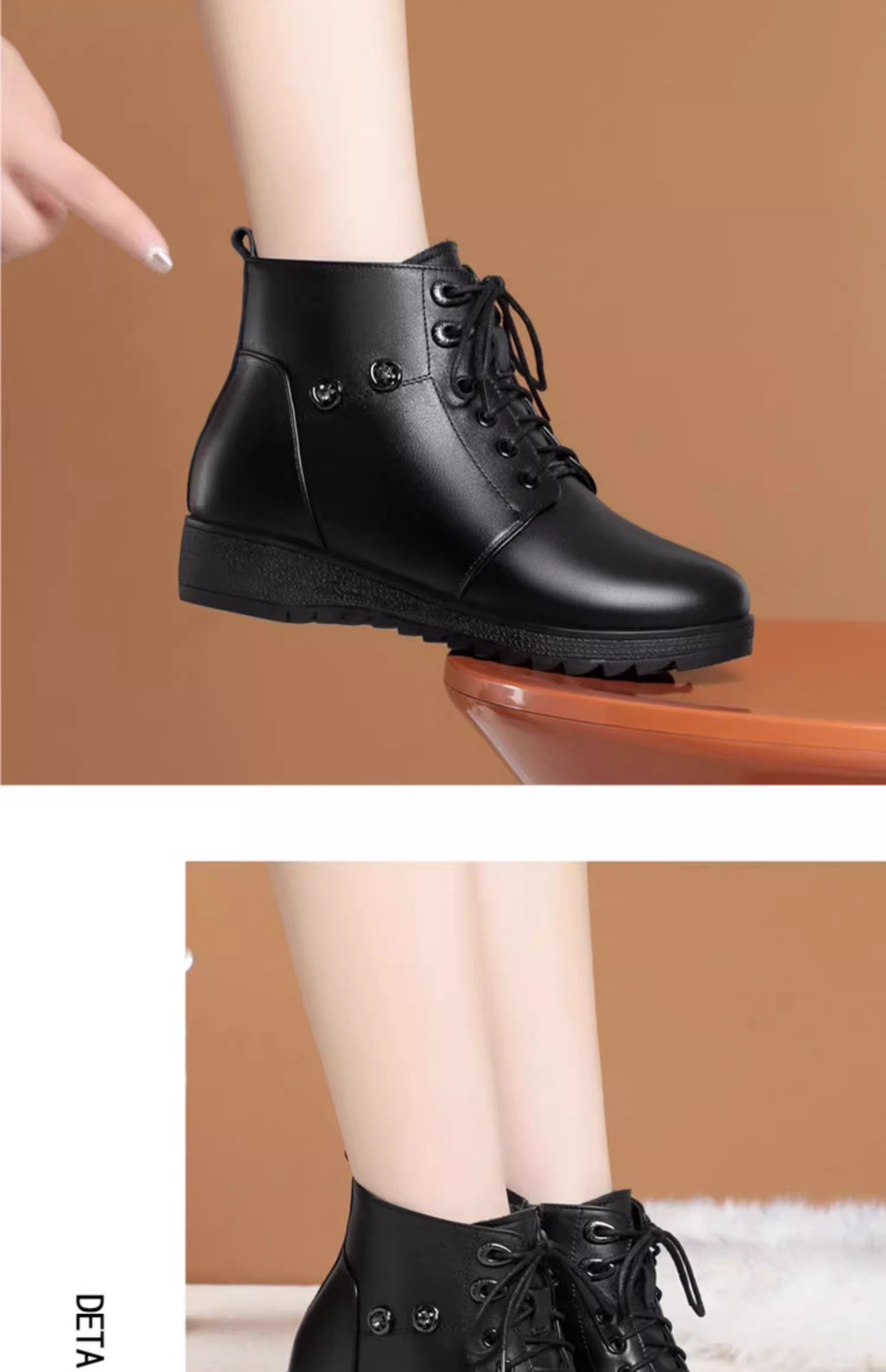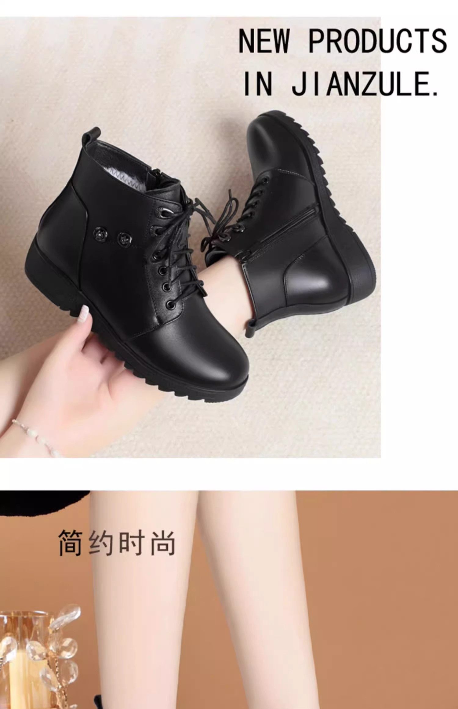 2025 Winter New Style Genuine Leather Short Boots for Women, Large Size Flat Mom Shoes, Soft Sole Fleece-Lined Cotton Shoes, Martin Boots, Leather Shoes