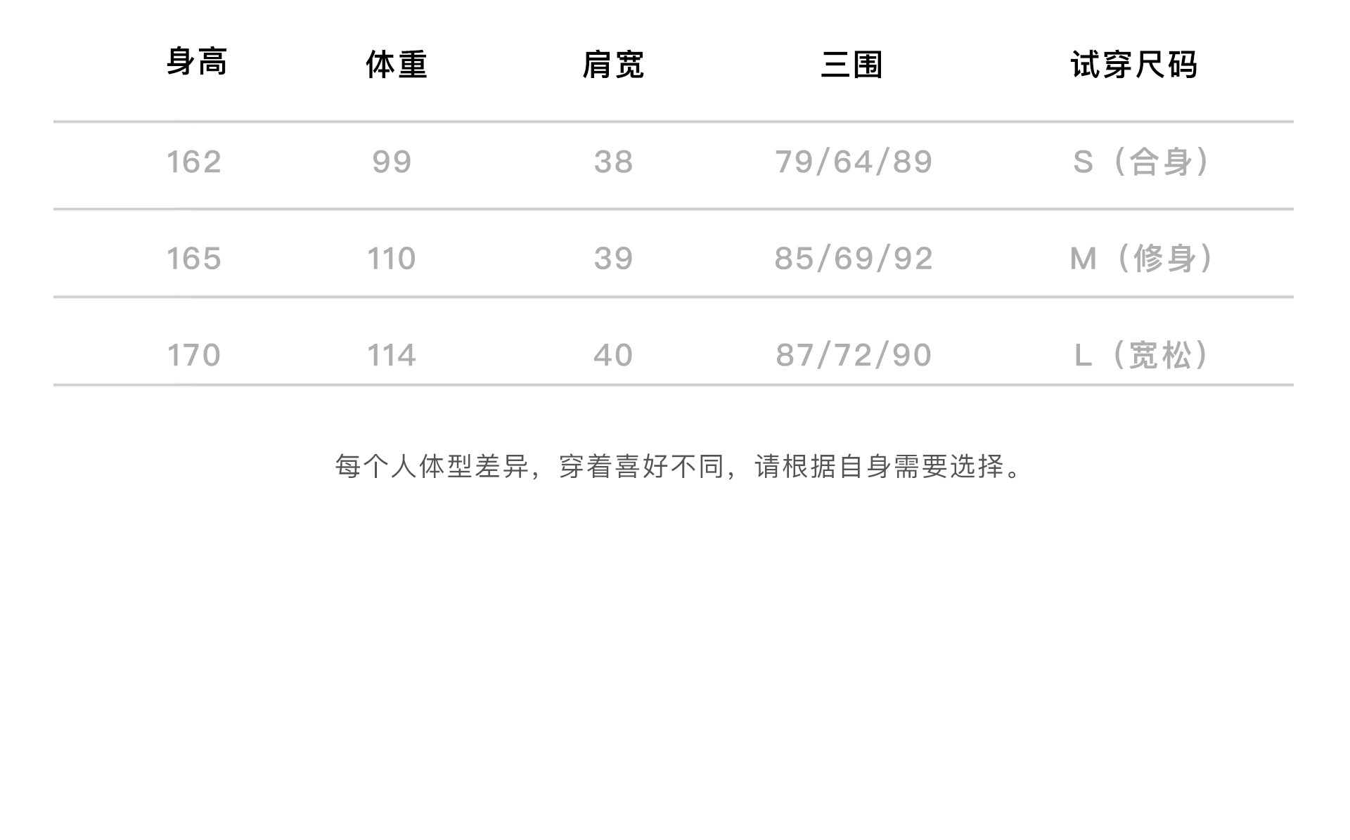 China (cm) 160-165/84-86 165-170 / 88-90 167-172 / 92-96 168-173 / 98-102 170-176 / 106-110