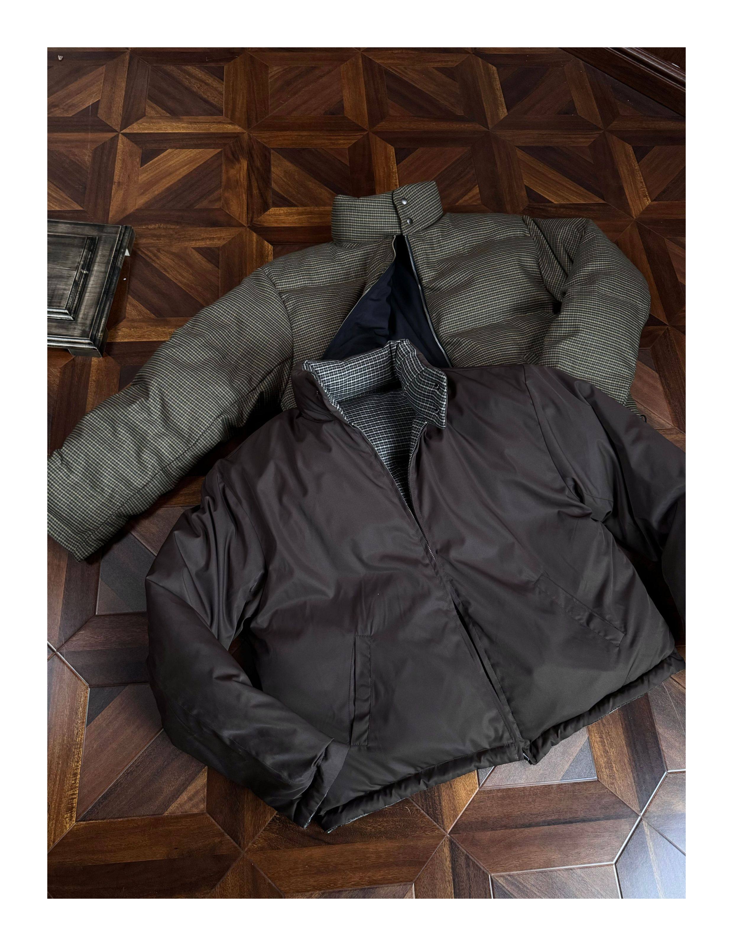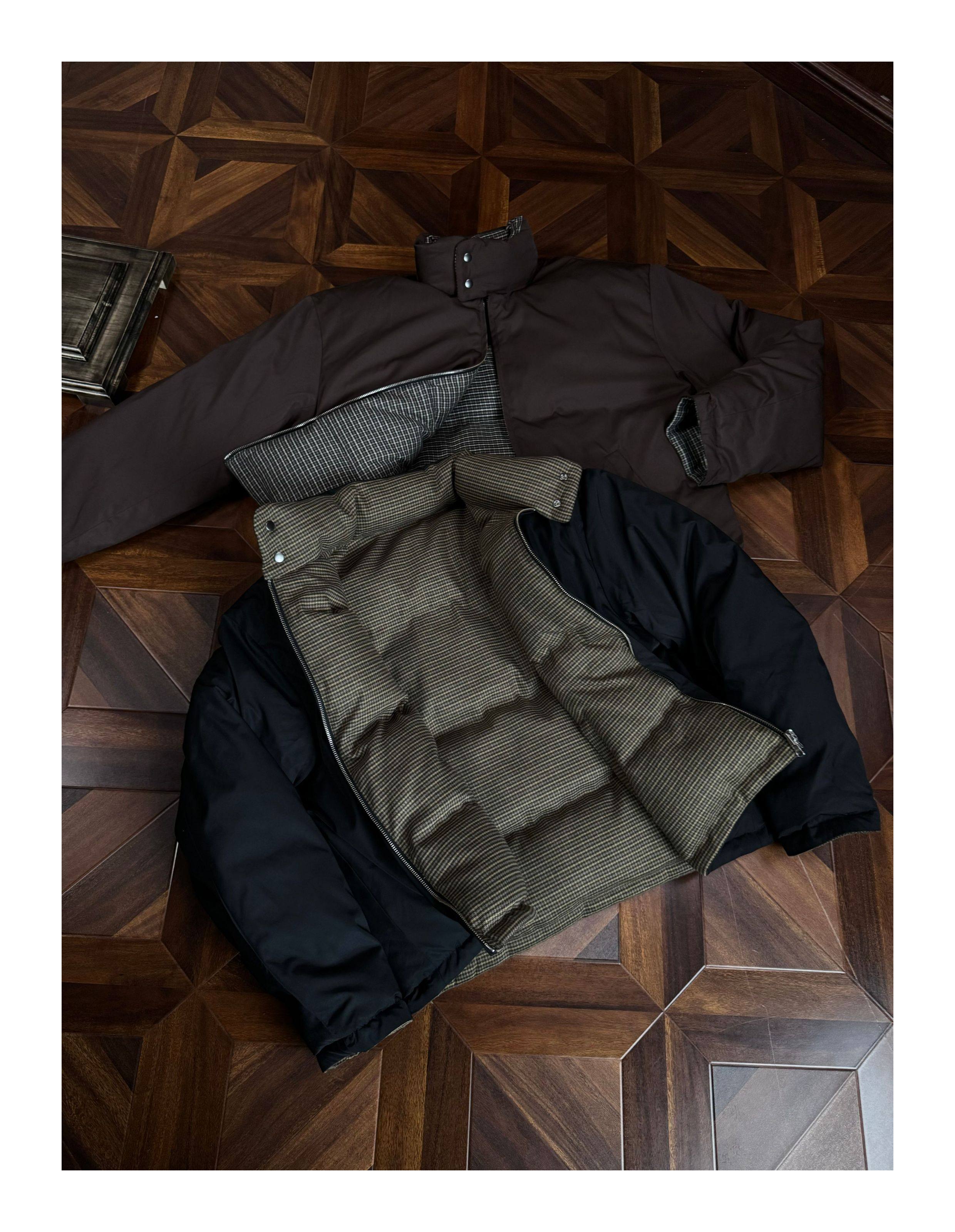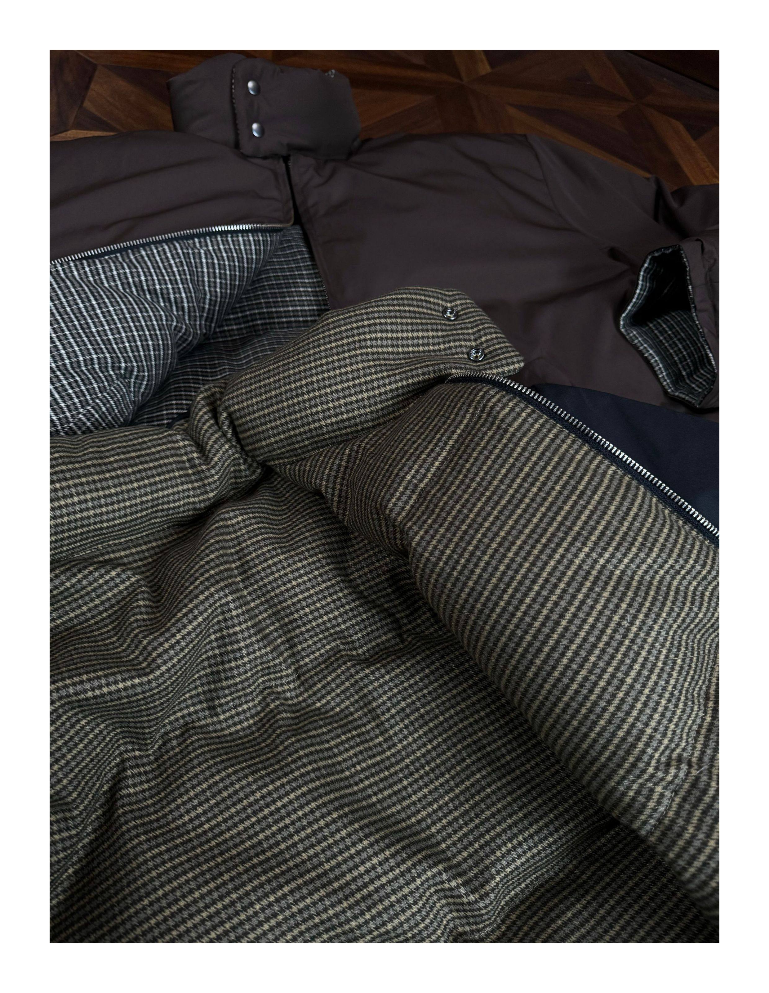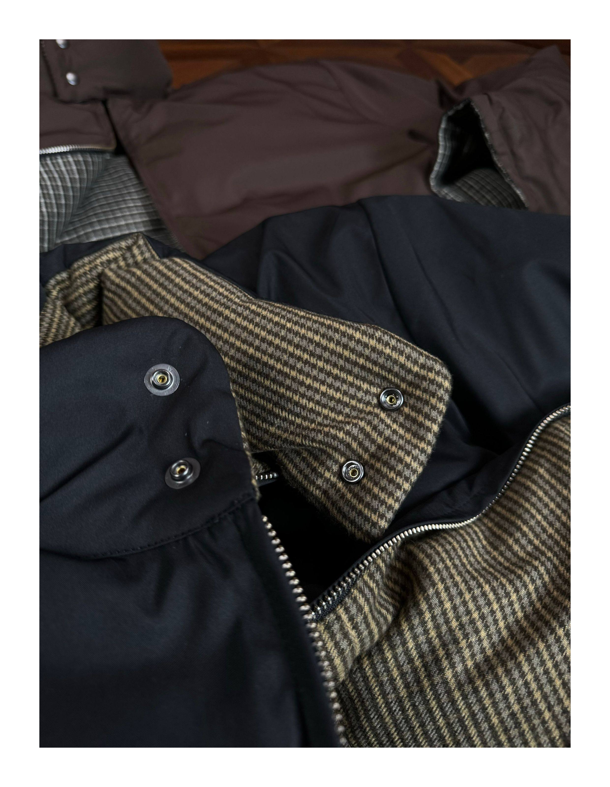 Oclin Houndstooth Reversible Harrington down Jacket, Short and Wide, Multi-Form, Water-Repellent, Brushed Feel, 90% White Duck down