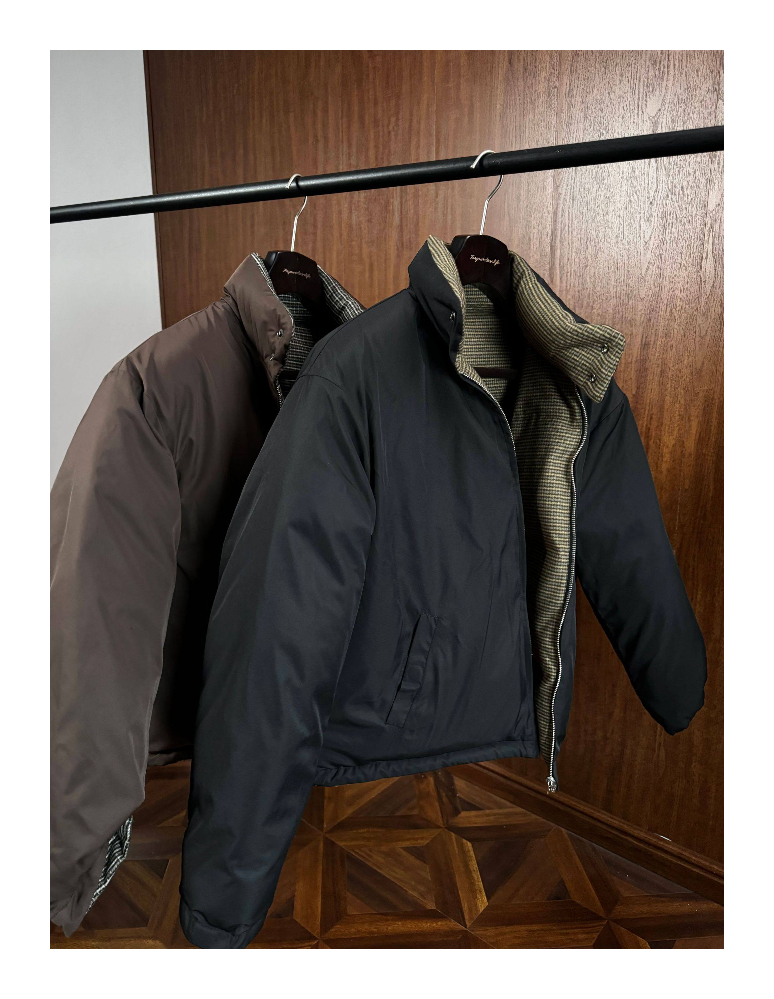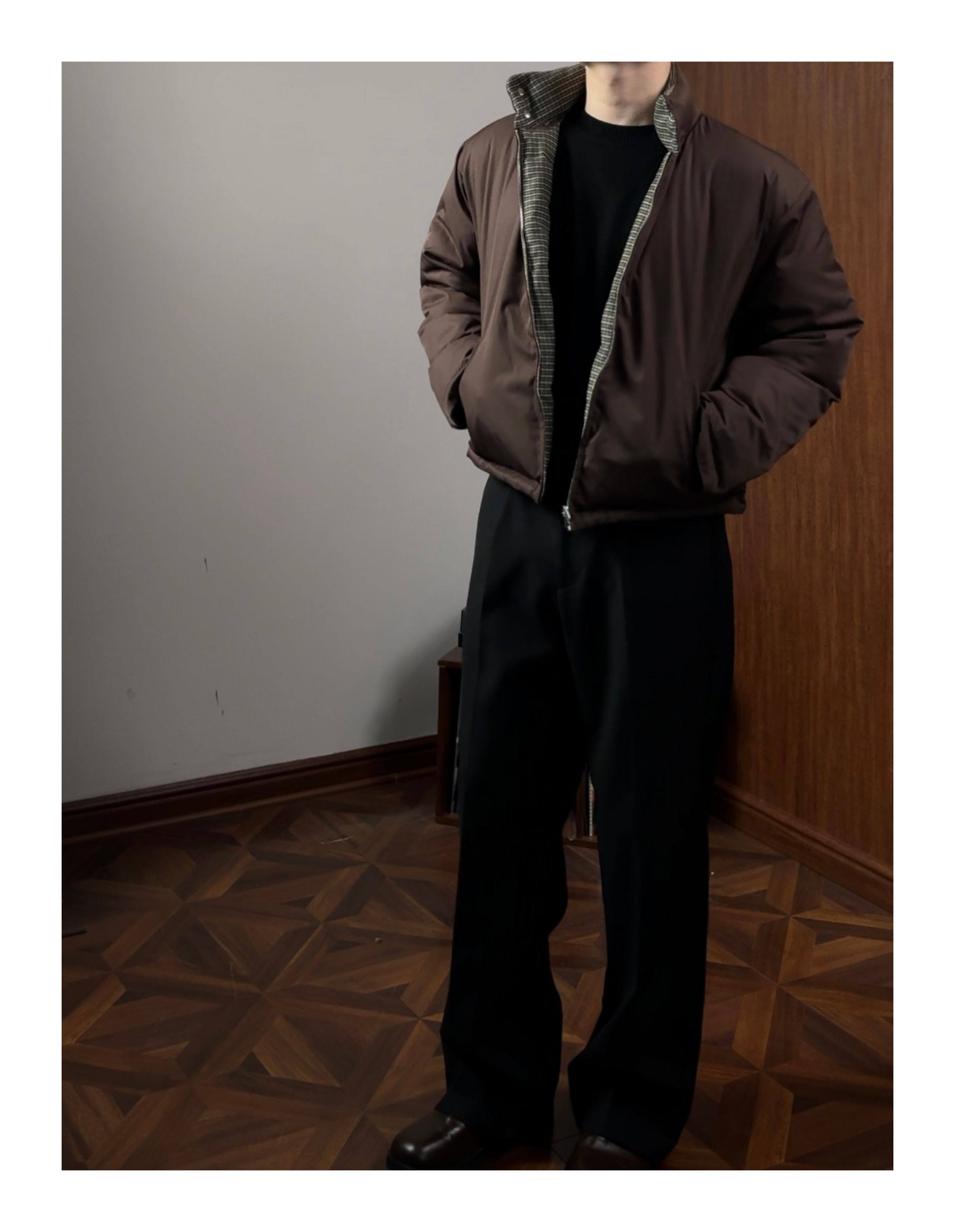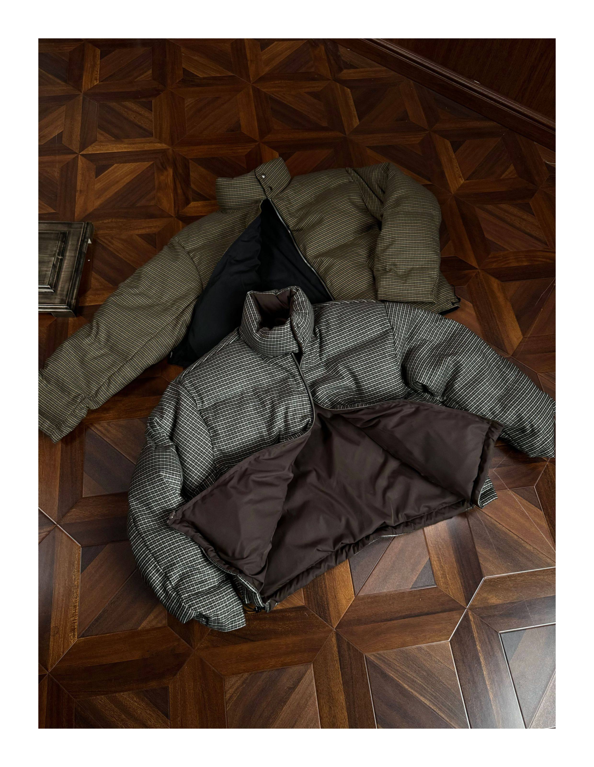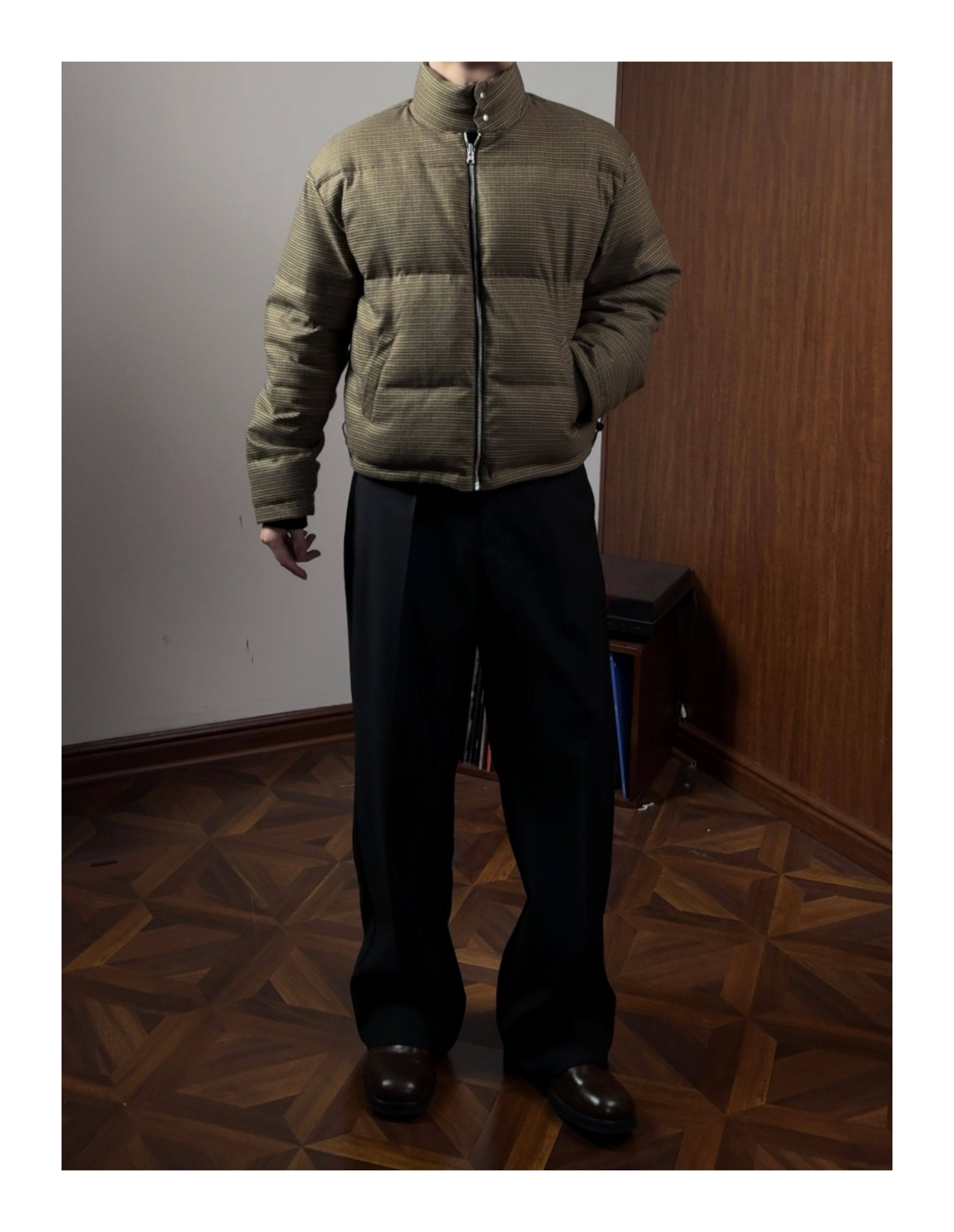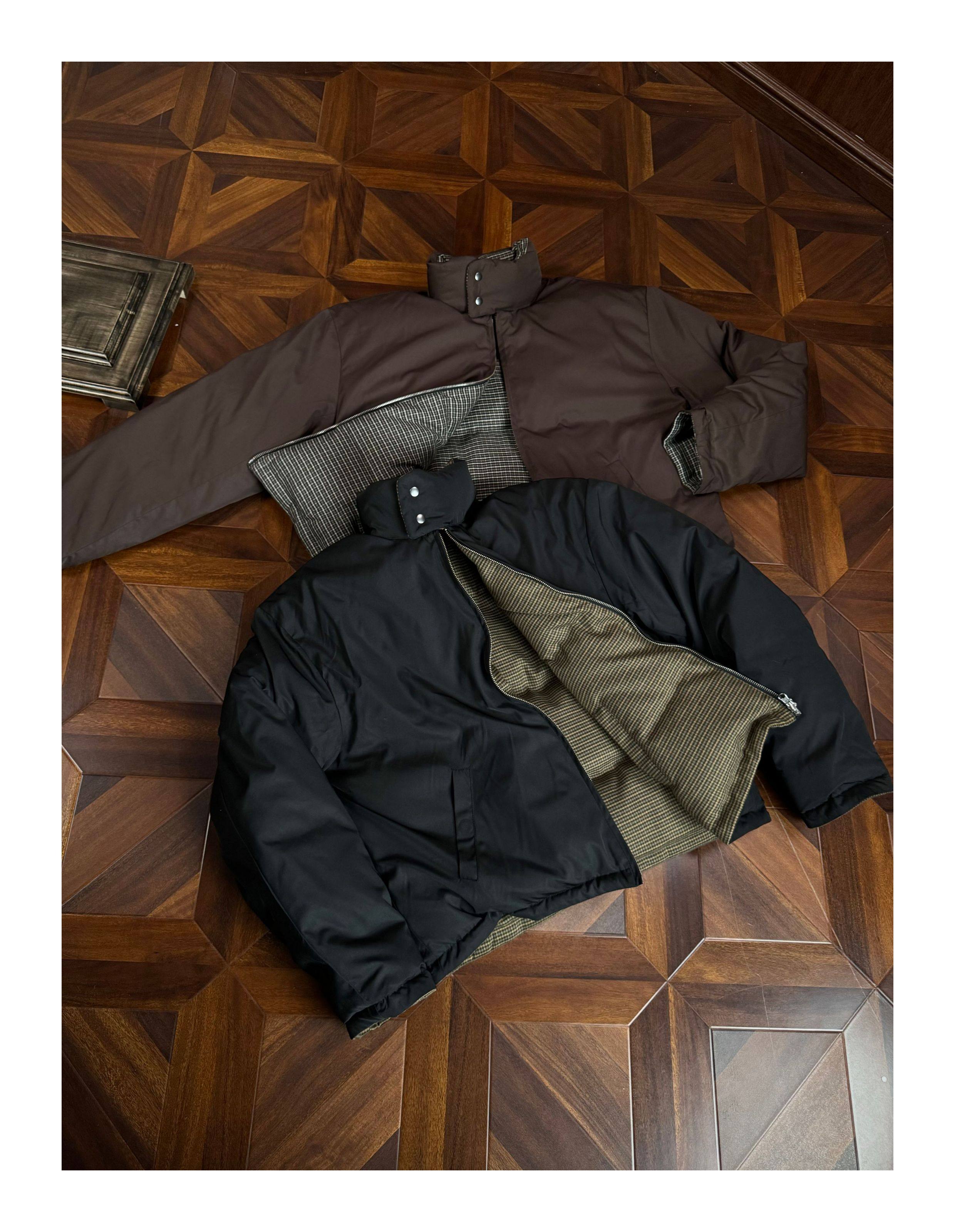 Oclin Houndstooth Reversible Harrington down Jacket, Short and Wide, Multi-Form, Water-Repellent, Brushed Feel, 90% White Duck down
