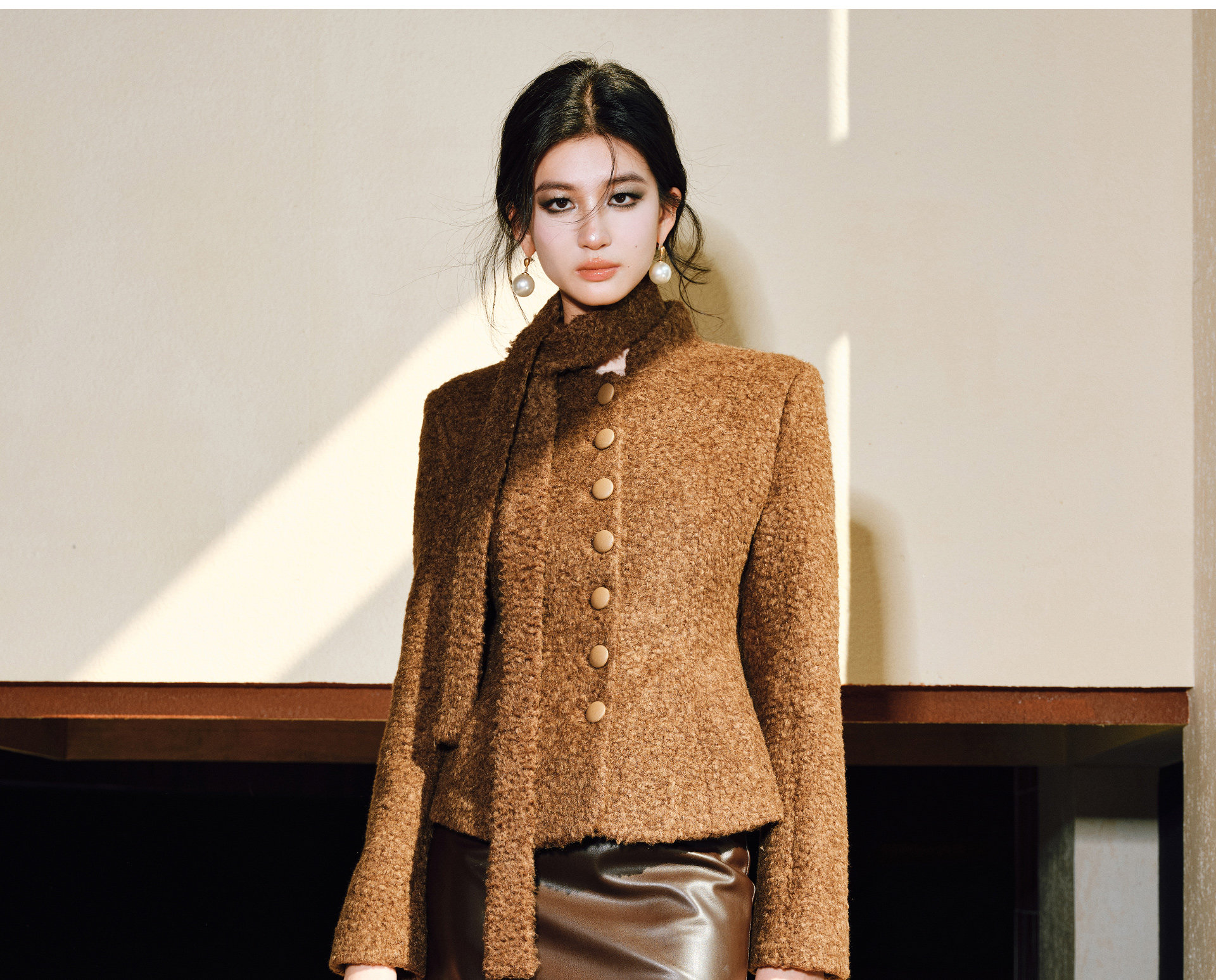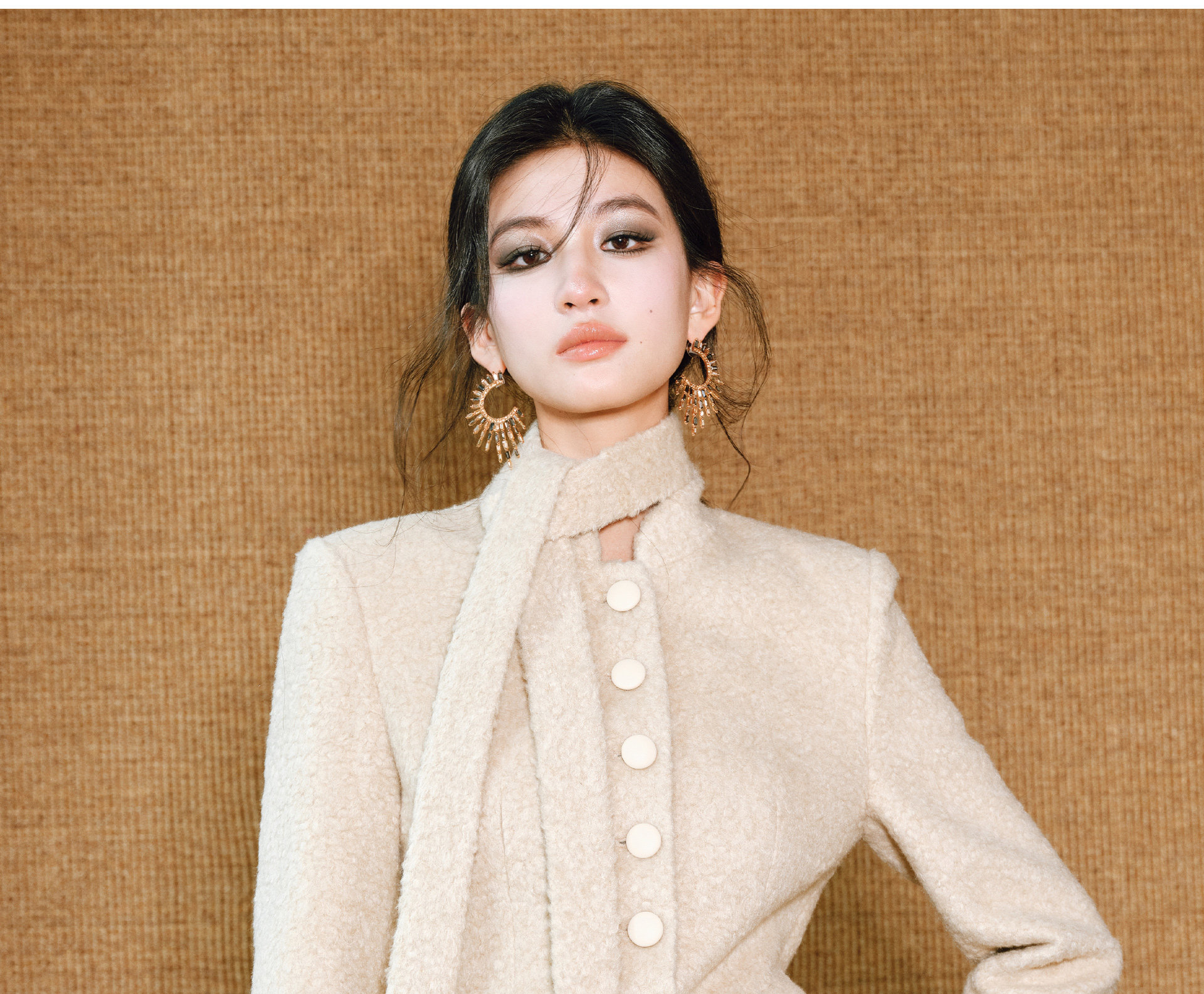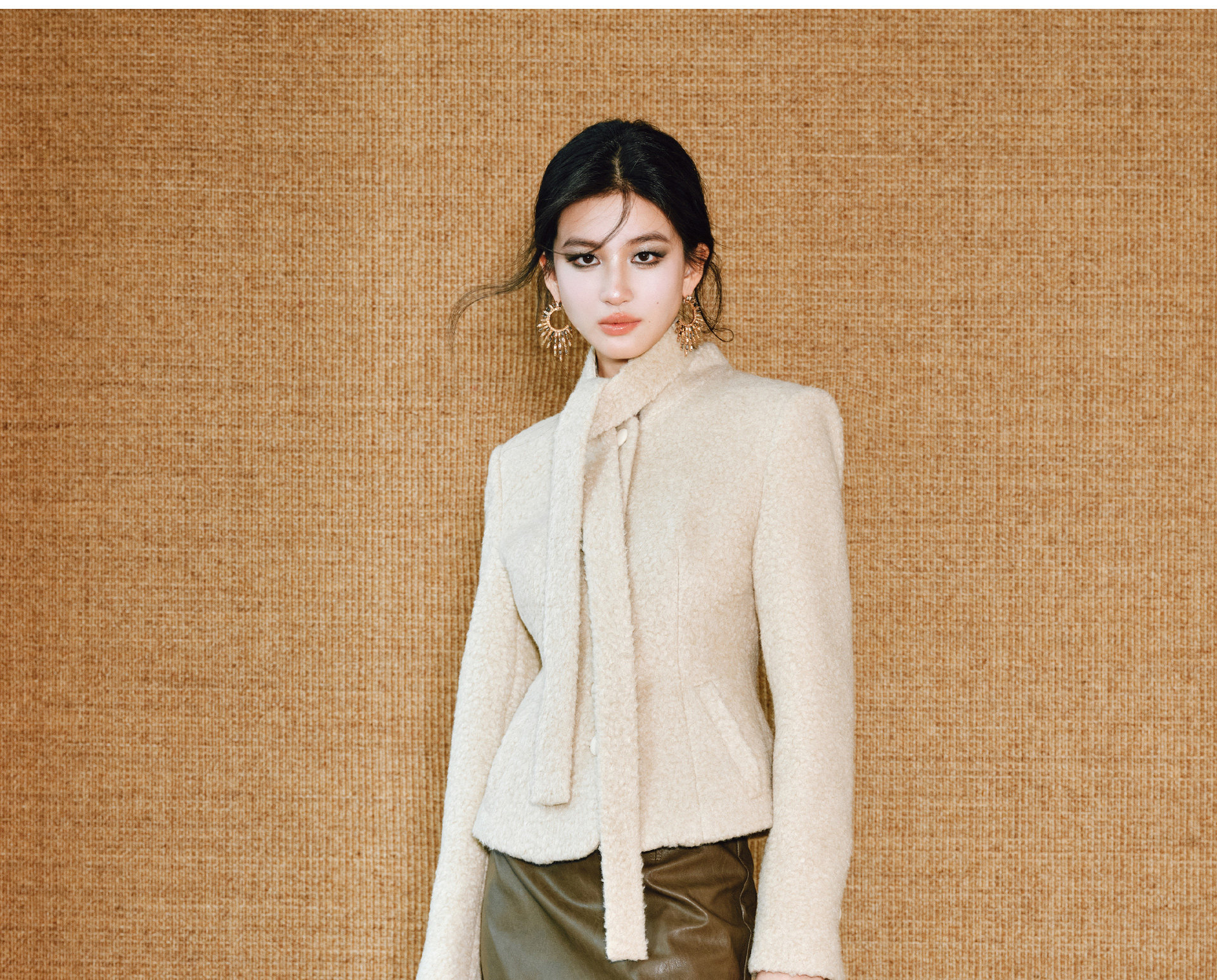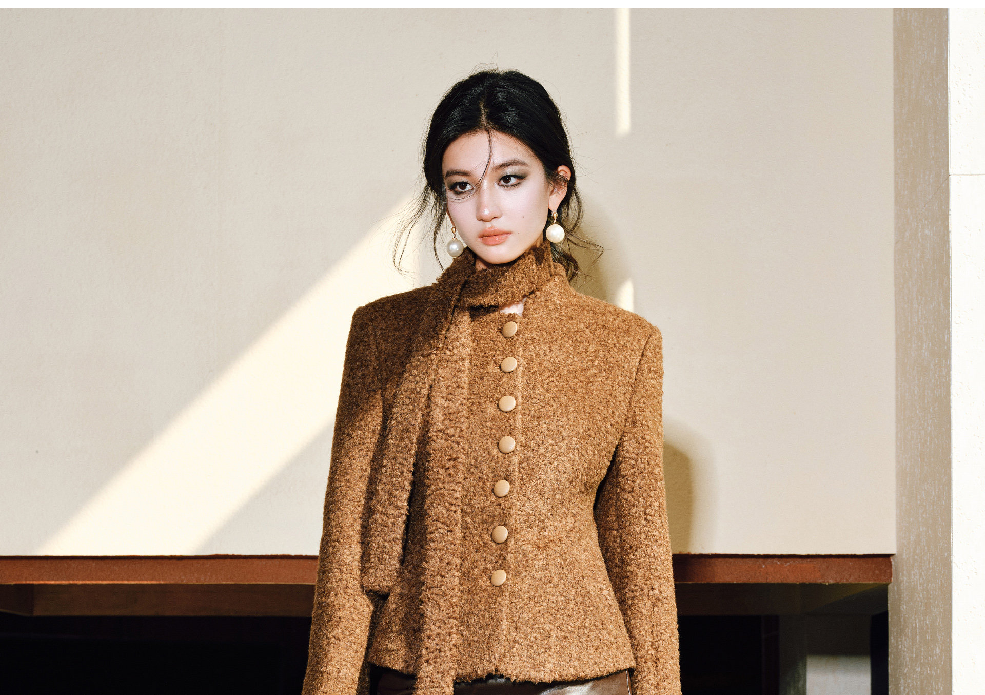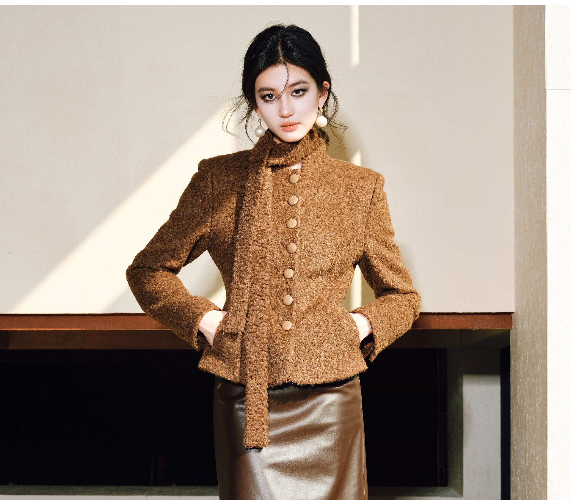 Wangxo|Silk-Like Curly Texture Woolen Fabric|Warm Ribbon Stand Collar Waist-Cinching Straight Shoulder Elegant Short Coat
