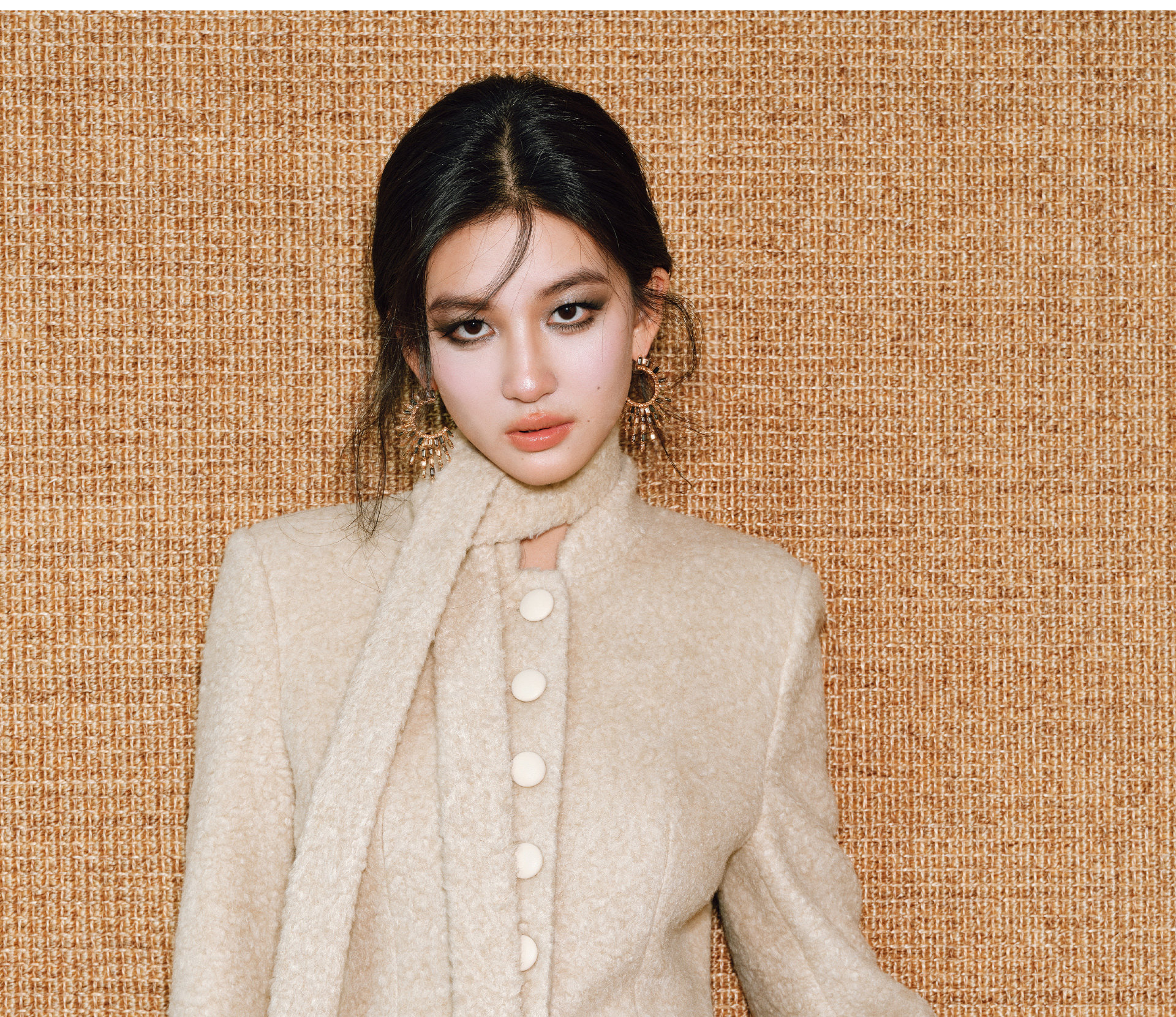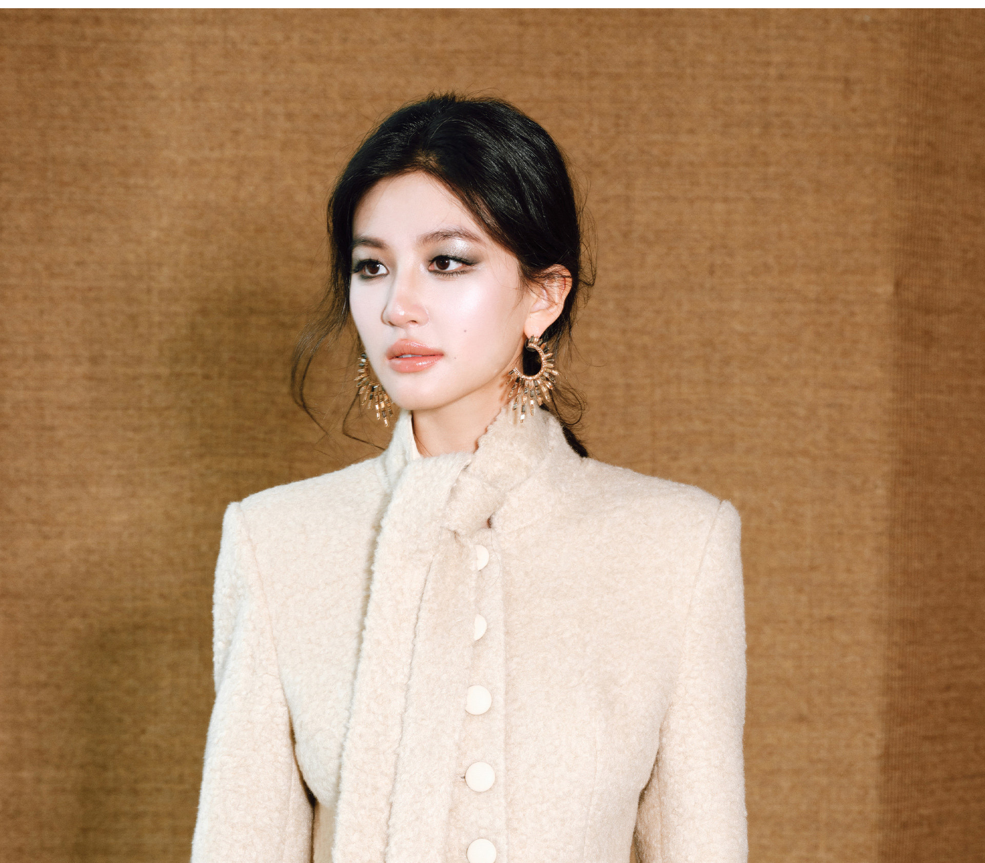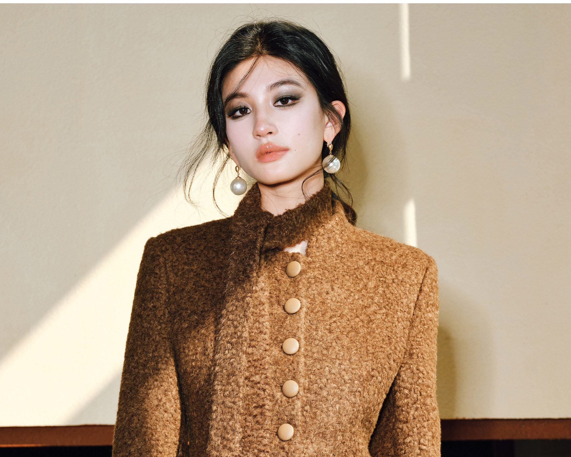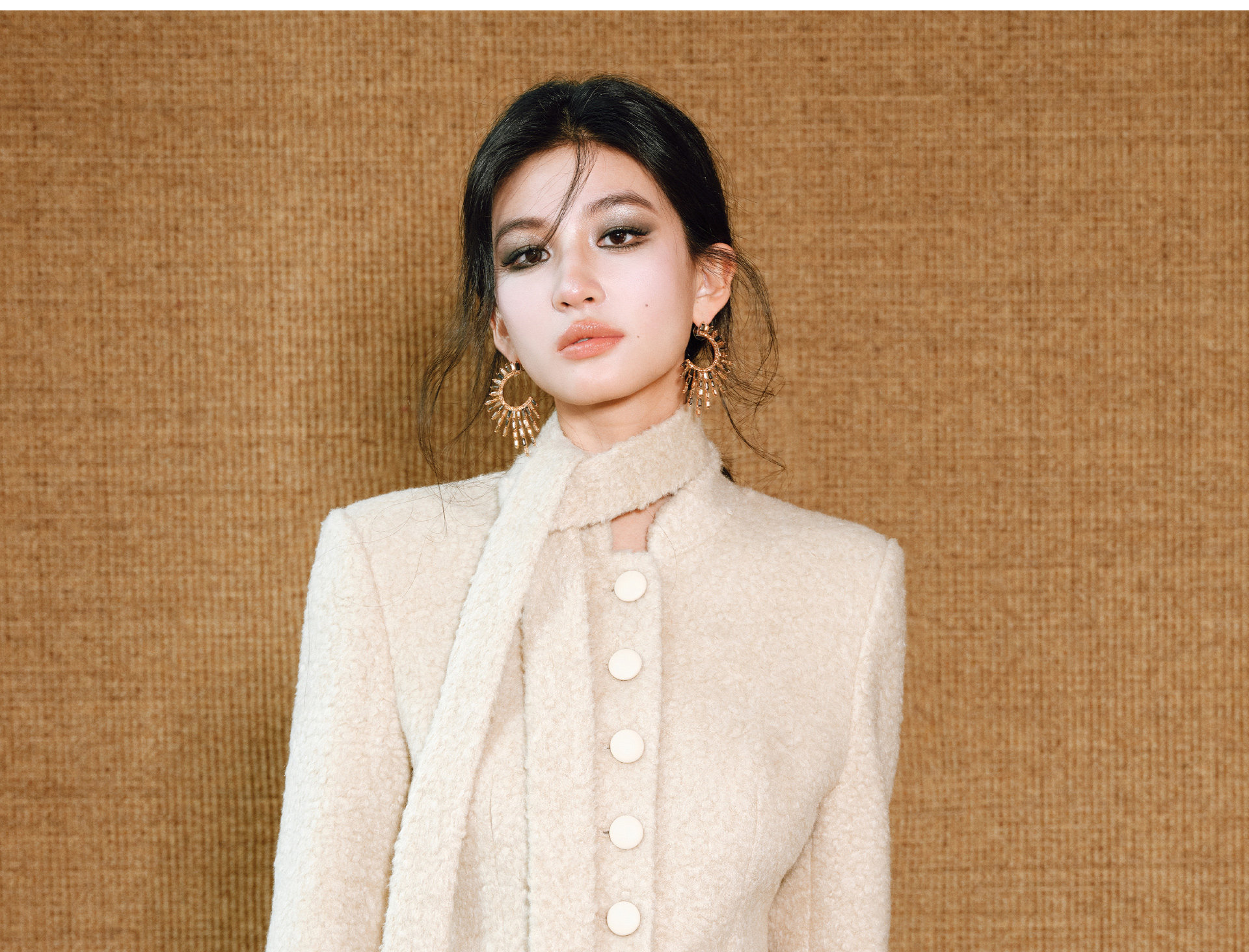 Wangxo|Silk-Like Curly Texture Woolen Fabric|Warm Ribbon Stand Collar Waist-Cinching Straight Shoulder Elegant Short Coat