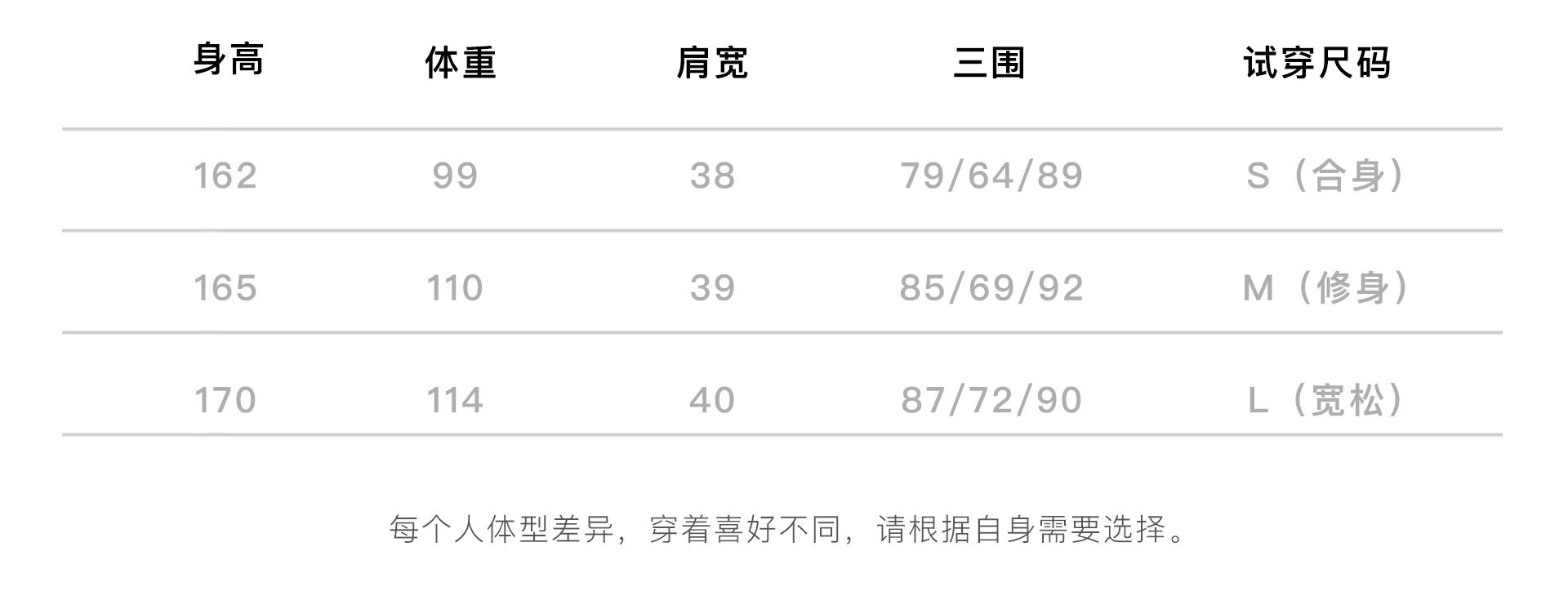 China (cm) 160-165/84-86 165-170 / 88-90 167-172 / 92-96 168-173 / 98-102 170-176 / 106-110
