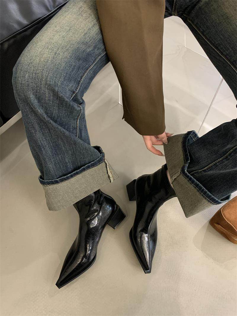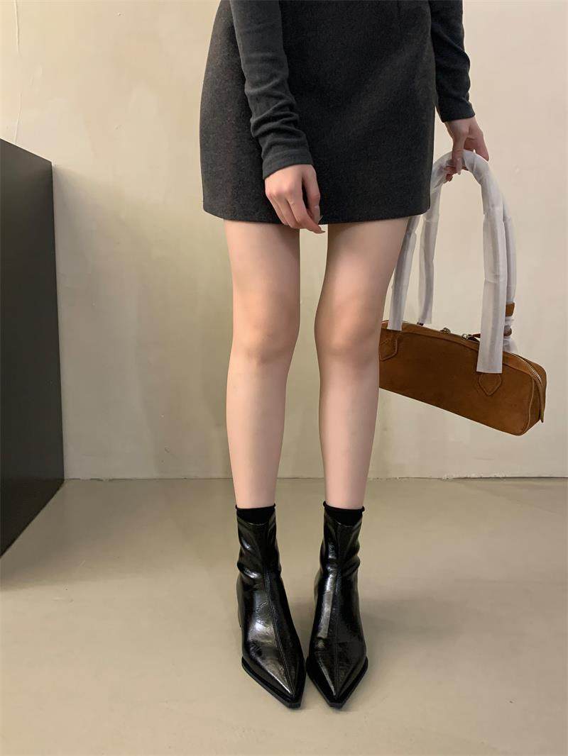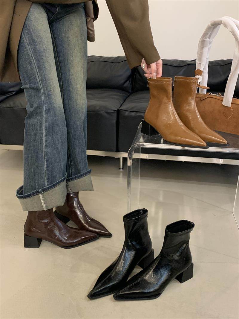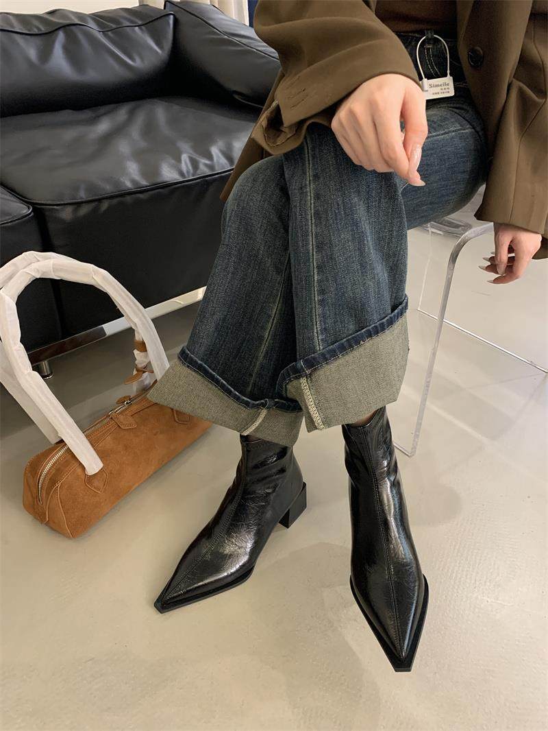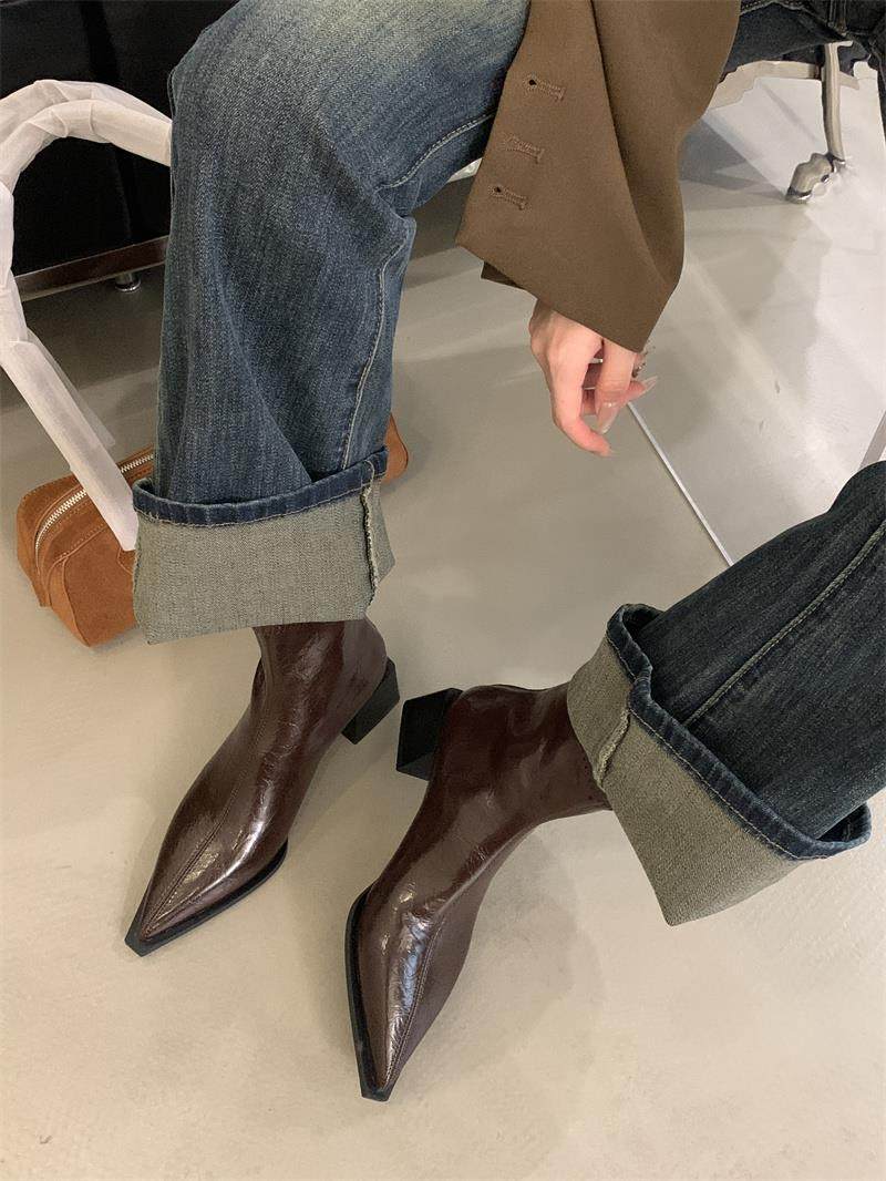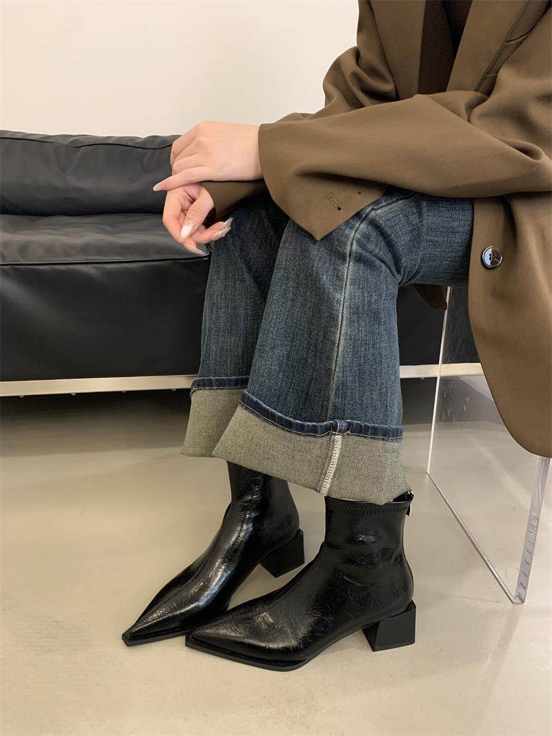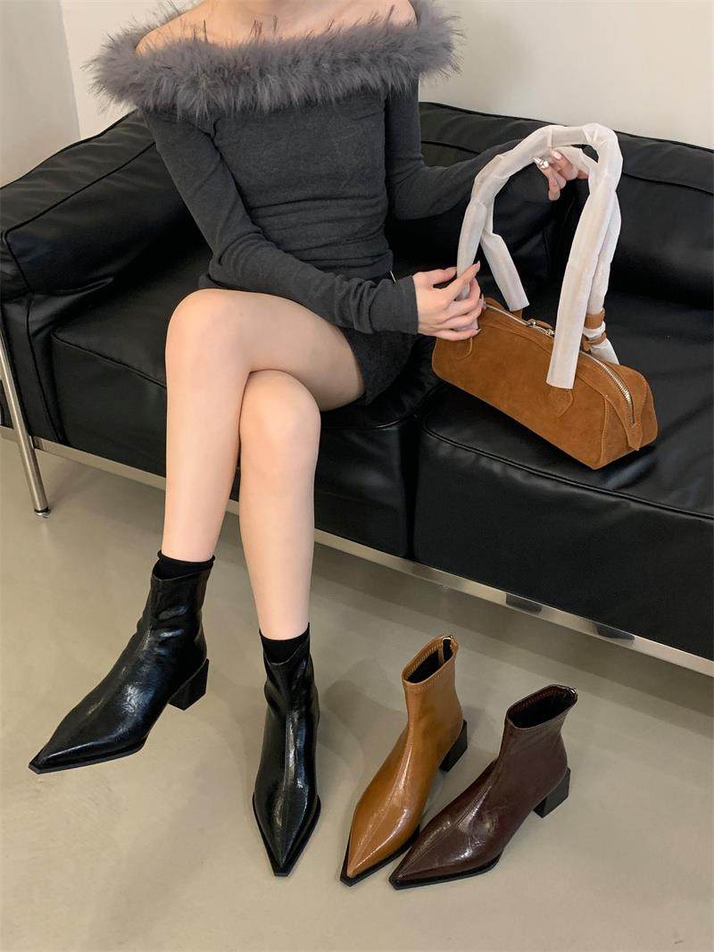 潮牌尖头欧美短靴女新款2025秋冬季时装粗跟瘦瘦靴小众设计马丁靴