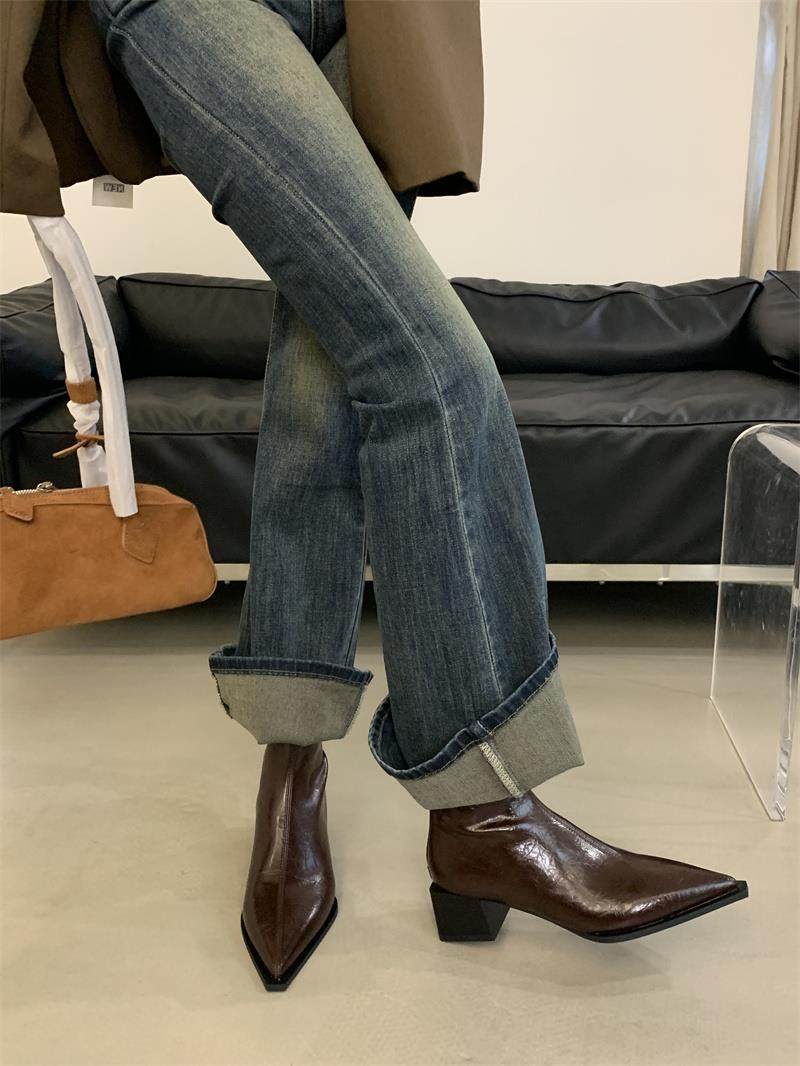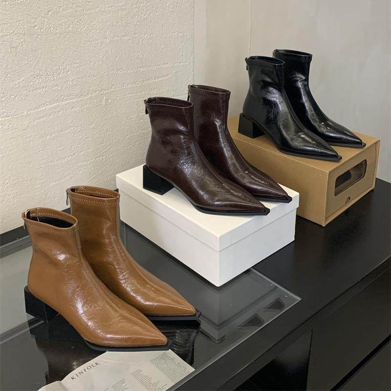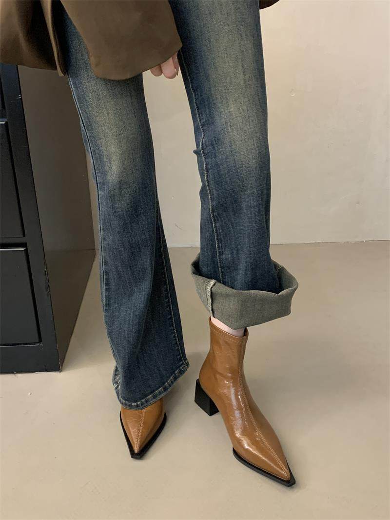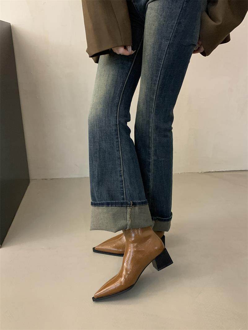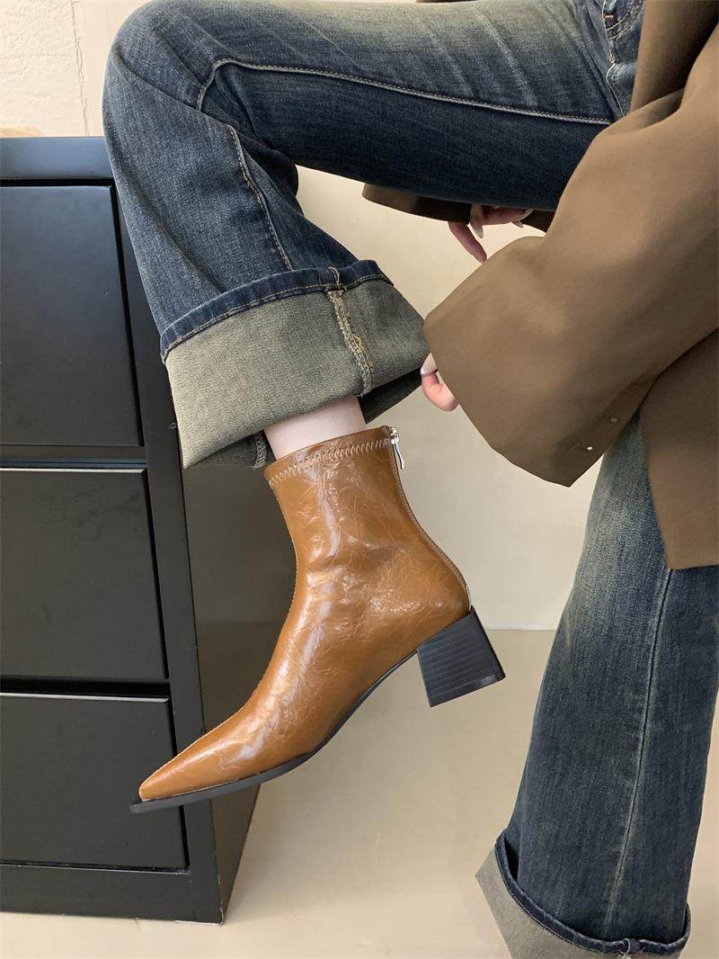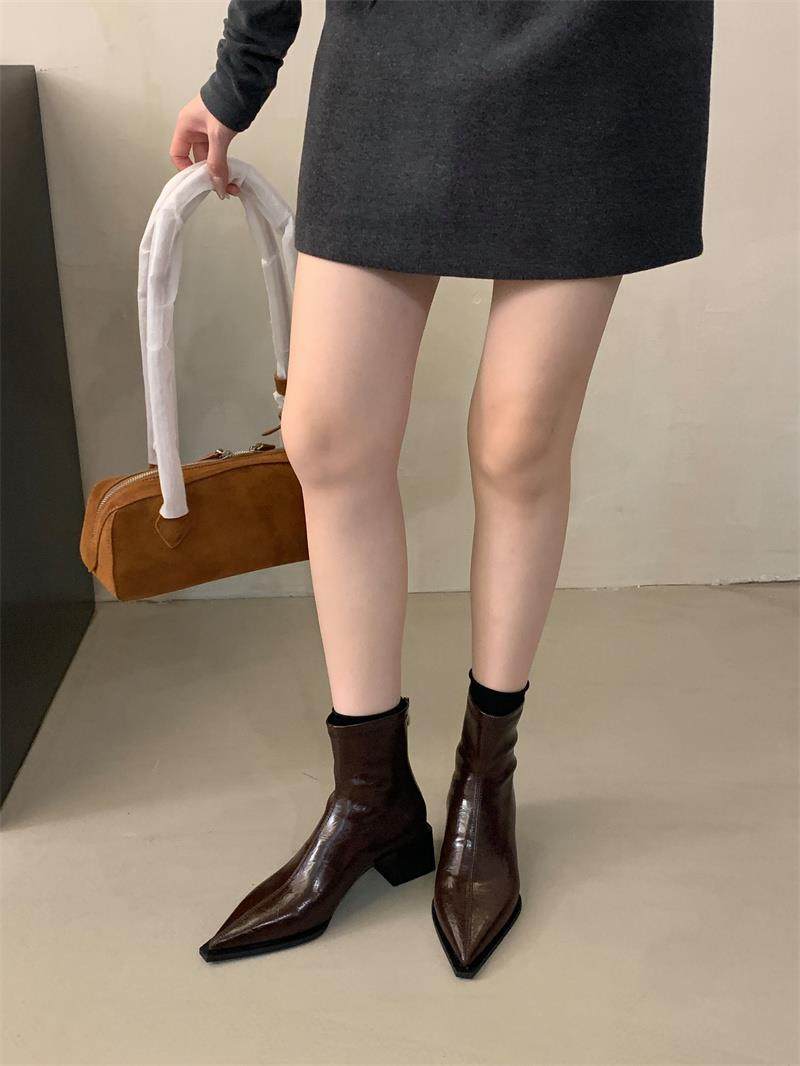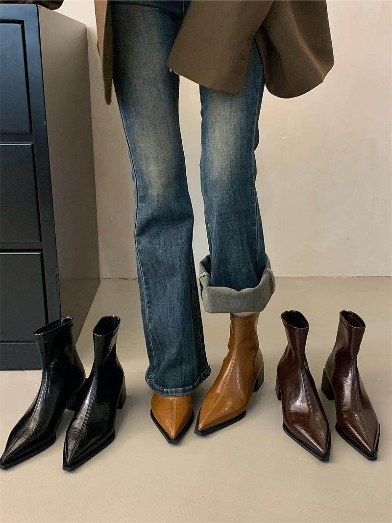 潮牌尖头欧美短靴女新款2025秋冬季时装粗跟瘦瘦靴小众设计马丁靴