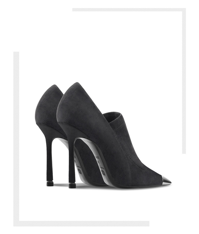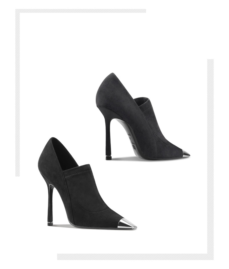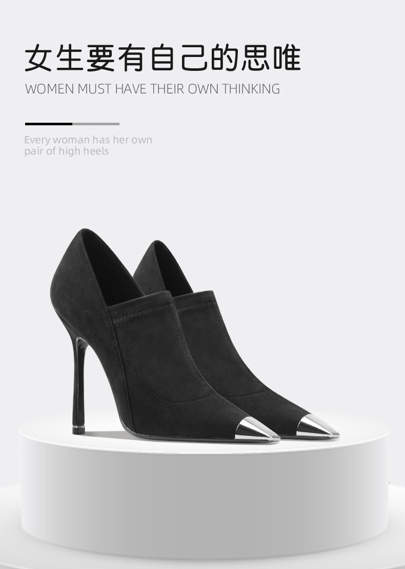金属铁头黑色绒面时装靴女2025年秋冬方头方根新款短靴通勤瘦瘦靴