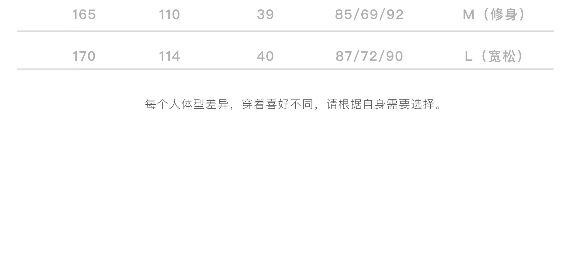 China (cm) 160-165/84-86 165-170 / 88-90 167-172 / 92-96 168-173 / 98-102 170-176 / 106-110