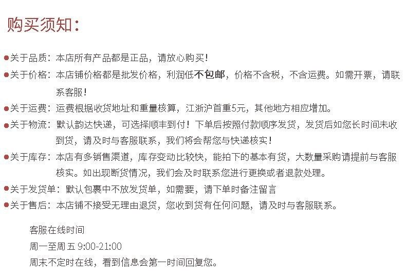2)运费通常按每0.5公斤收费。因此,如果你购买的产品只有0.1公斤,那么你可以考虑一次购买2-3件,这不会增加你订单的运费。