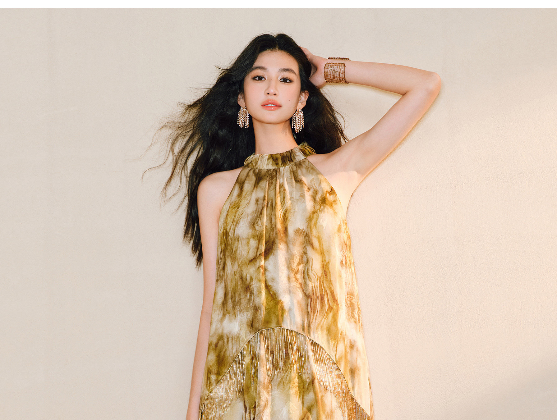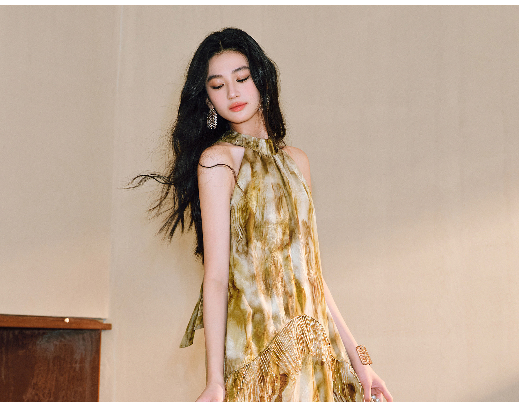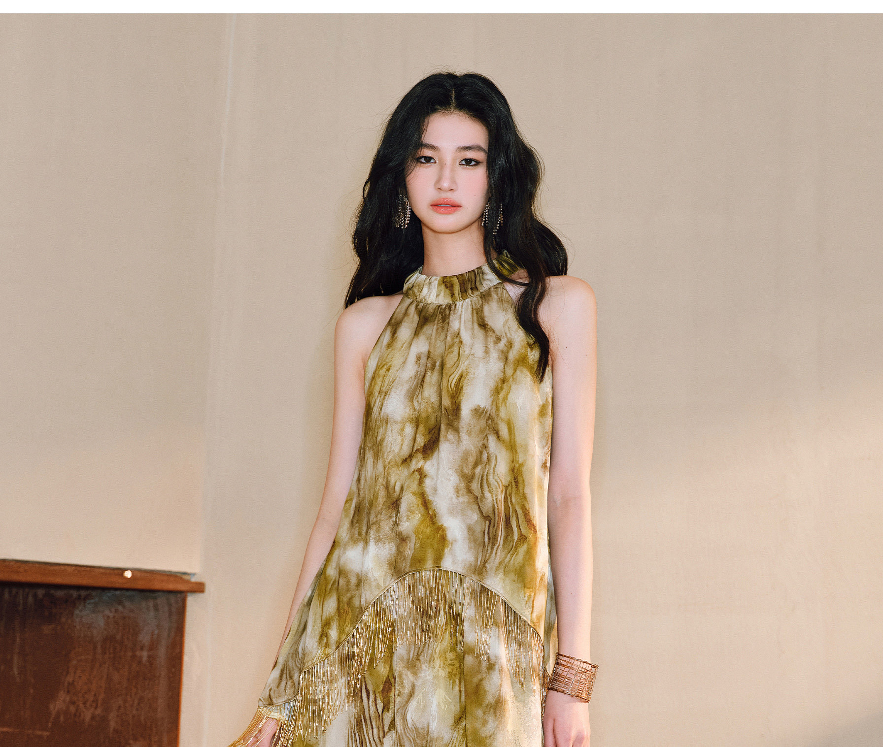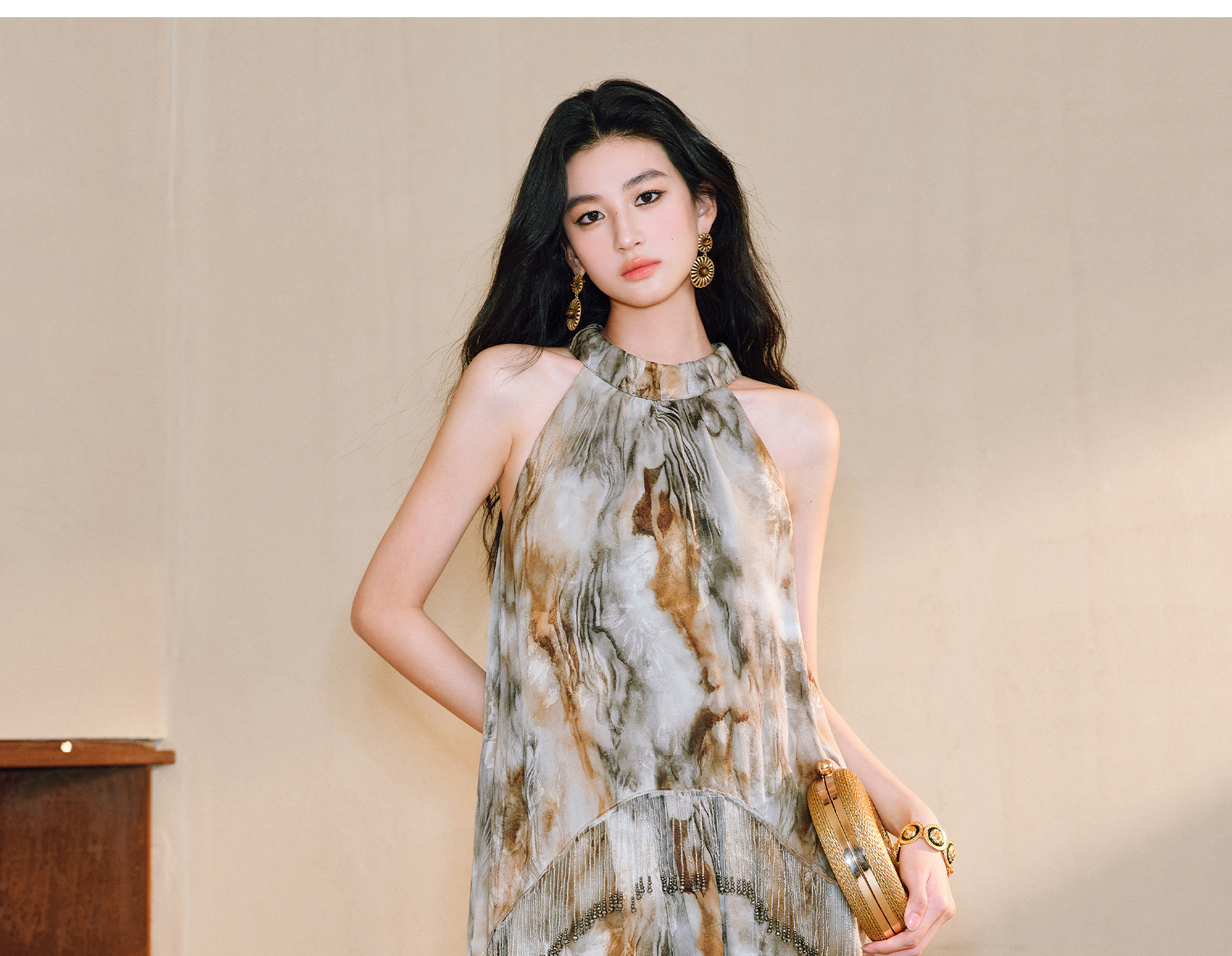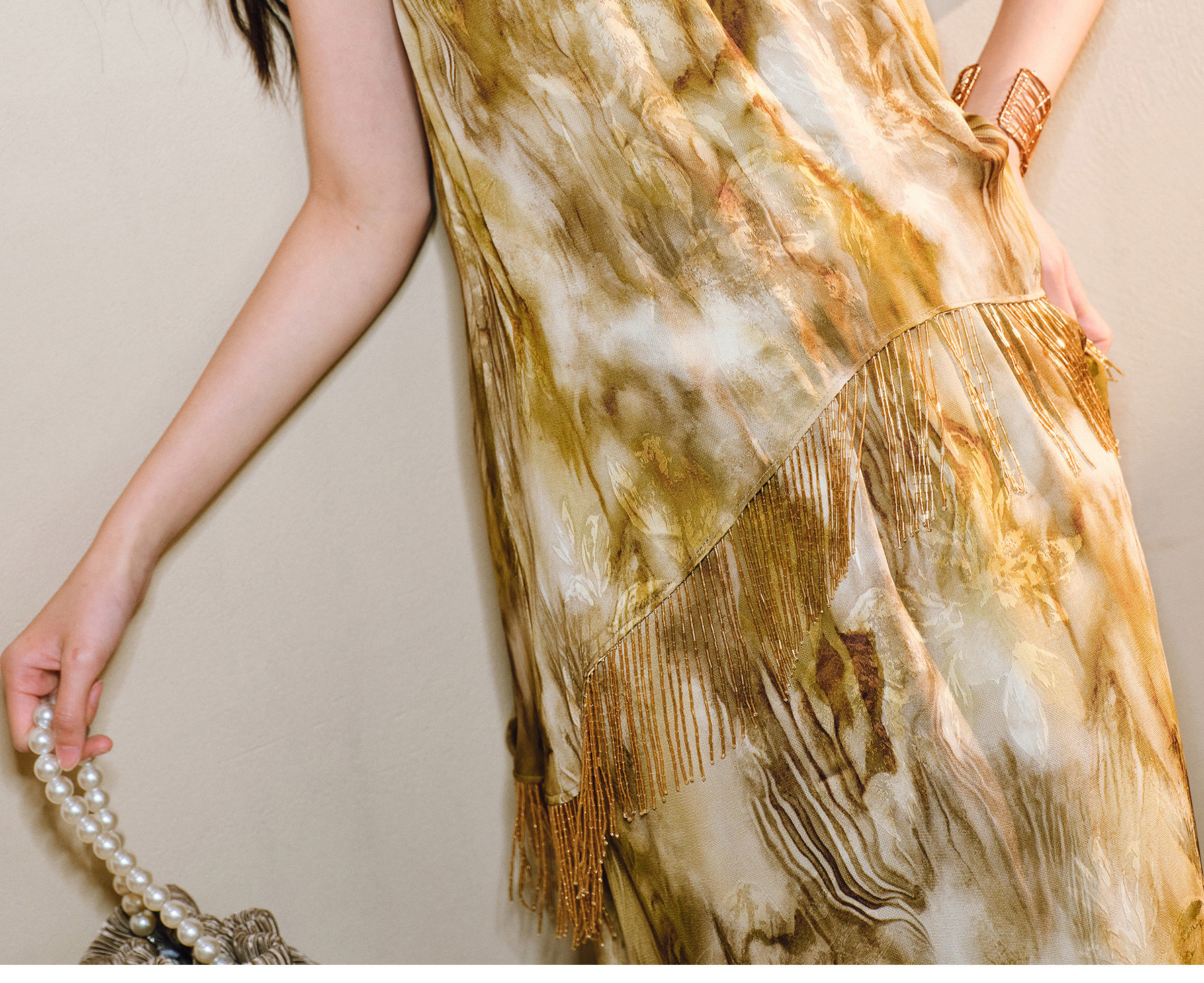 Wangxo|Oil Painting-Like Gorgeous Satin Jacquard|Beaded Tassel French and Italian Romantic Off-Shoulder Halter Dress
