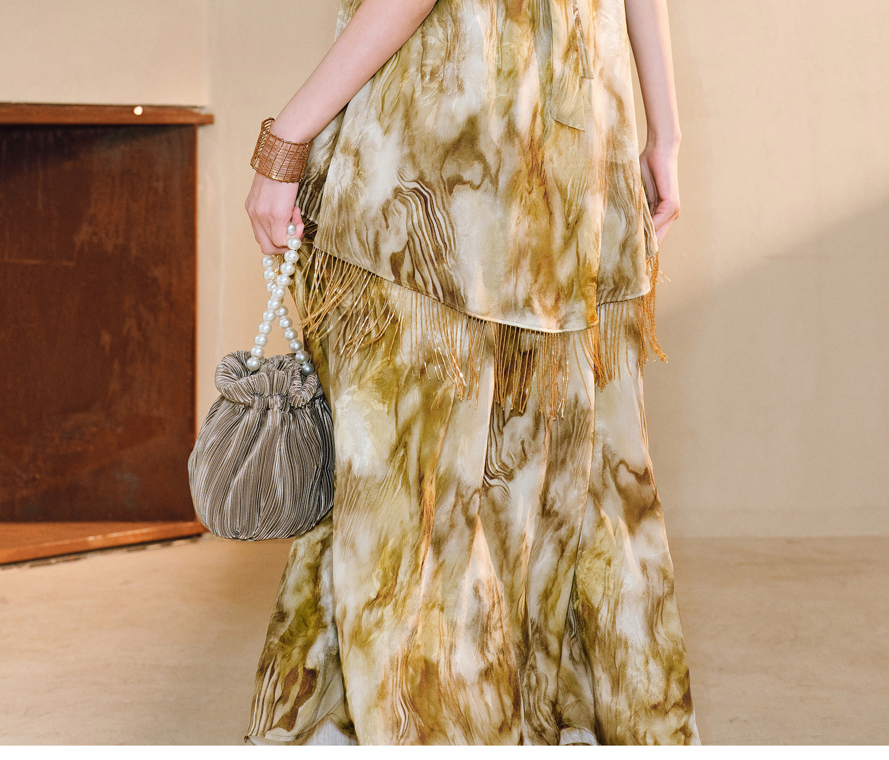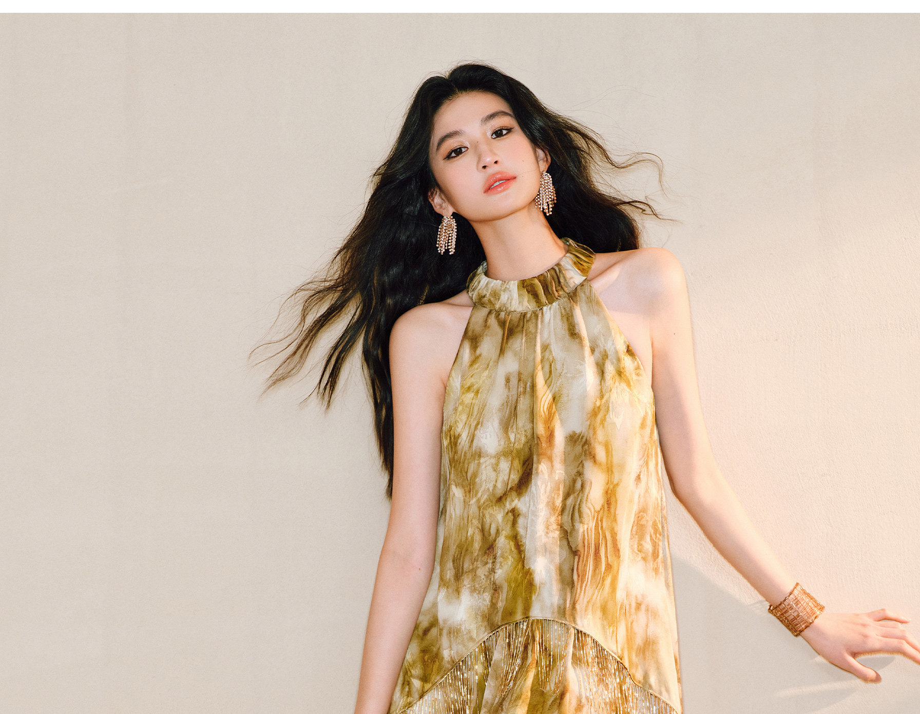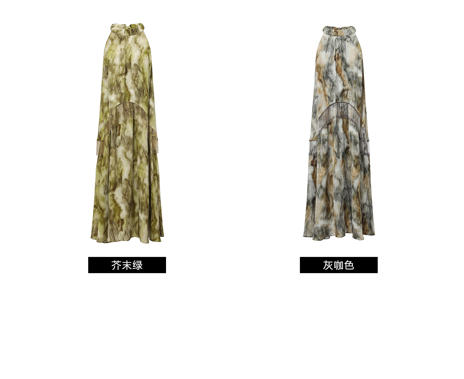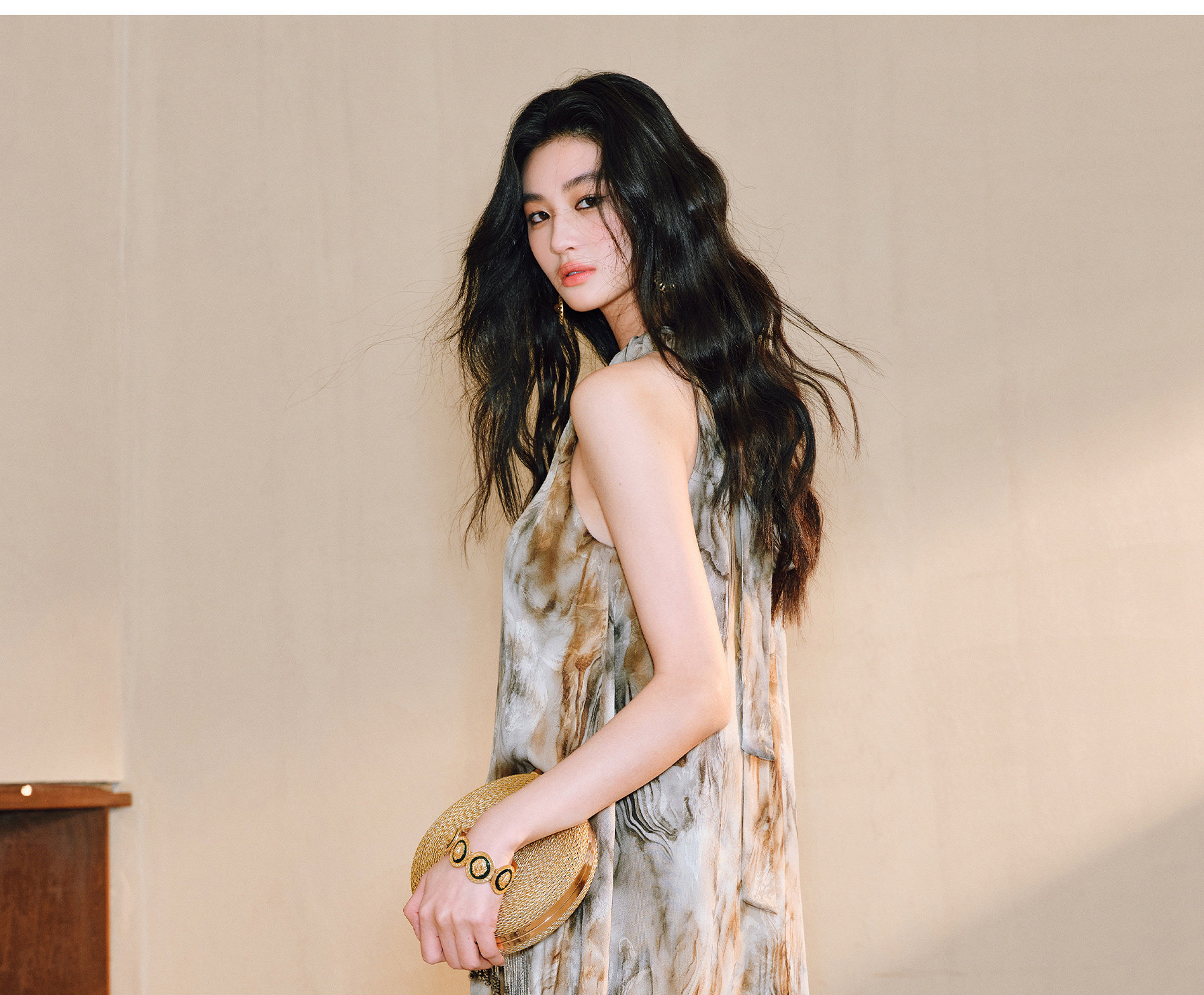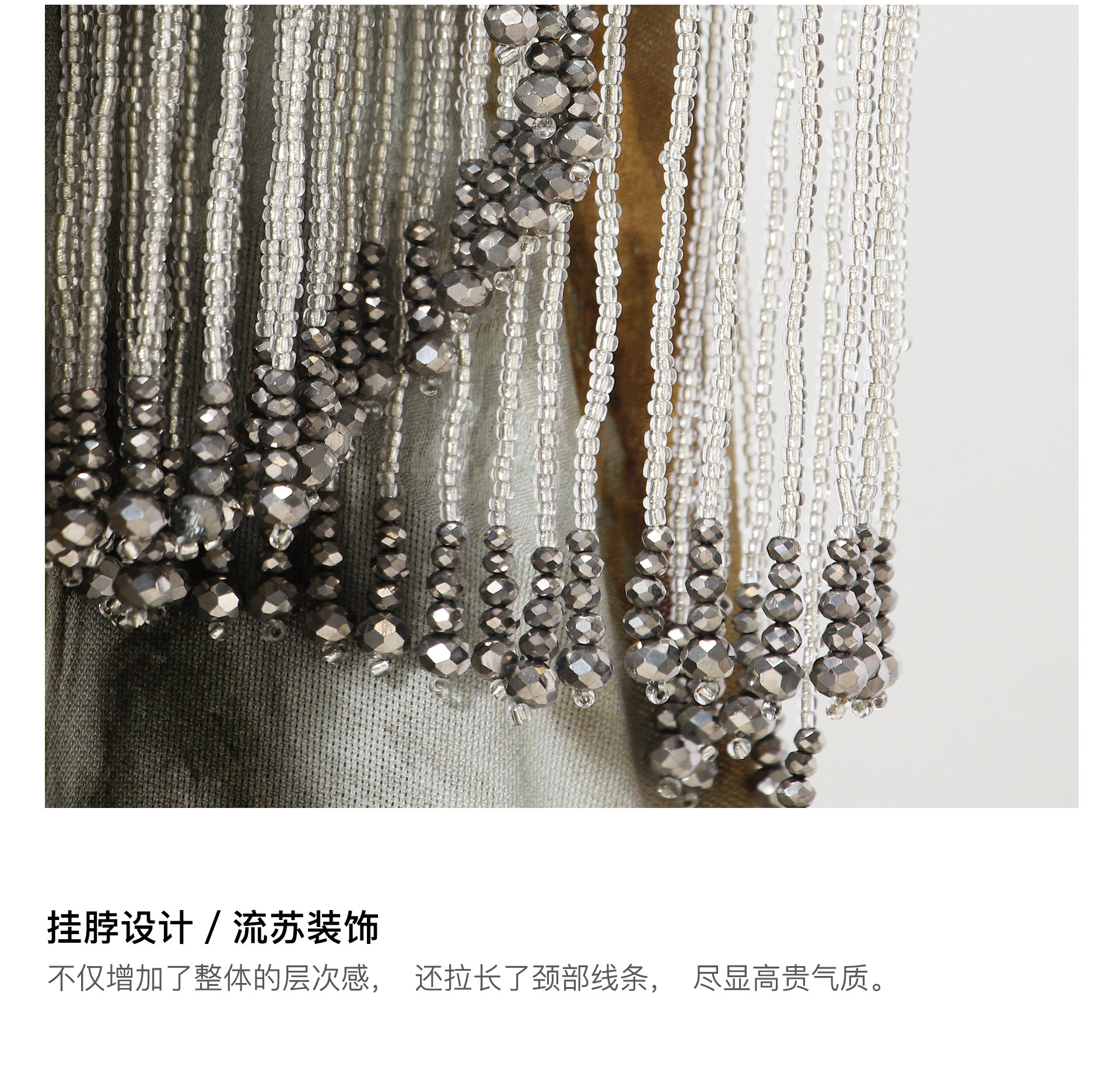 Wangxo|Oil Painting-Like Gorgeous Satin Jacquard|Beaded Tassel French and Italian Romantic Off-Shoulder Halter Dress