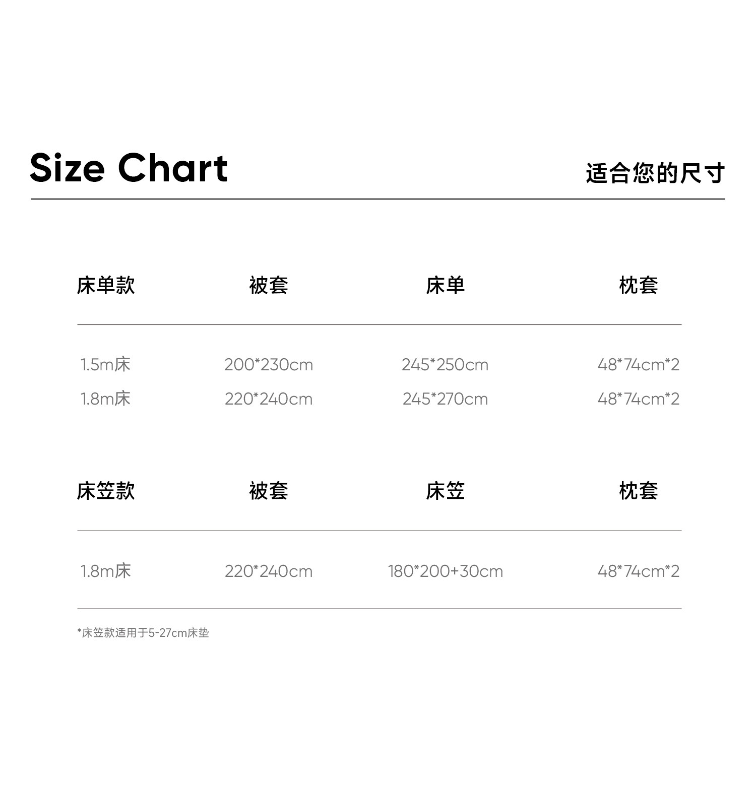 适用床尺寸 1.5/1.8m床单款四件套【适用200*230cm被芯】,1.8/2.0m床单款四件套【适用220*240cm被芯】,1.8m床笠款四件套【适用220*240cm被芯】