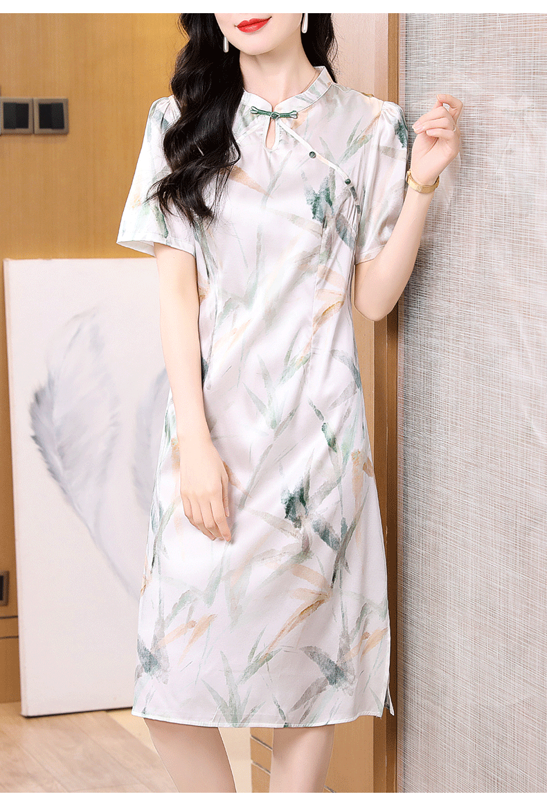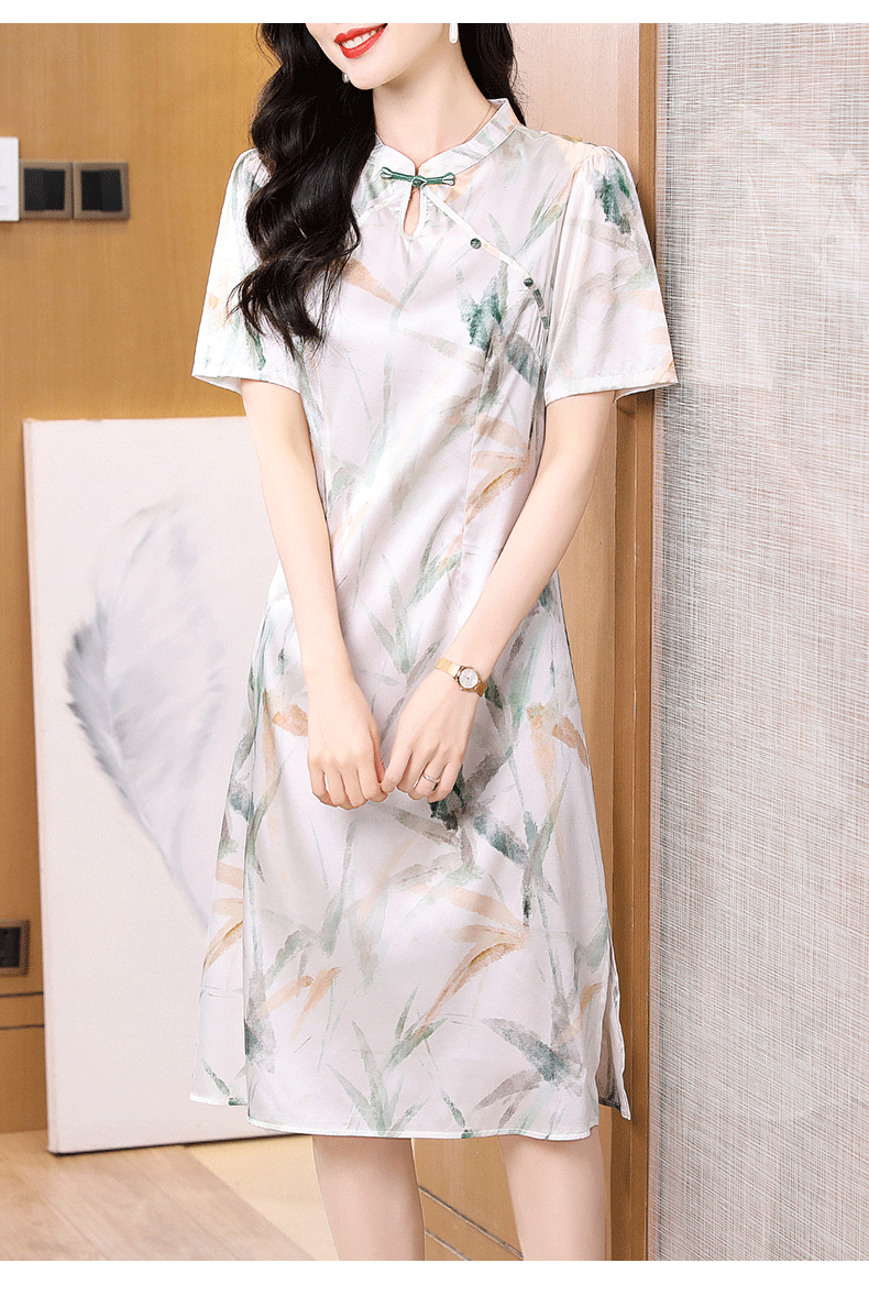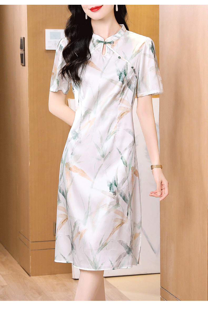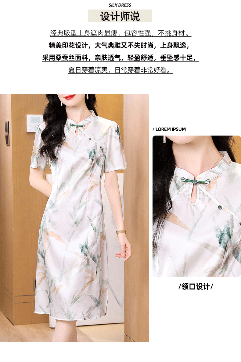 真丝连衣裙女2025新款夏短袖V领印花真丝裙子妈妈装国风减龄显瘦