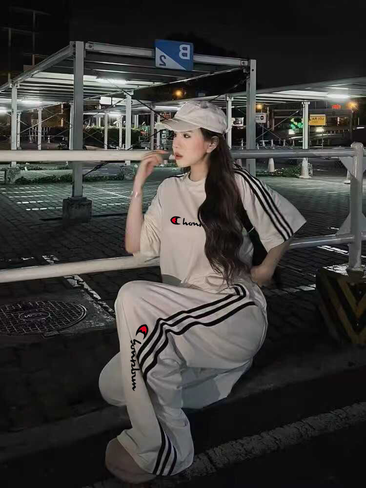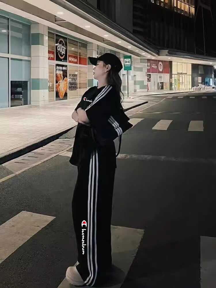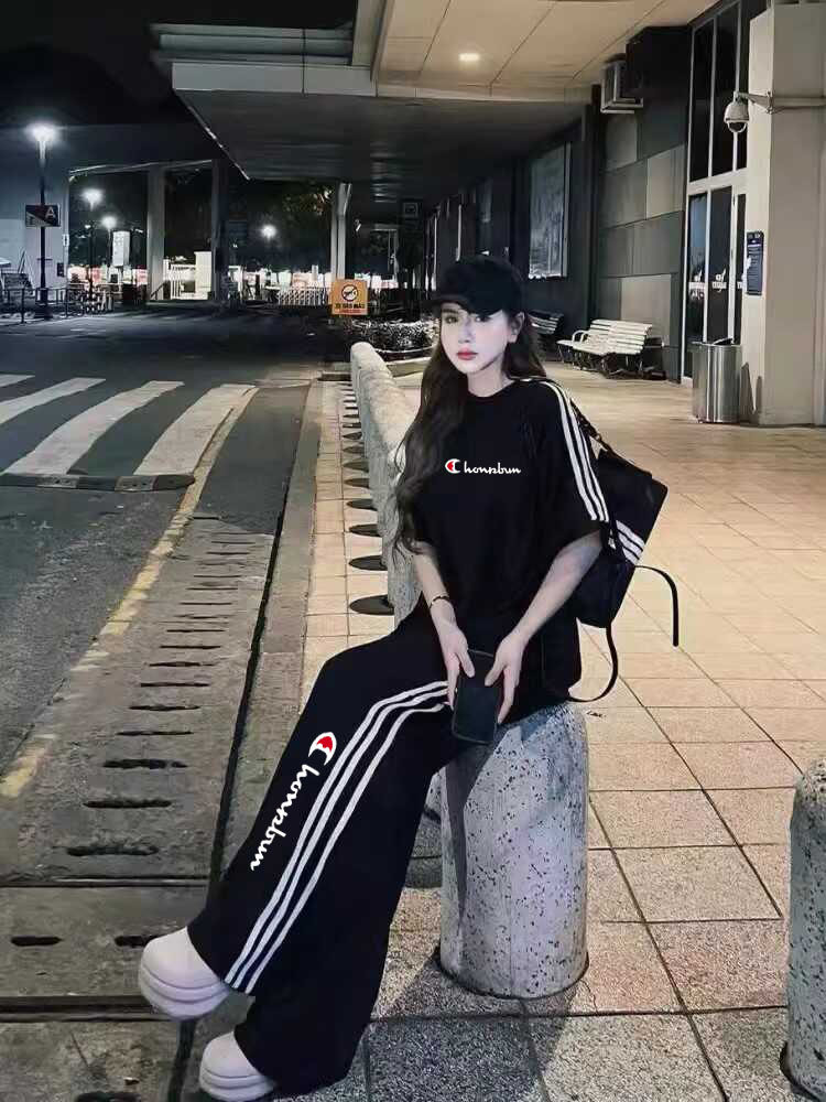冠军彩虹黑色宽松显瘦运动套装女夏季时尚炸街短袖长裤休闲两件套