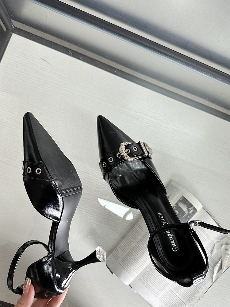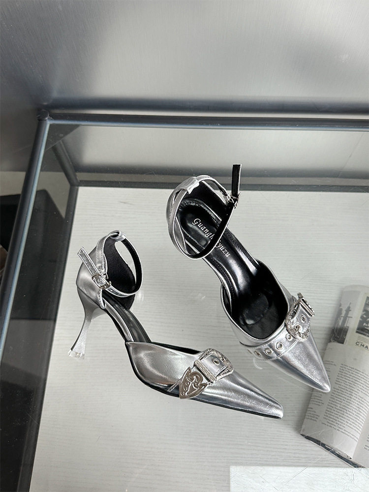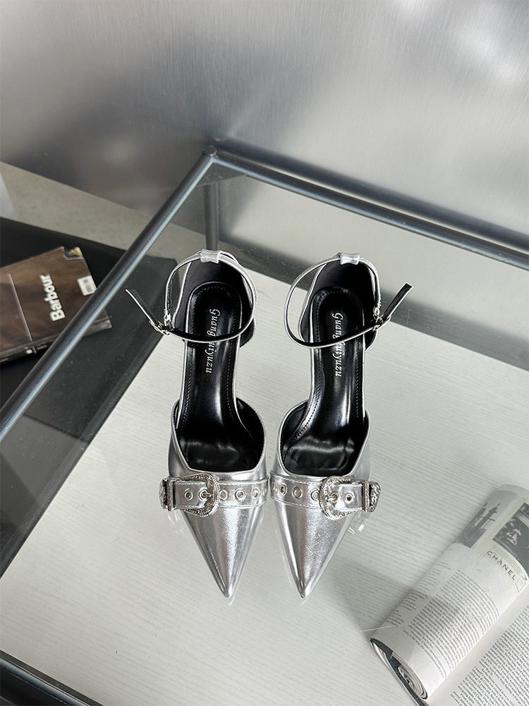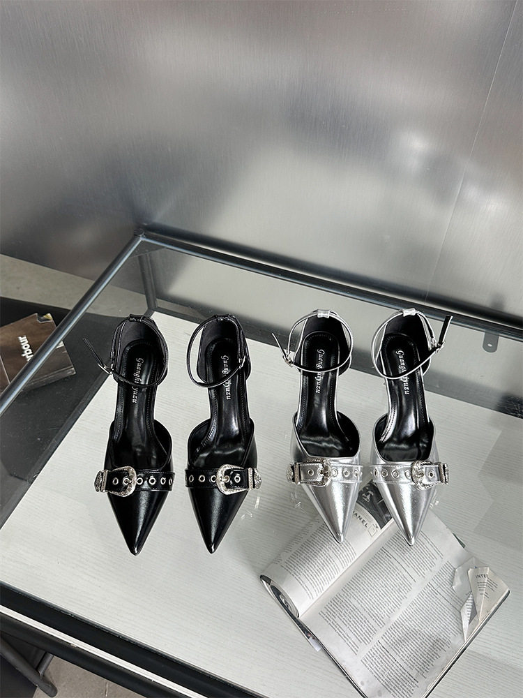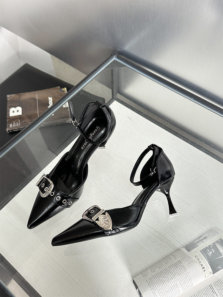 French-Style Buckle Strap Sandals, European and American Style High Heels, Mid-Heel, Sexy, Niche Single Shoes for Women, Metallic Black Pointed Toe