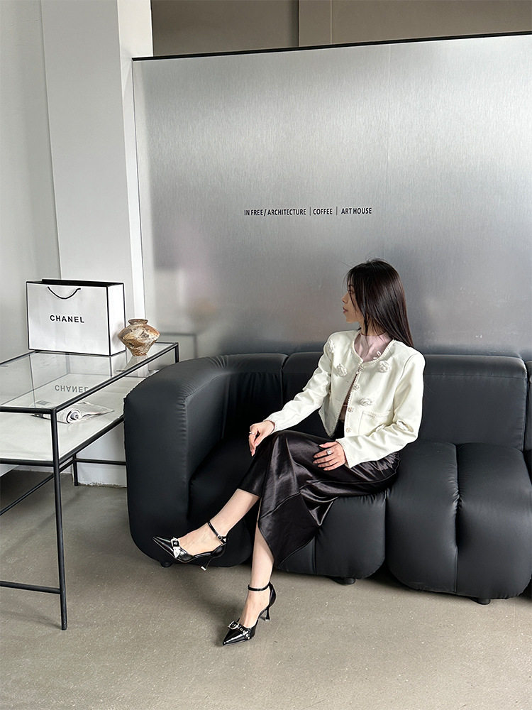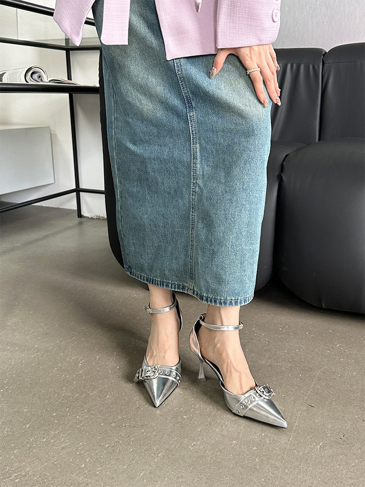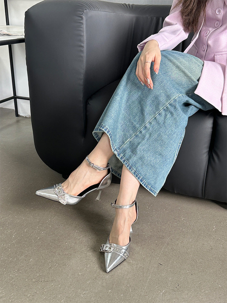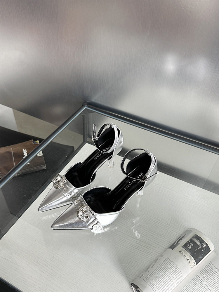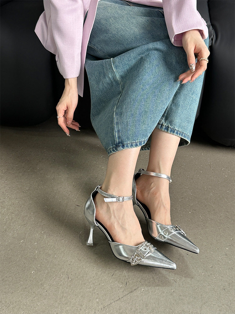 French-Style Buckle Strap Sandals, European and American Style High Heels, Mid-Heel, Sexy, Niche Single Shoes for Women, Metallic Black Pointed Toe