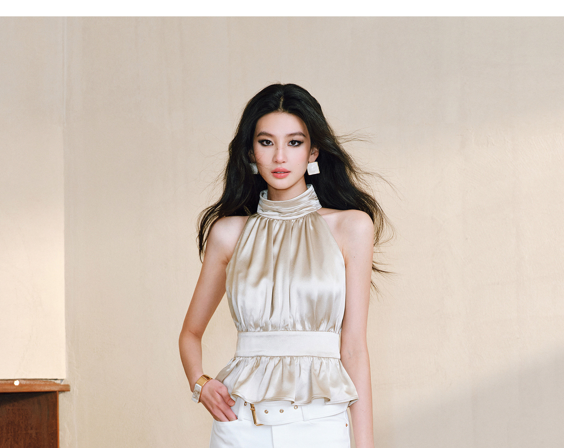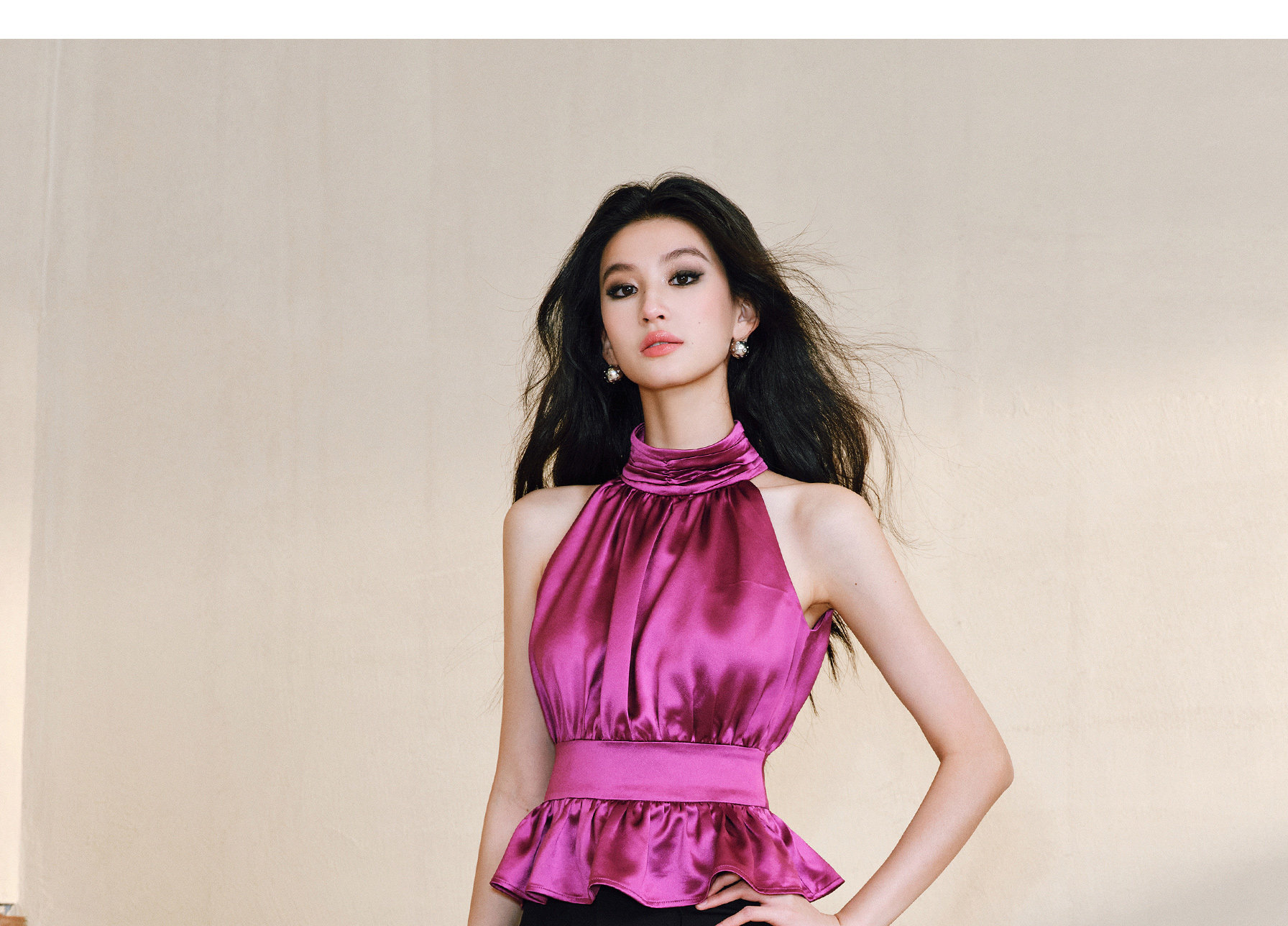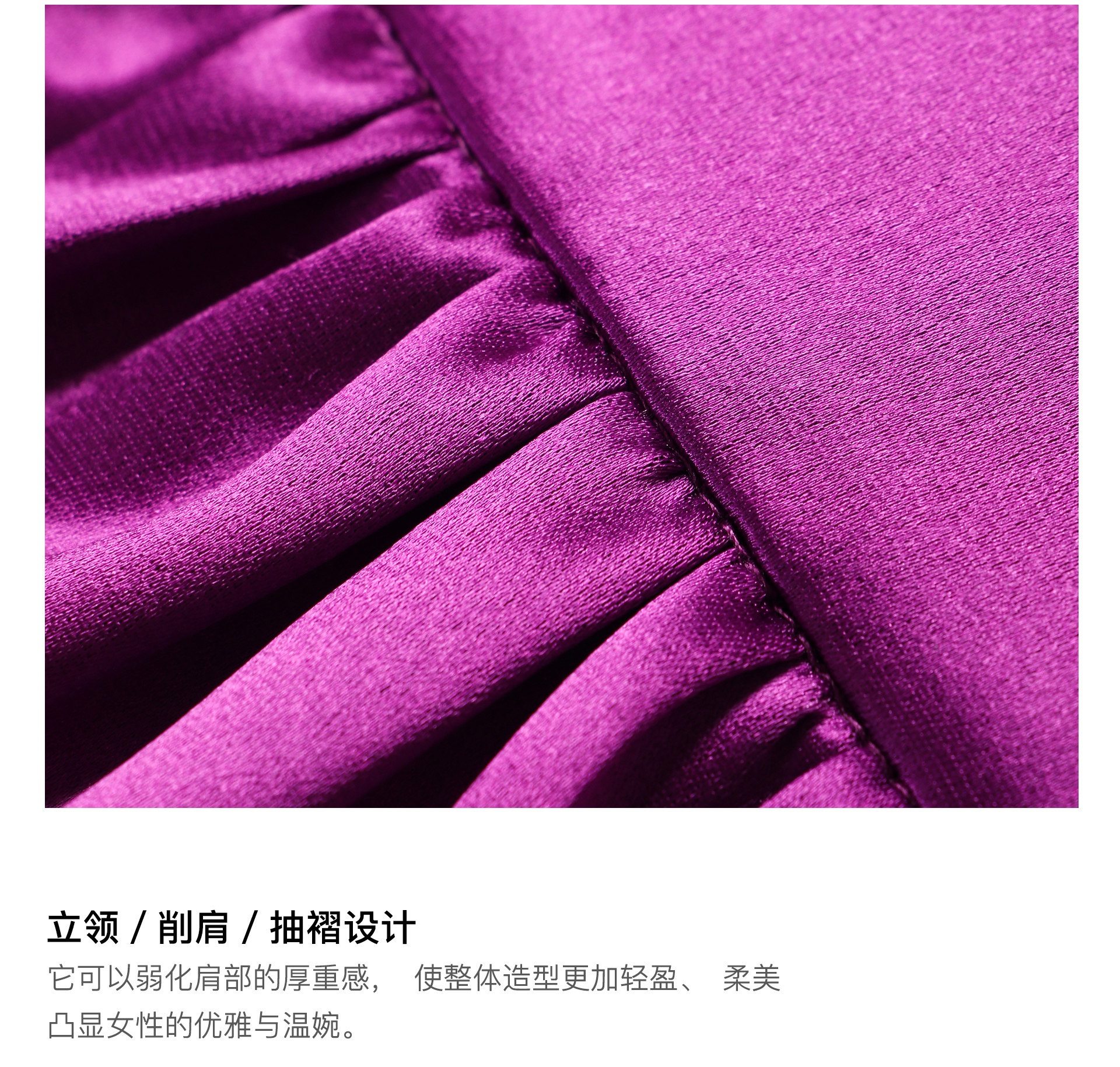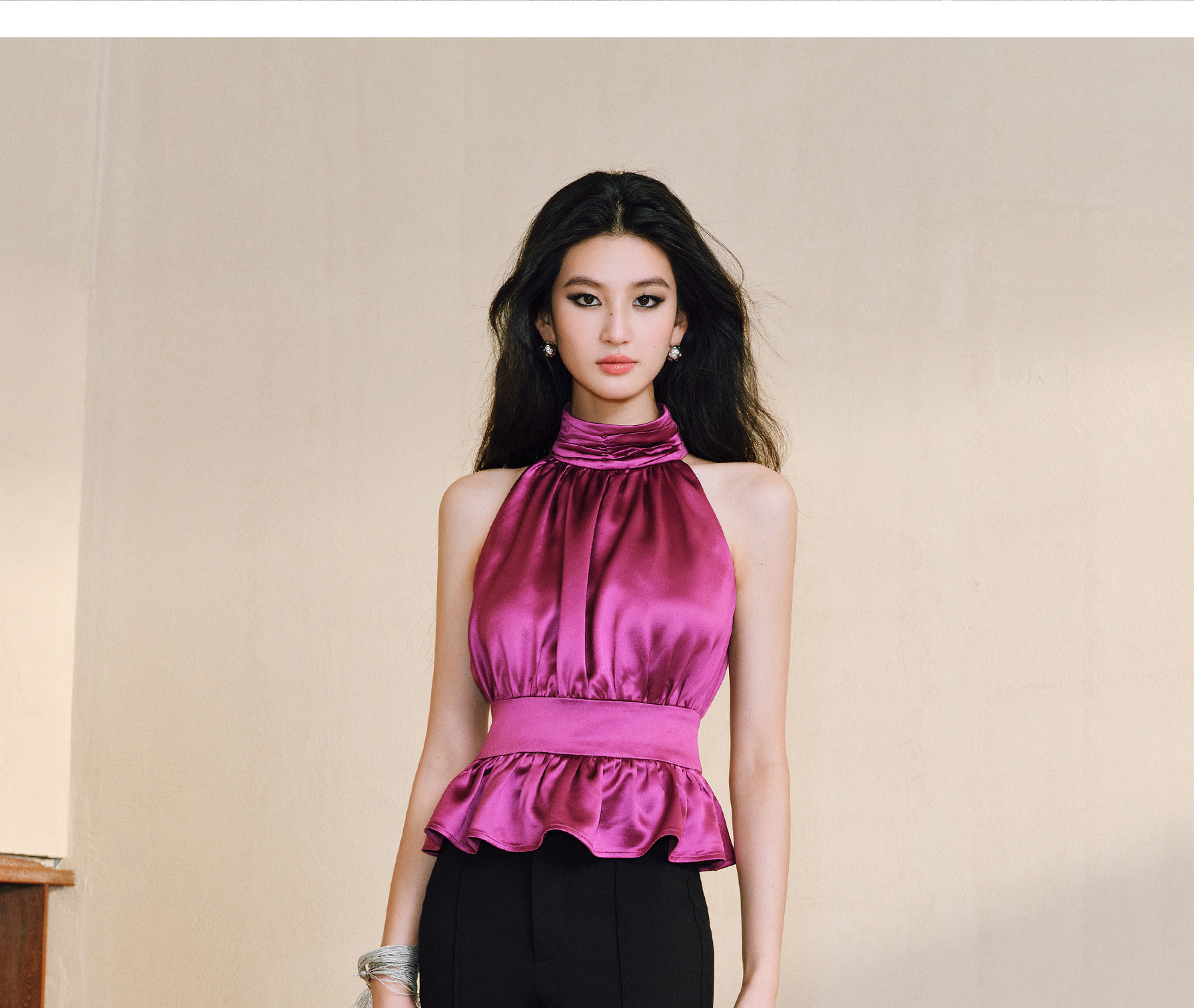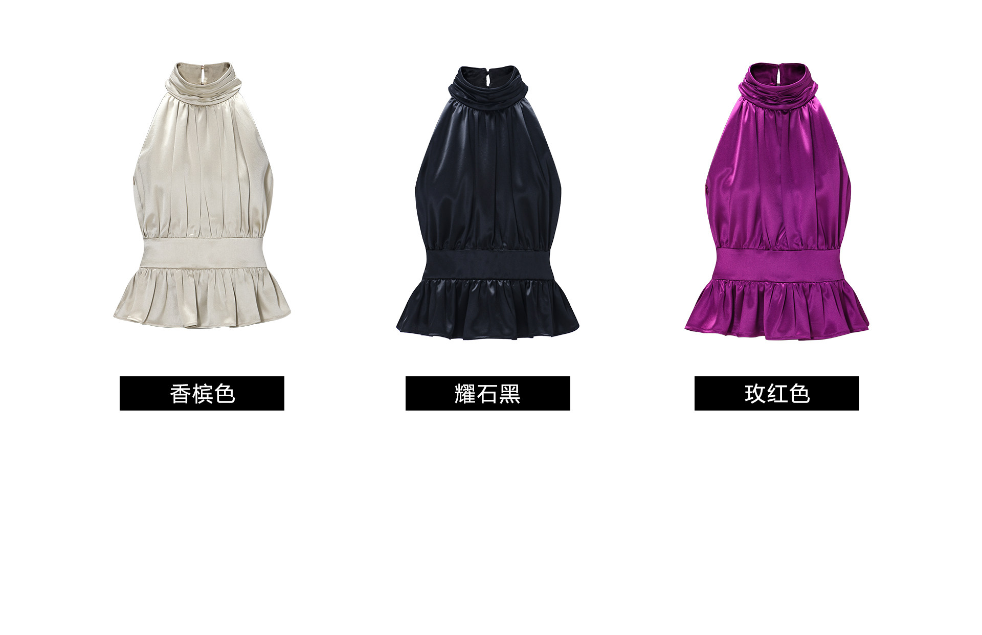 Wangxo|Luxurious Acetate Satin with a Silky Feel That Penetrates the Skin|Stand Collar, Cut-Out Shoulders, Romantic Aesthetic, Ruched Waist, Flared Hem Top
