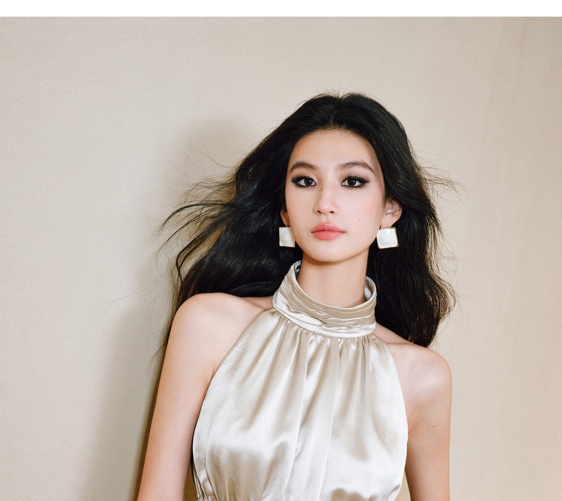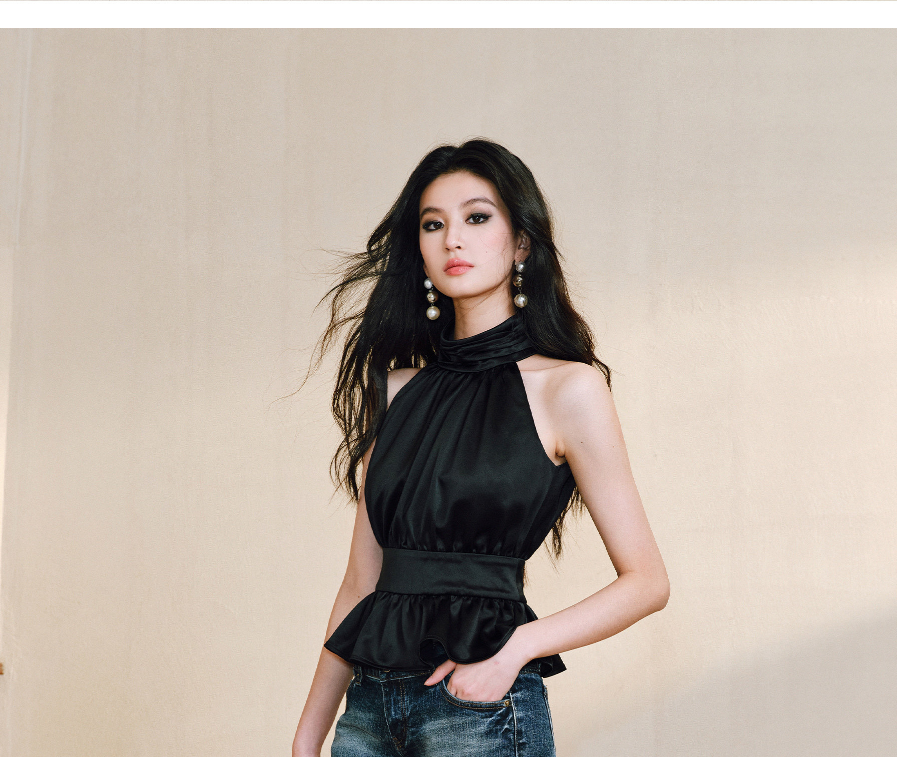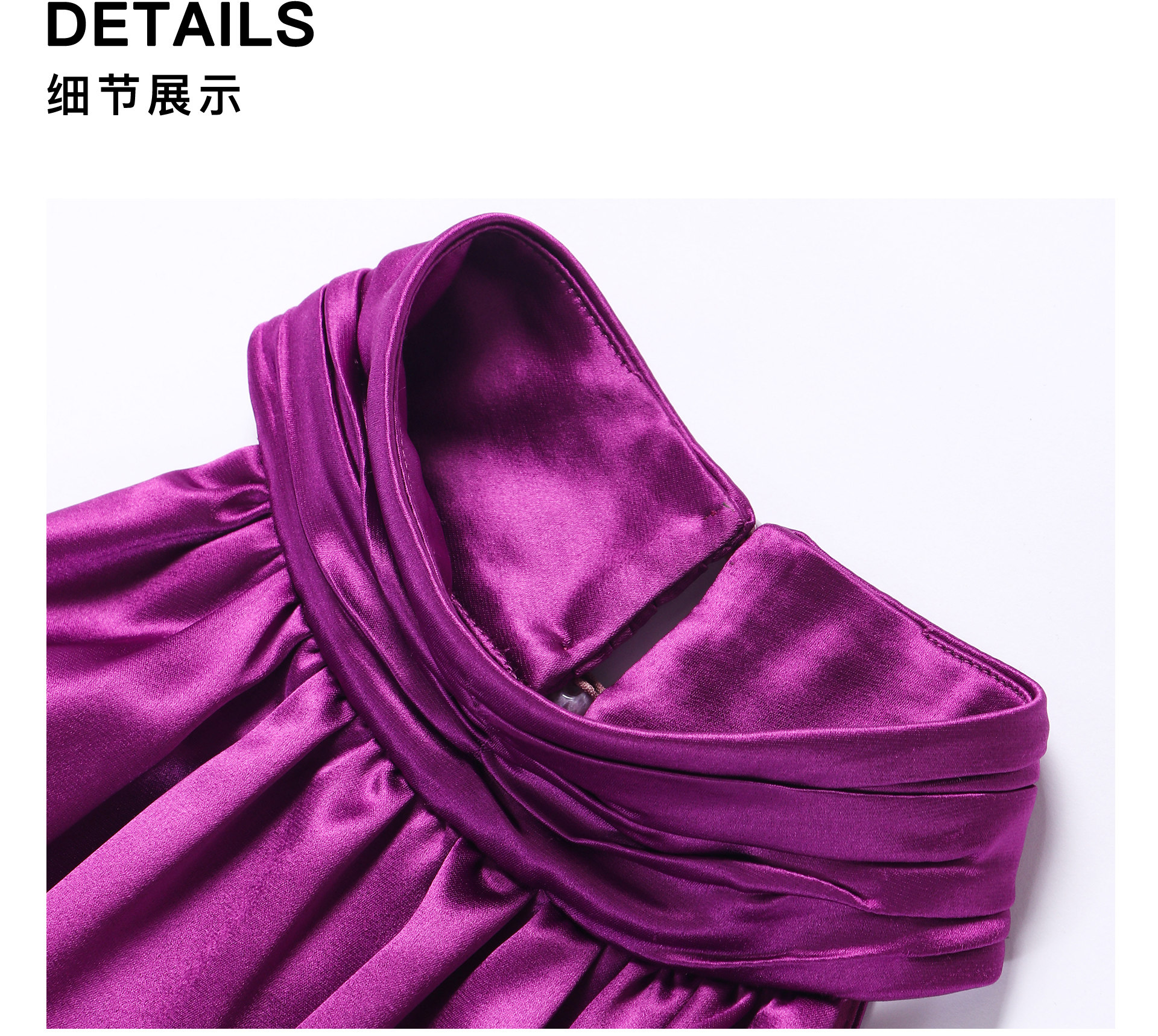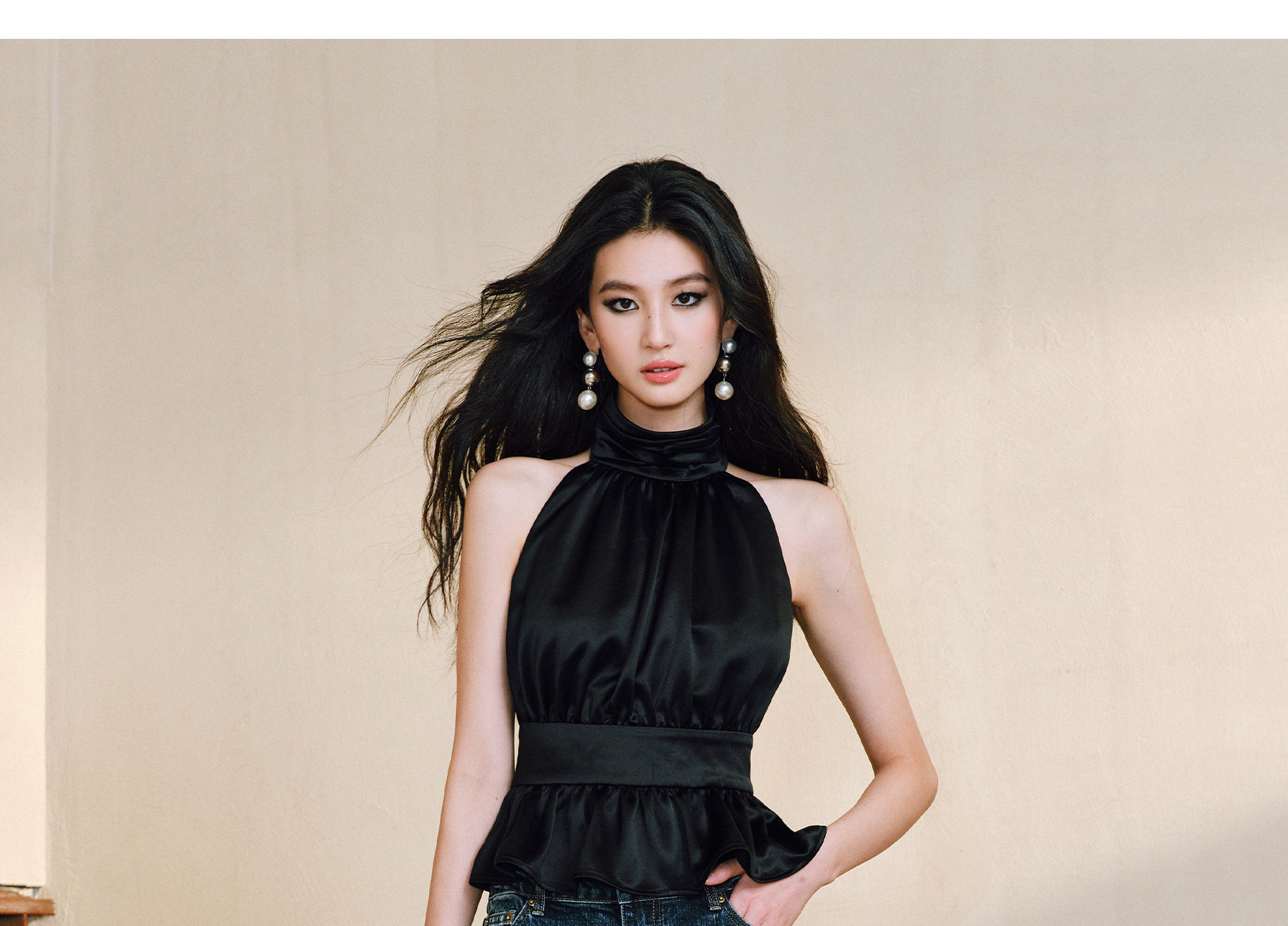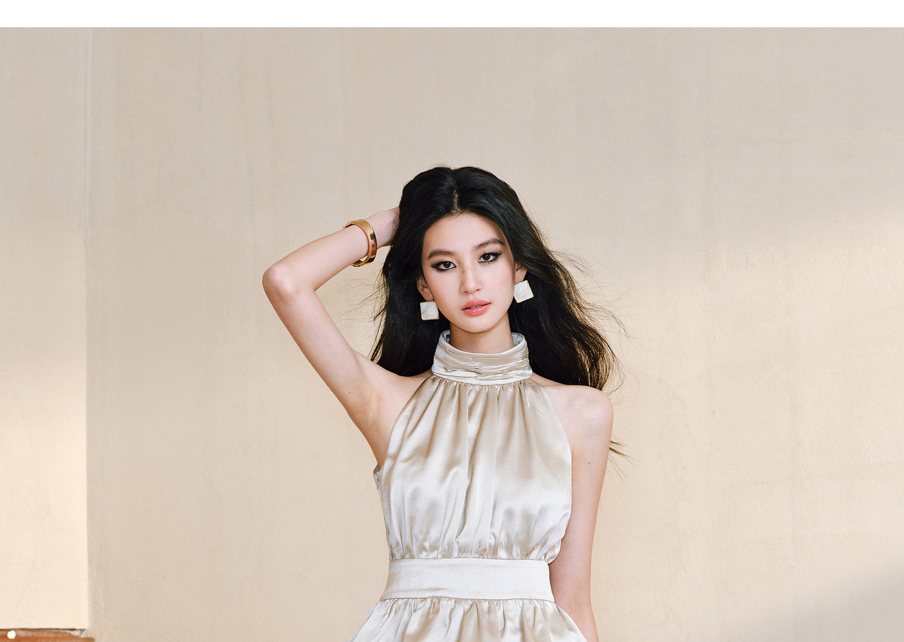Wangxo|Luxurious Acetate Satin with a Silky Feel That Penetrates the Skin|Stand Collar, Cut-Out Shoulders, Romantic Aesthetic, Ruched Waist, Flared Hem Top