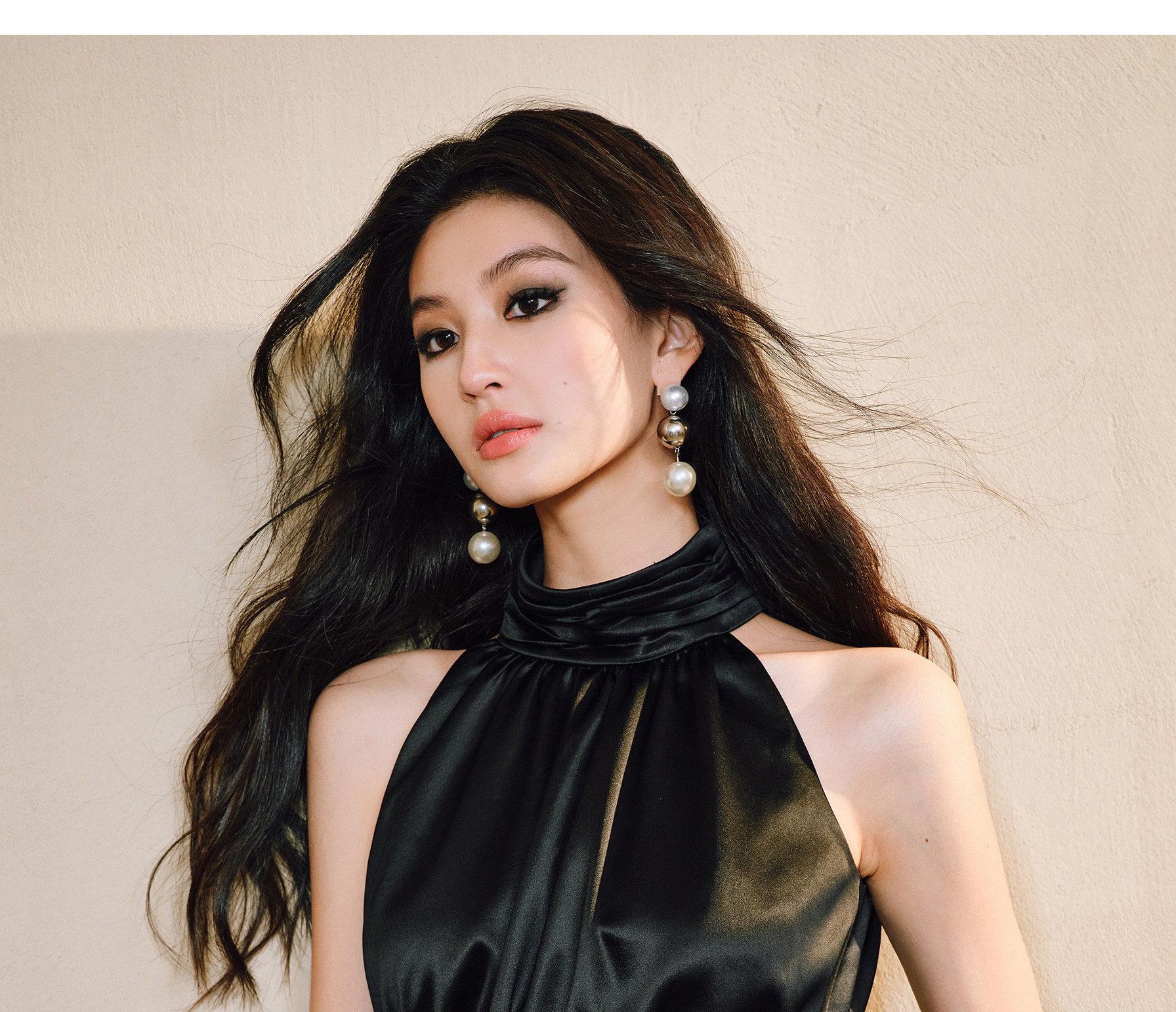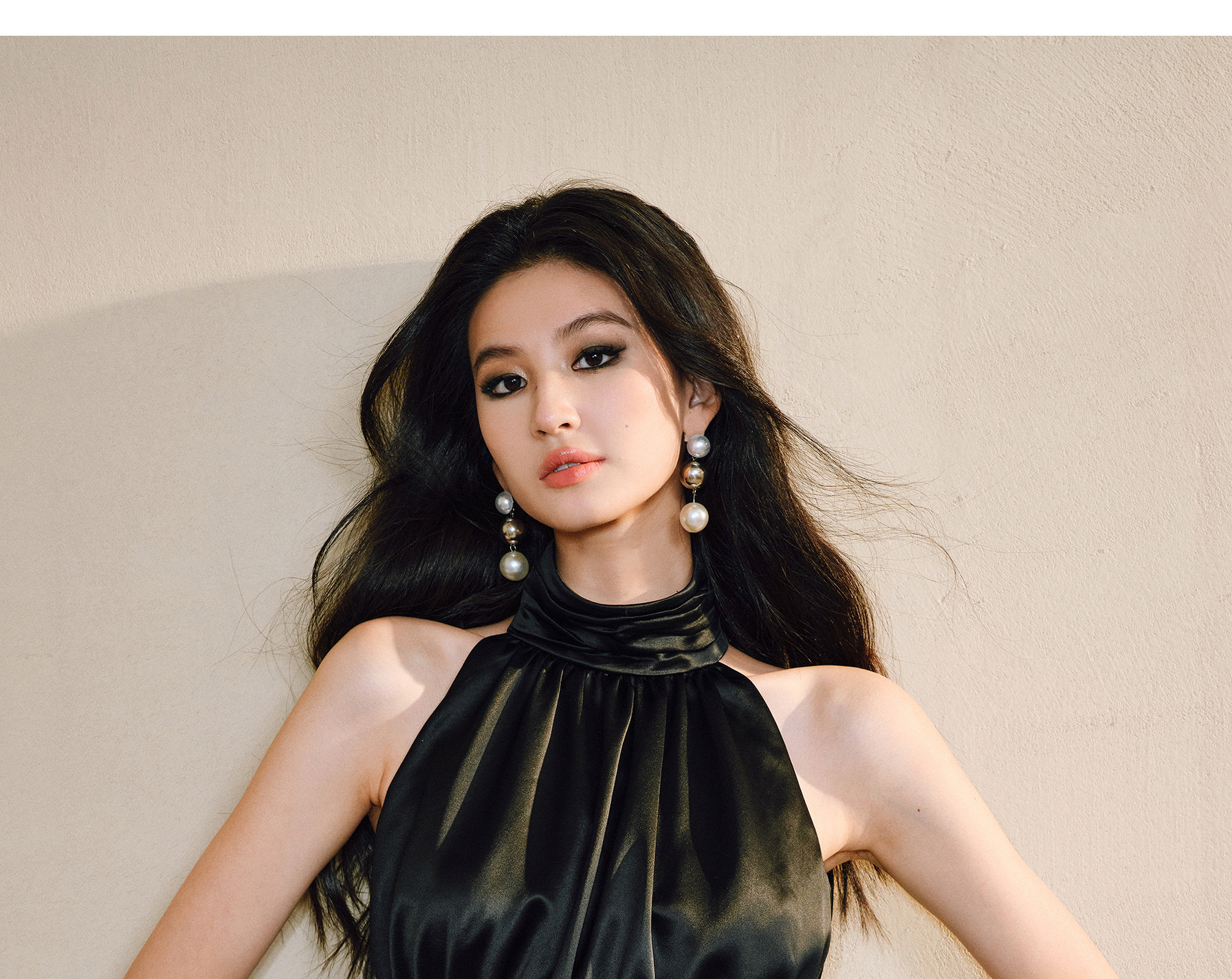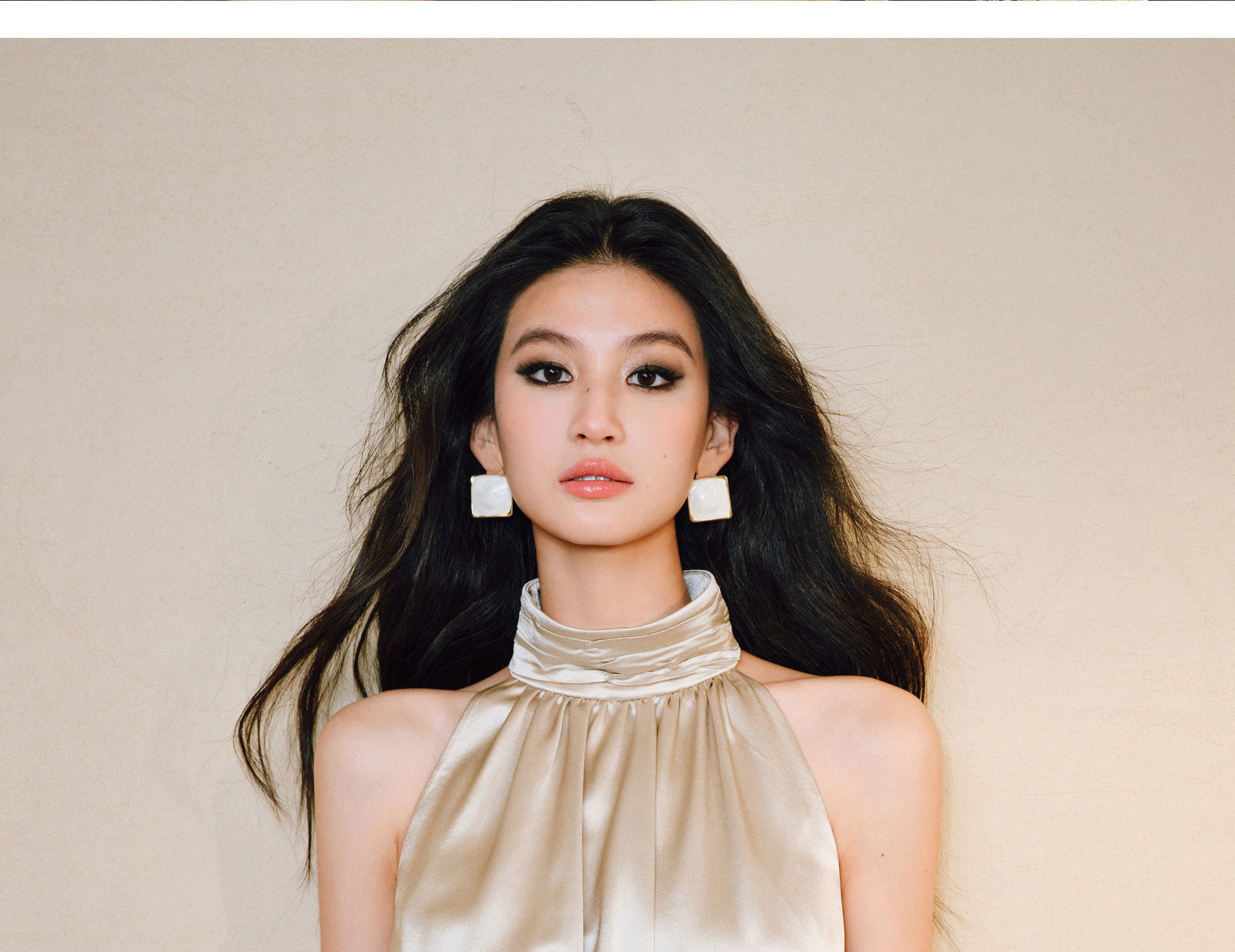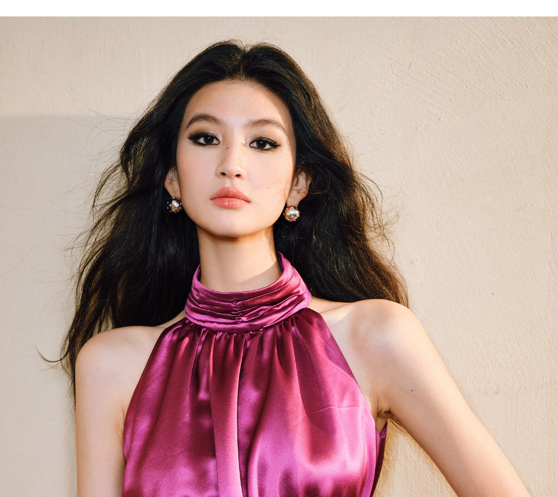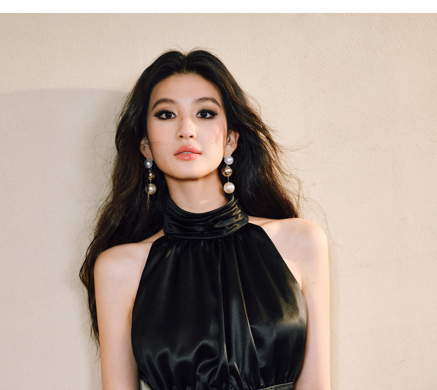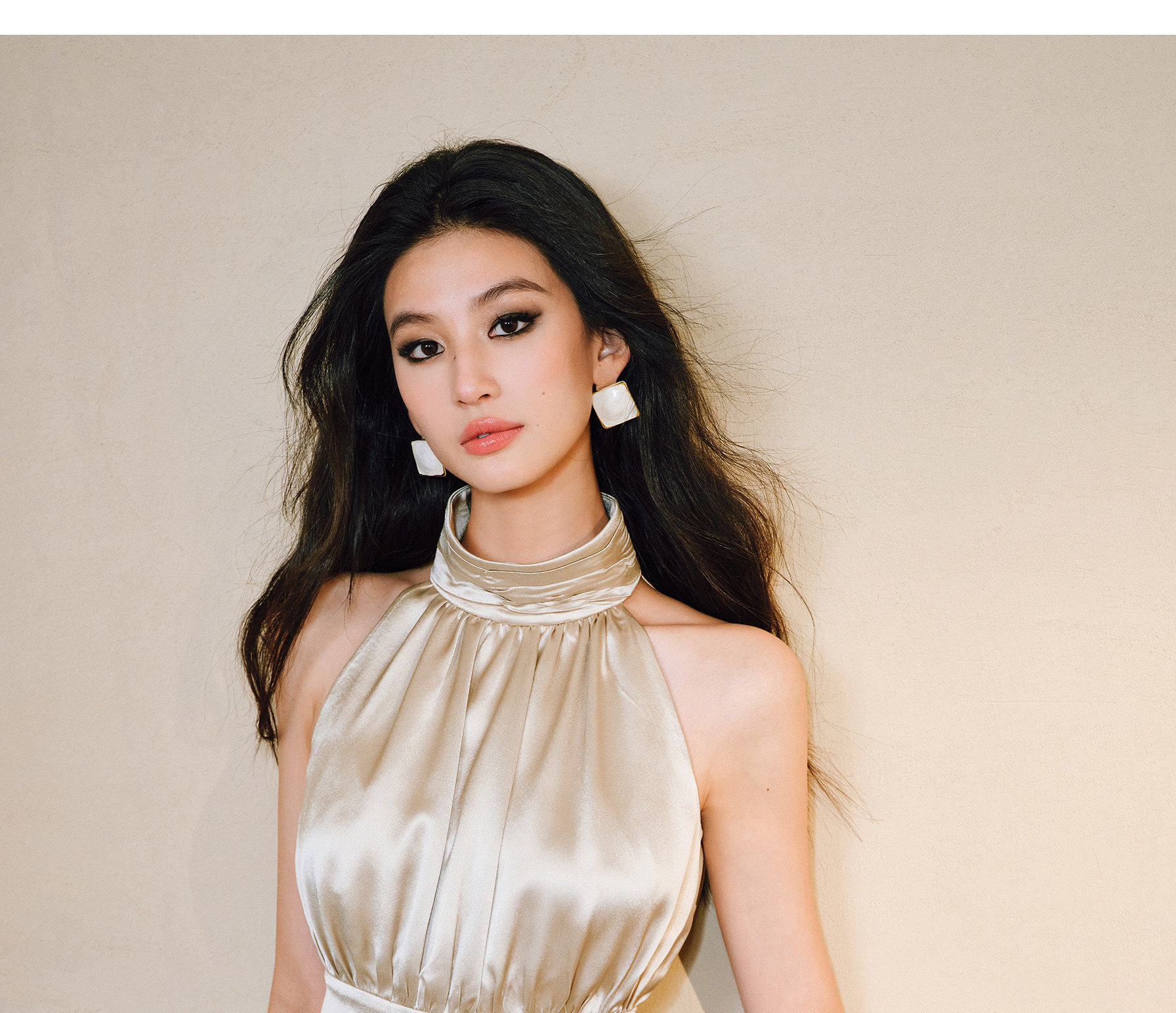 Wangxo|Luxurious Acetate Satin with a Silky Feel That Penetrates the Skin|Stand Collar, Cut-Out Shoulders, Romantic Aesthetic, Ruched Waist, Flared Hem Top