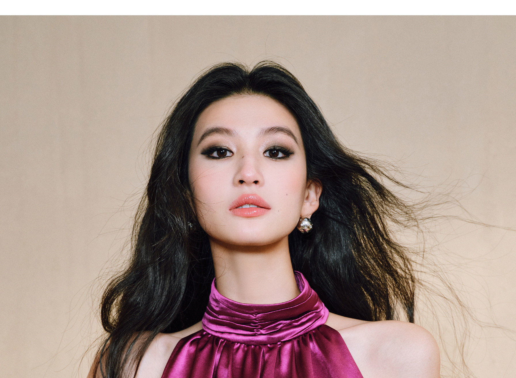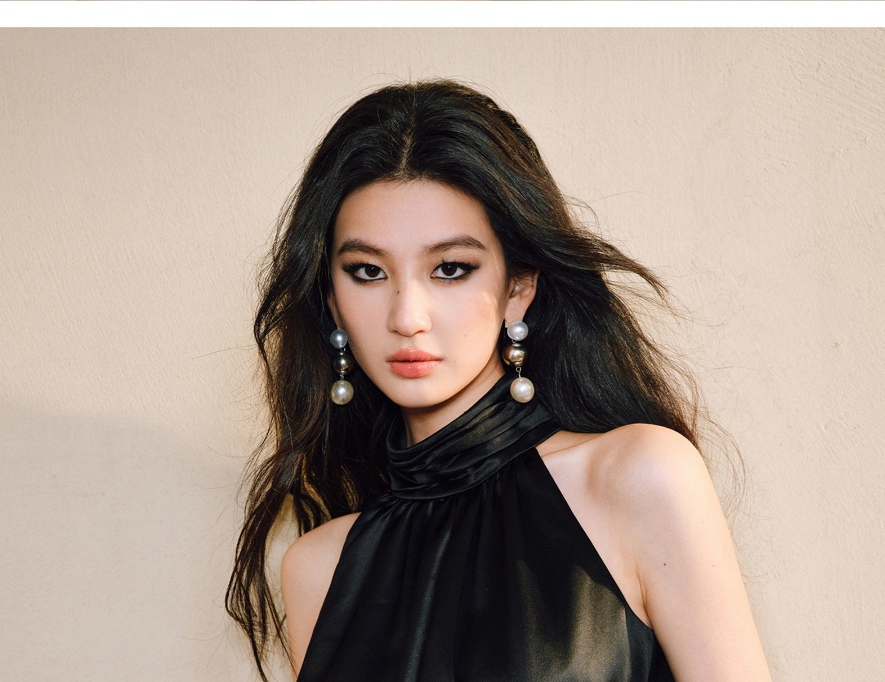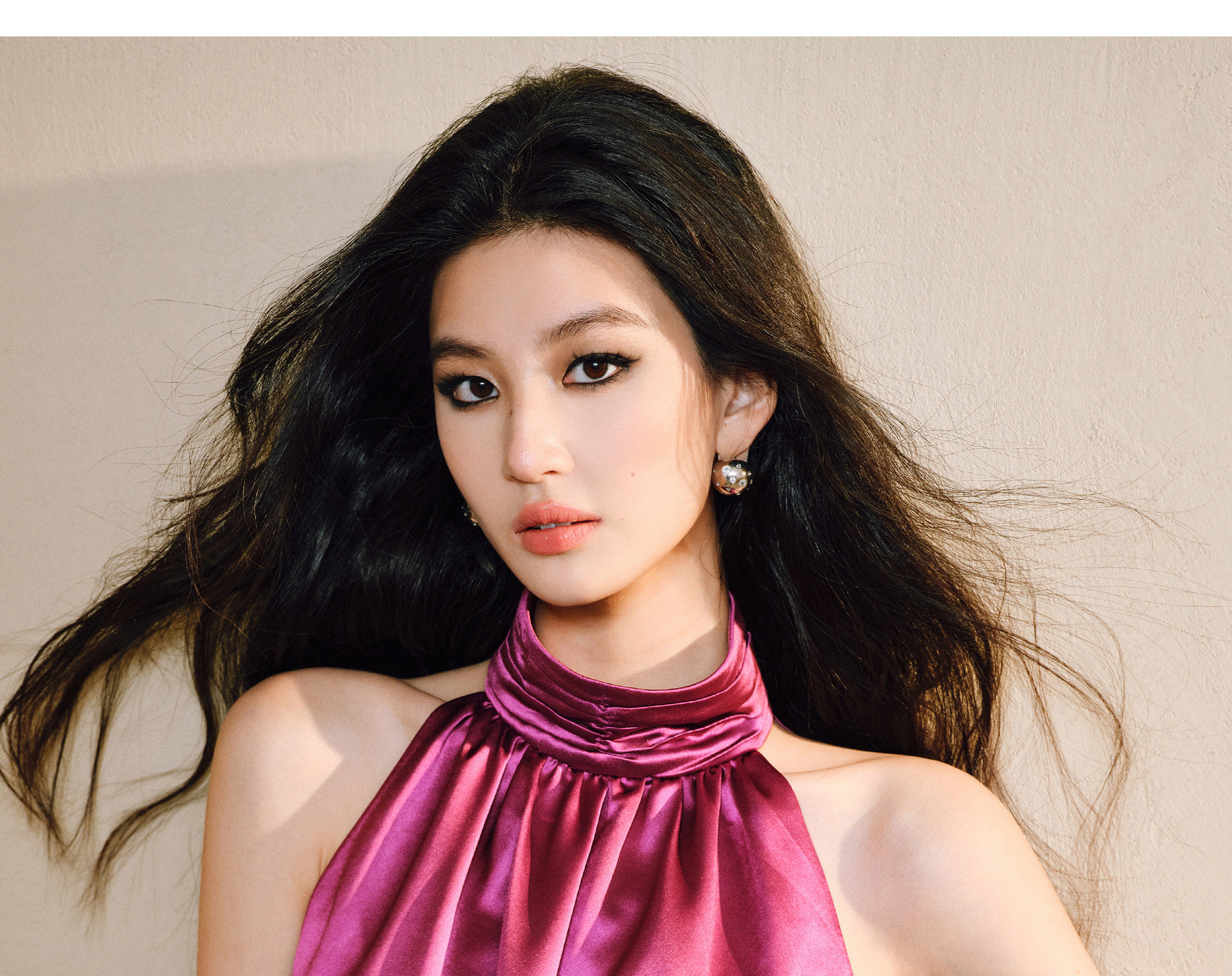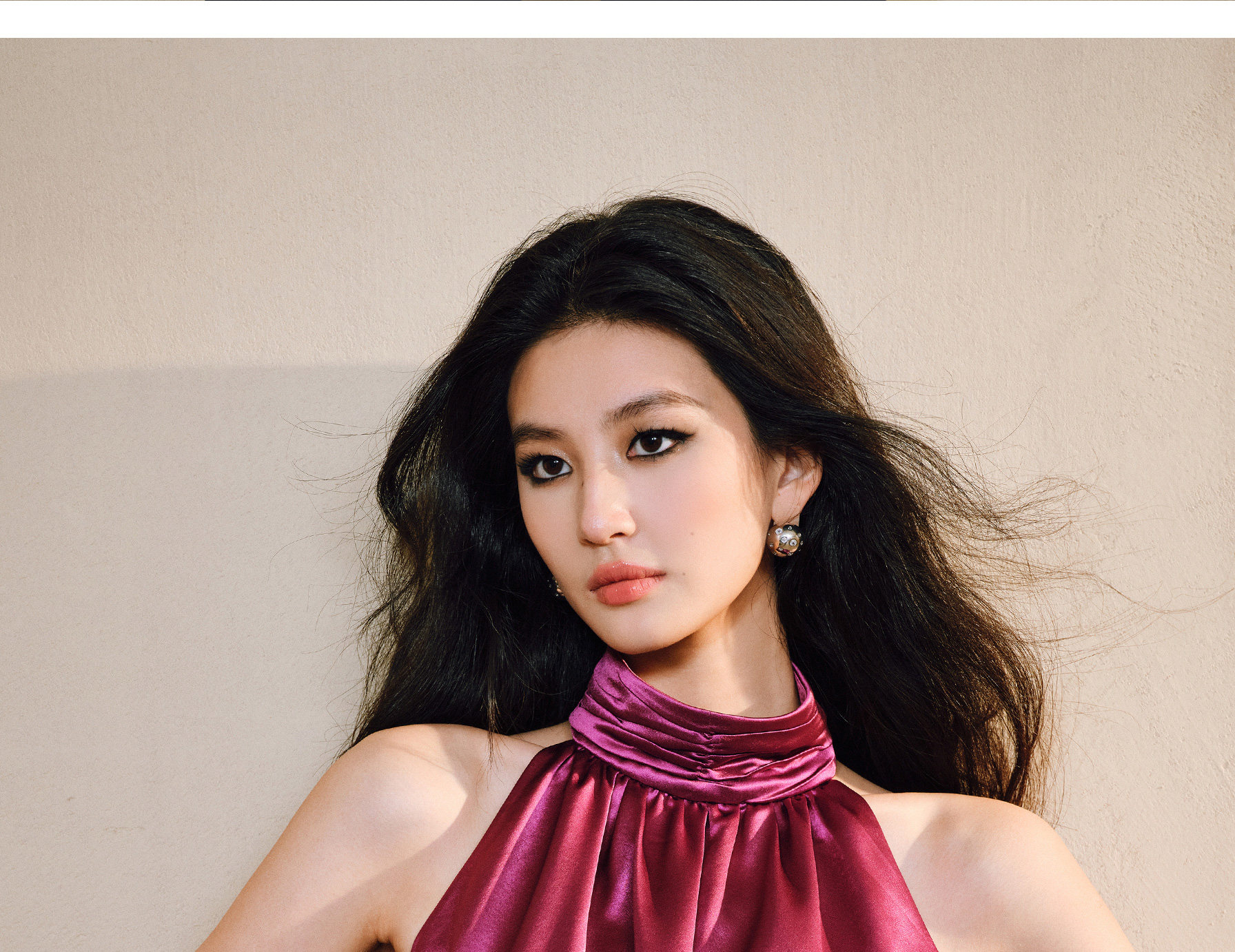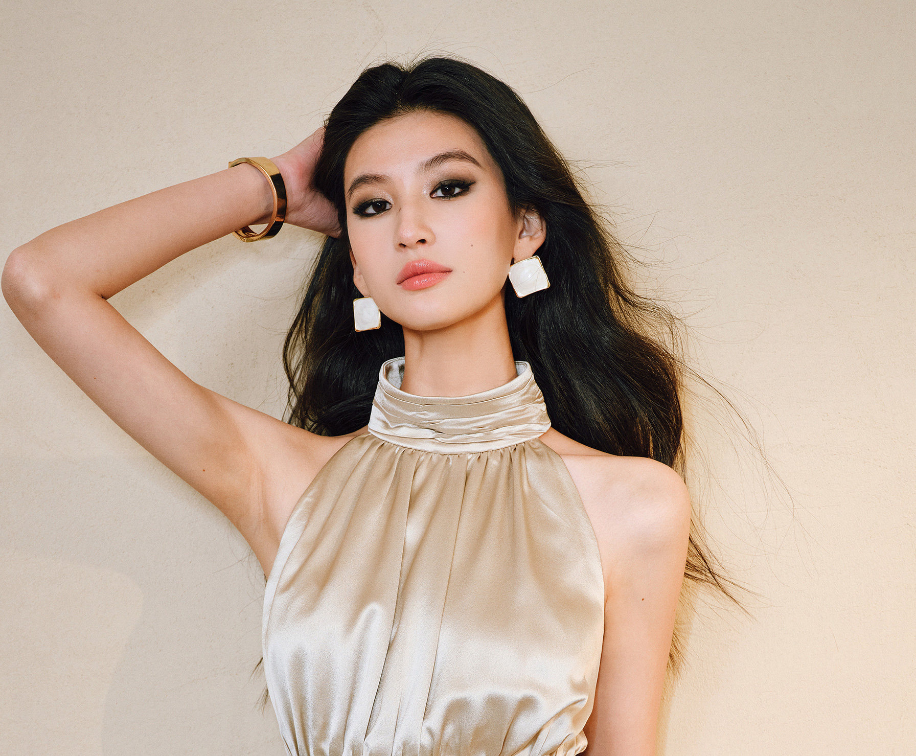 Wangxo|Luxurious Acetate Satin with a Silky Feel That Penetrates the Skin|Stand Collar, Cut-Out Shoulders, Romantic Aesthetic, Ruched Waist, Flared Hem Top