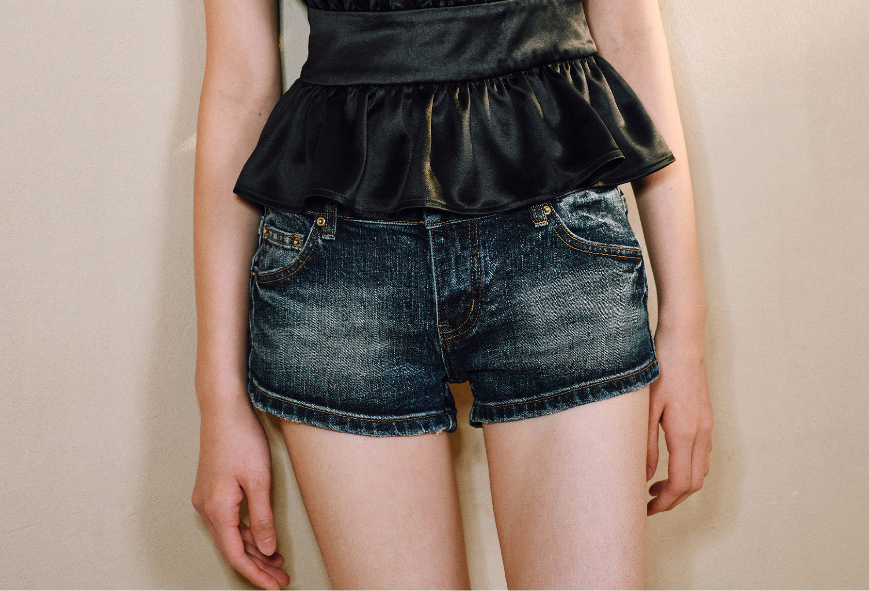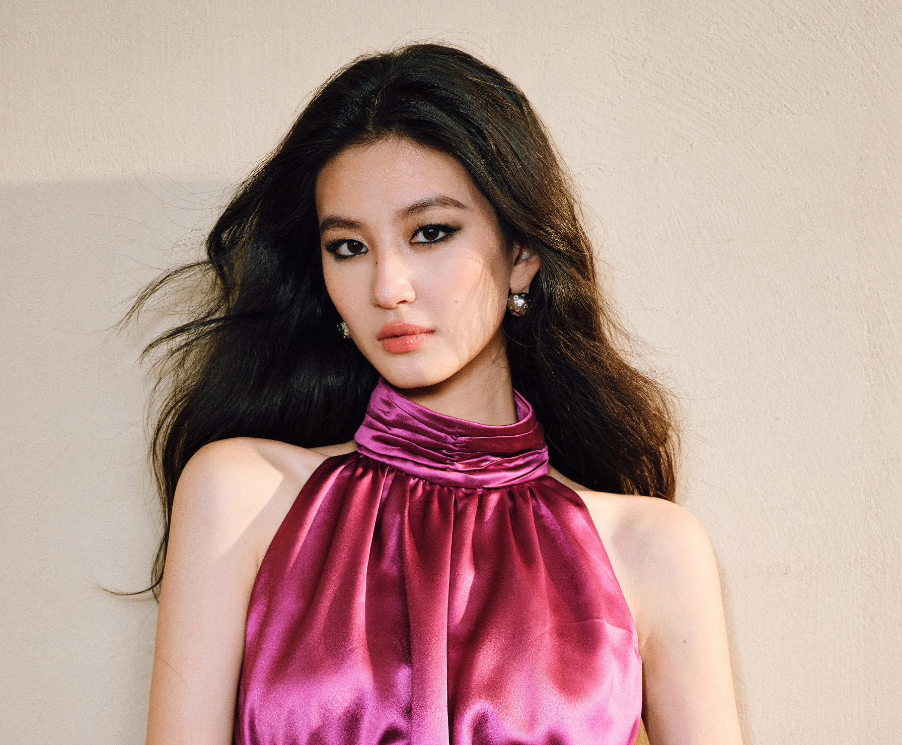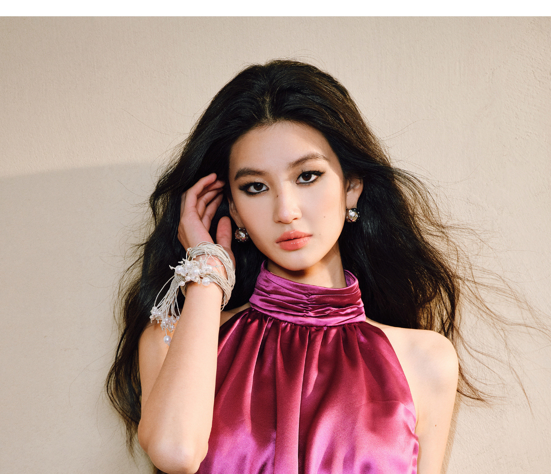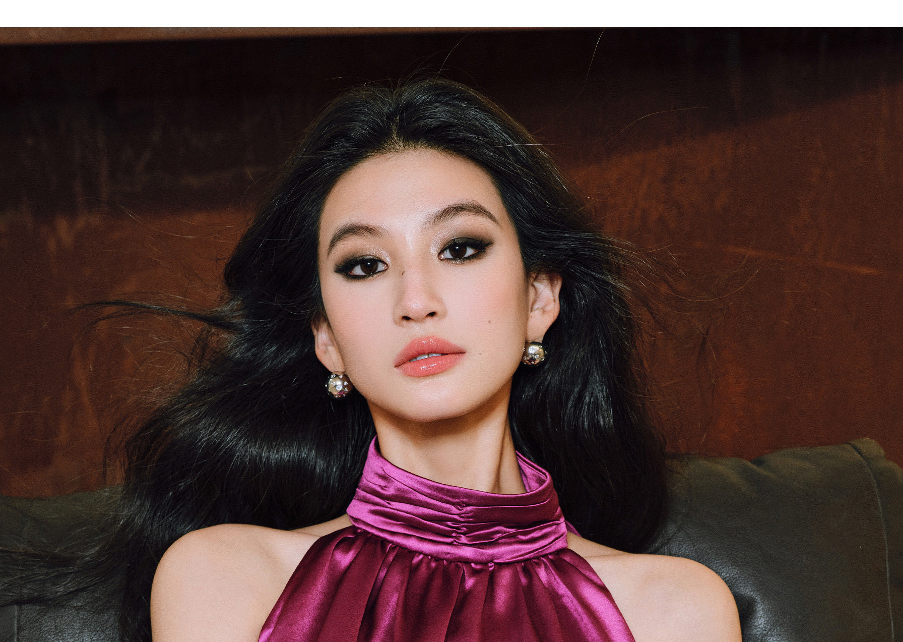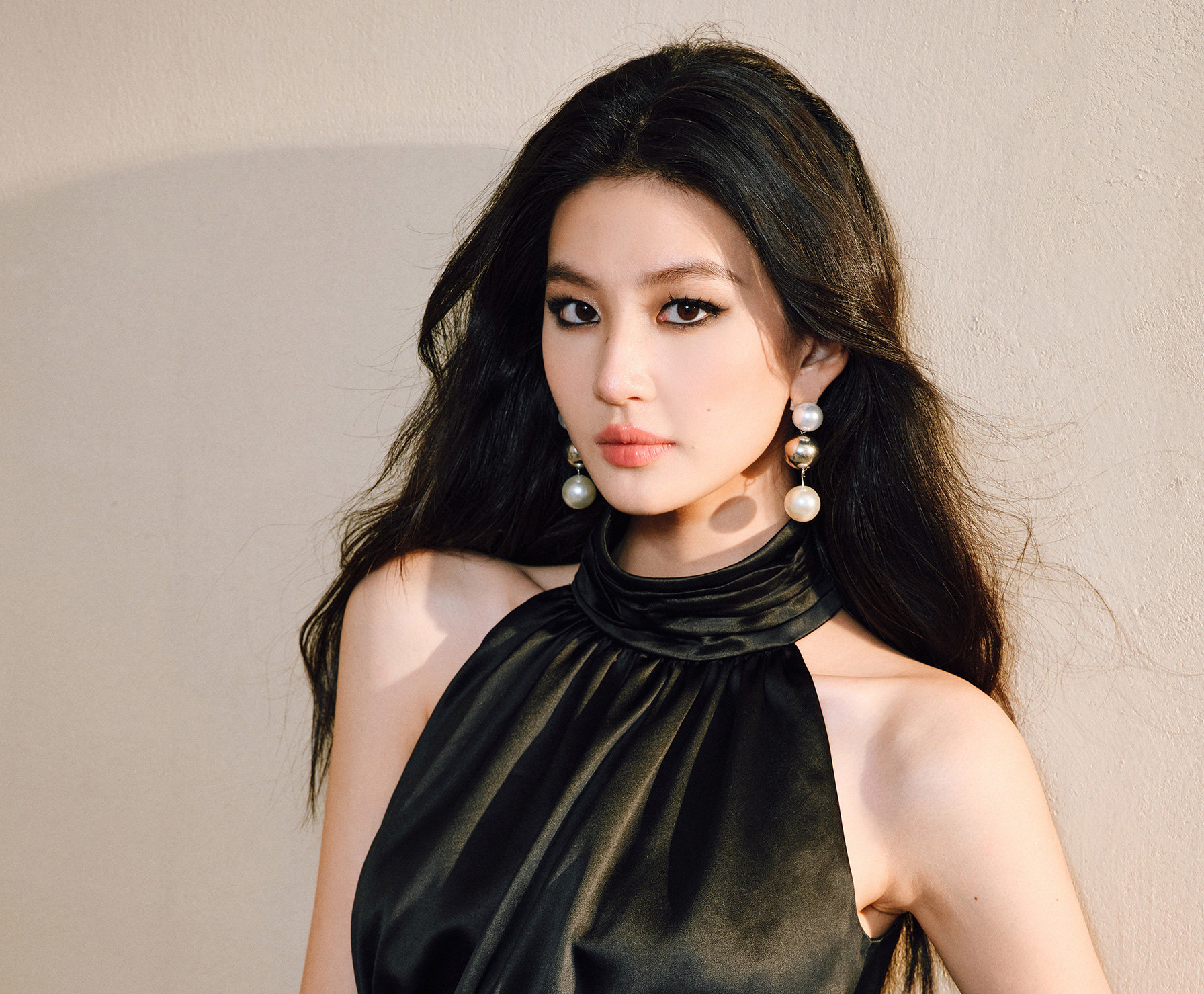 Wangxo|Luxurious Acetate Satin with a Silky Feel That Penetrates the Skin|Stand Collar, Cut-Out Shoulders, Romantic Aesthetic, Ruched Waist, Flared Hem Top