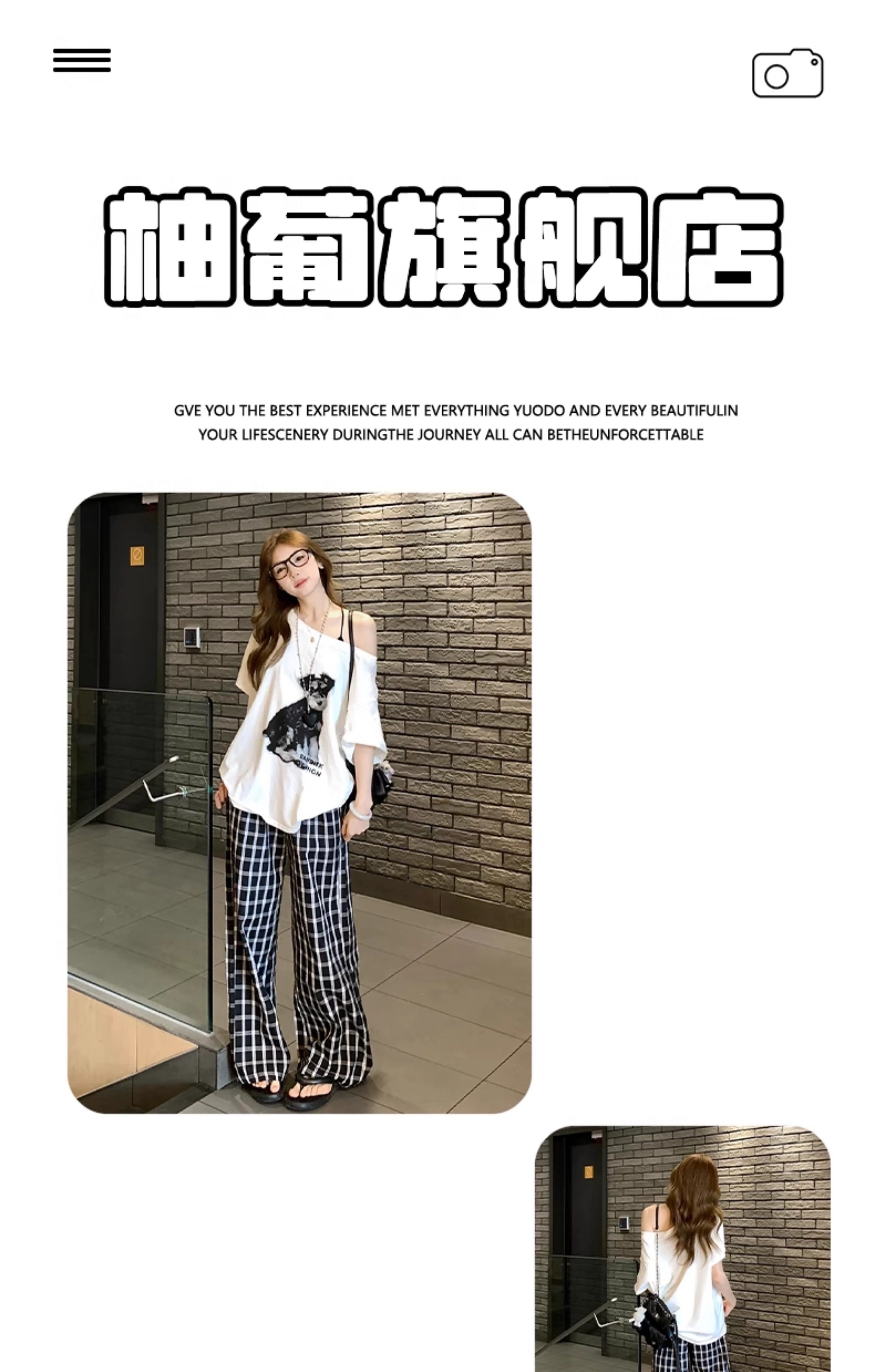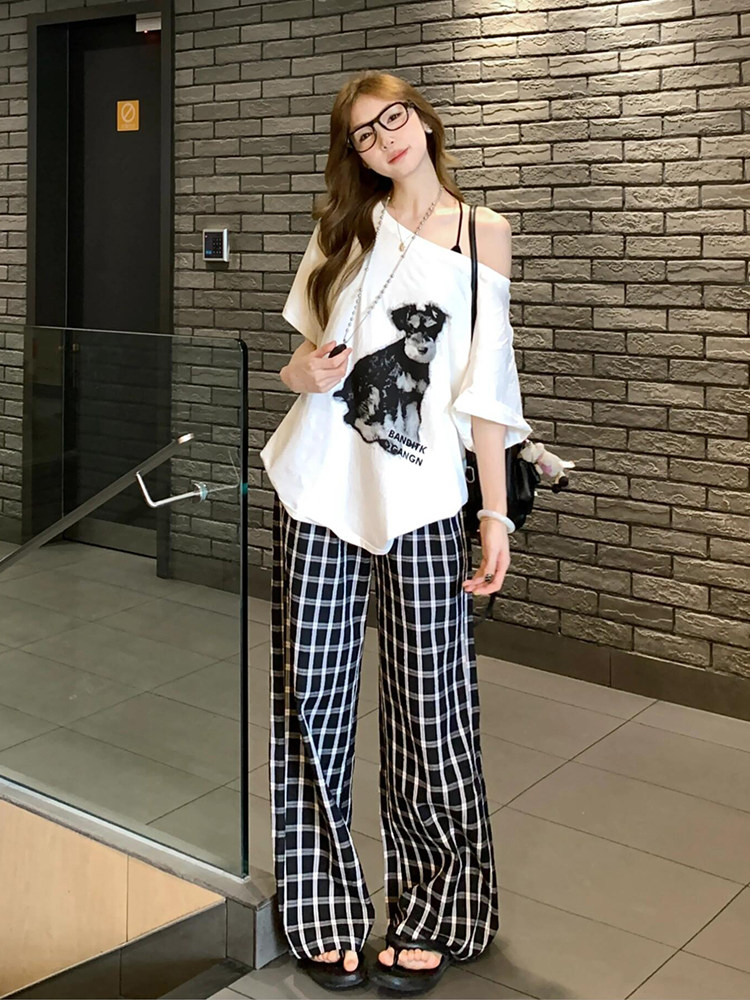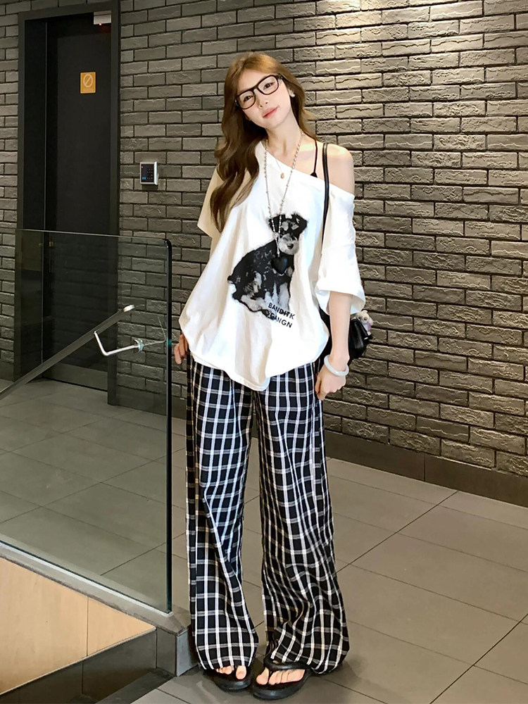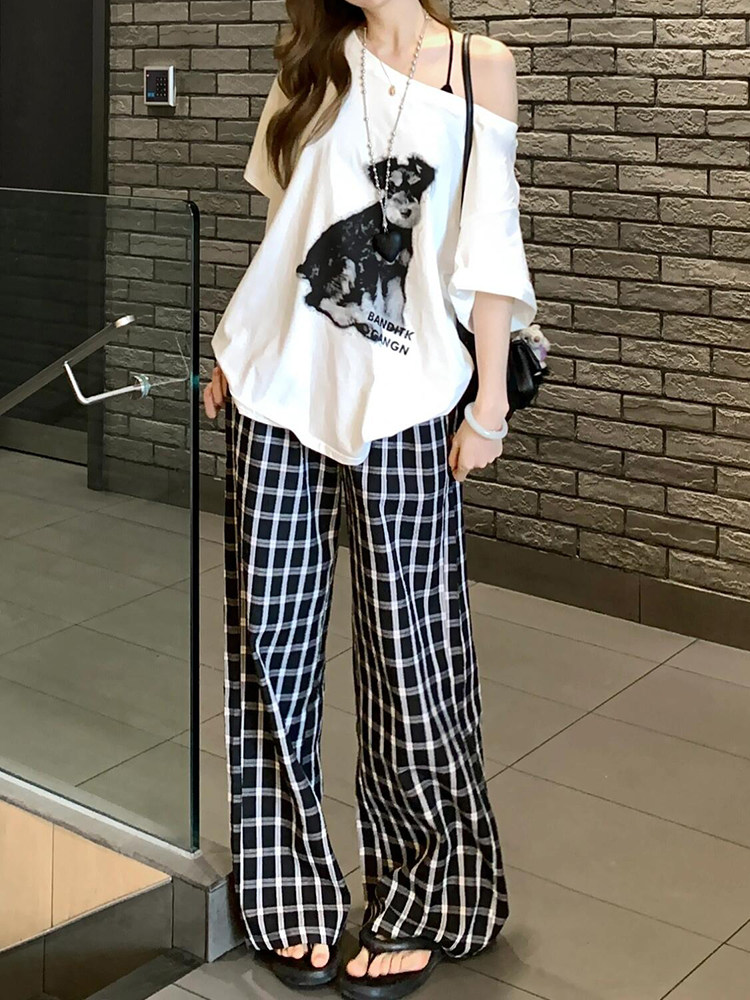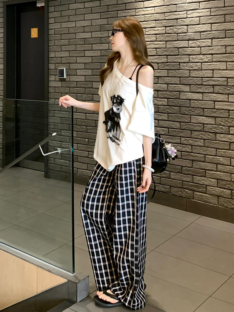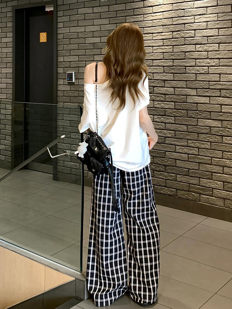 Farbklassifizierung Weißes Oberteil + karierte Hose, zweiteiliges Set aus reiner Baumwolle