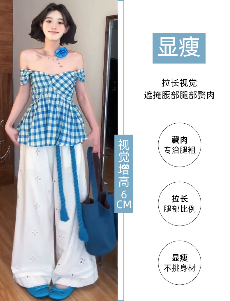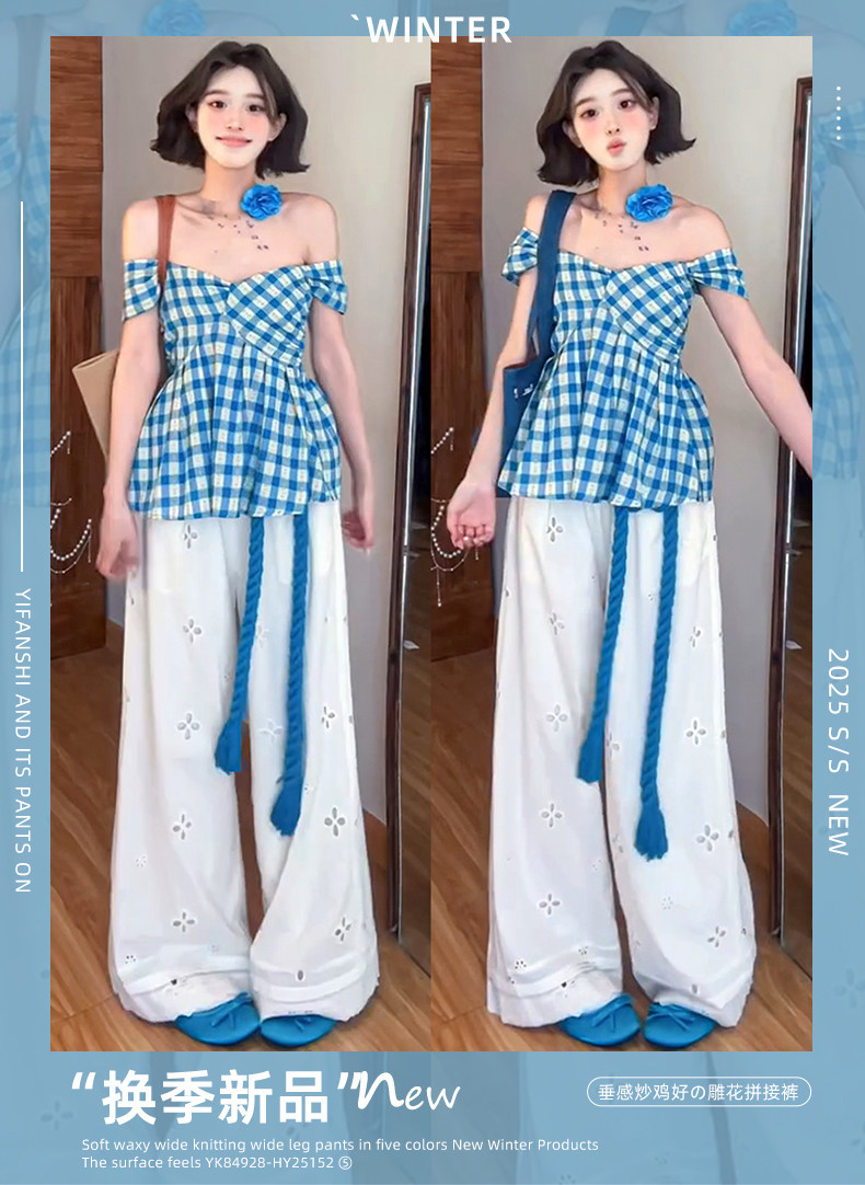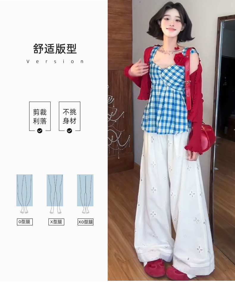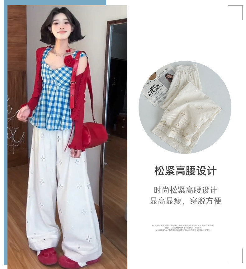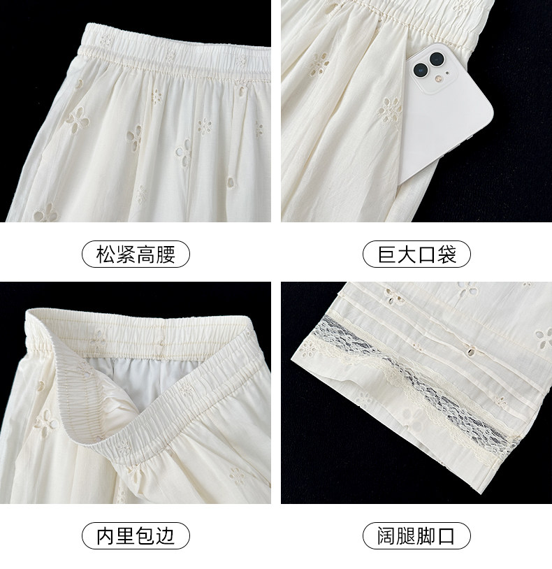 White Lace Patchwork Hollow-Out Wide-Leg Pants for Women, Summer Thin High-Waisted Slimming Ice Silk Pants, Loose Casual Straight-Leg Pants