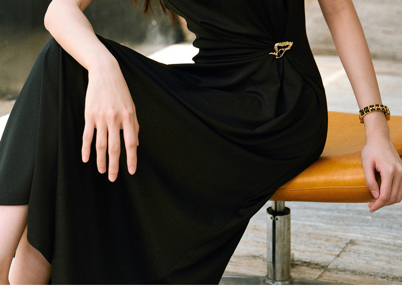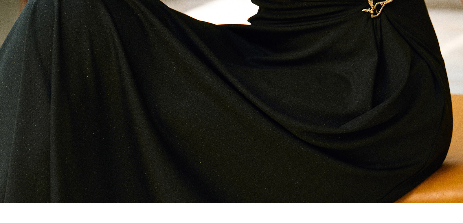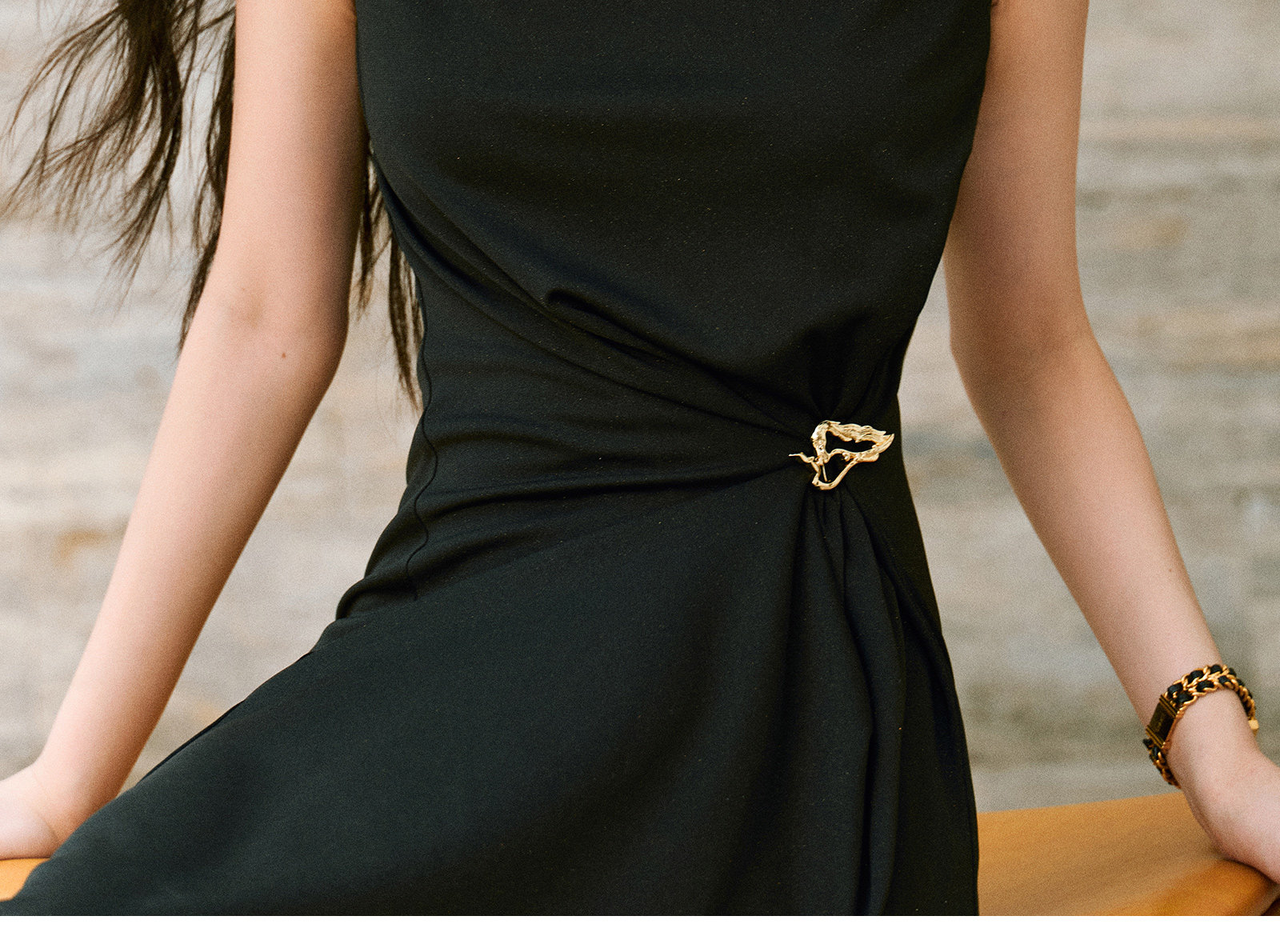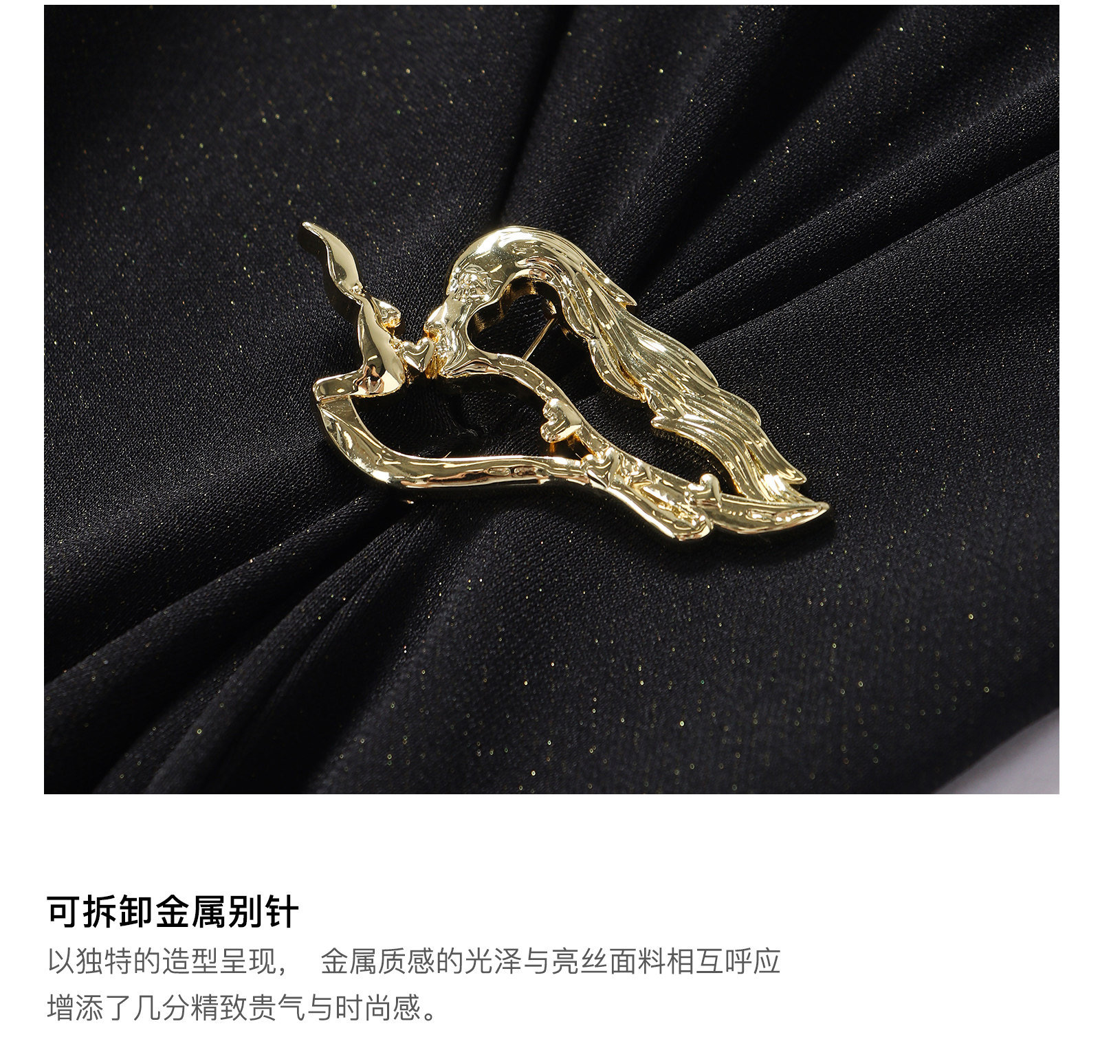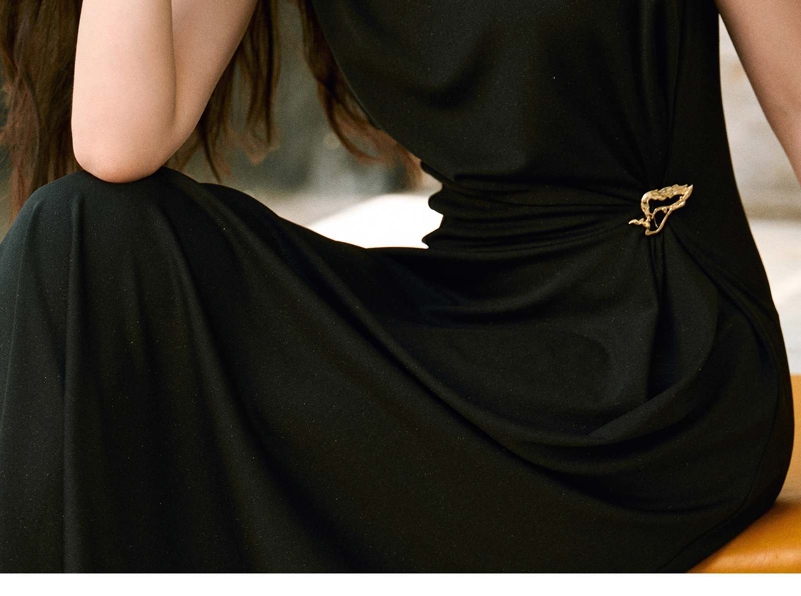Wangxo|Gold Thread Roman Knit|Detachable Art Pin|Pleated Deconstructed Hem Dress