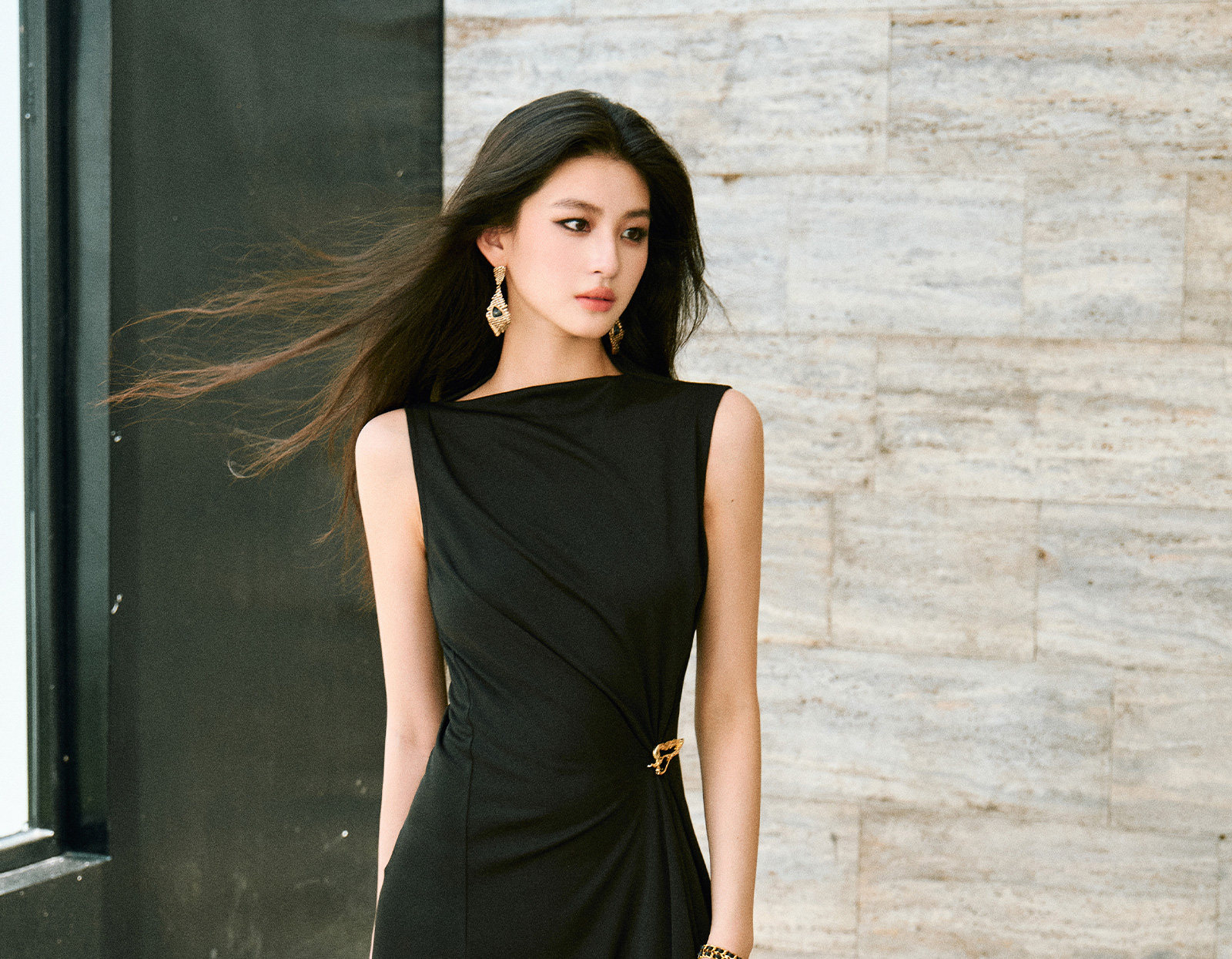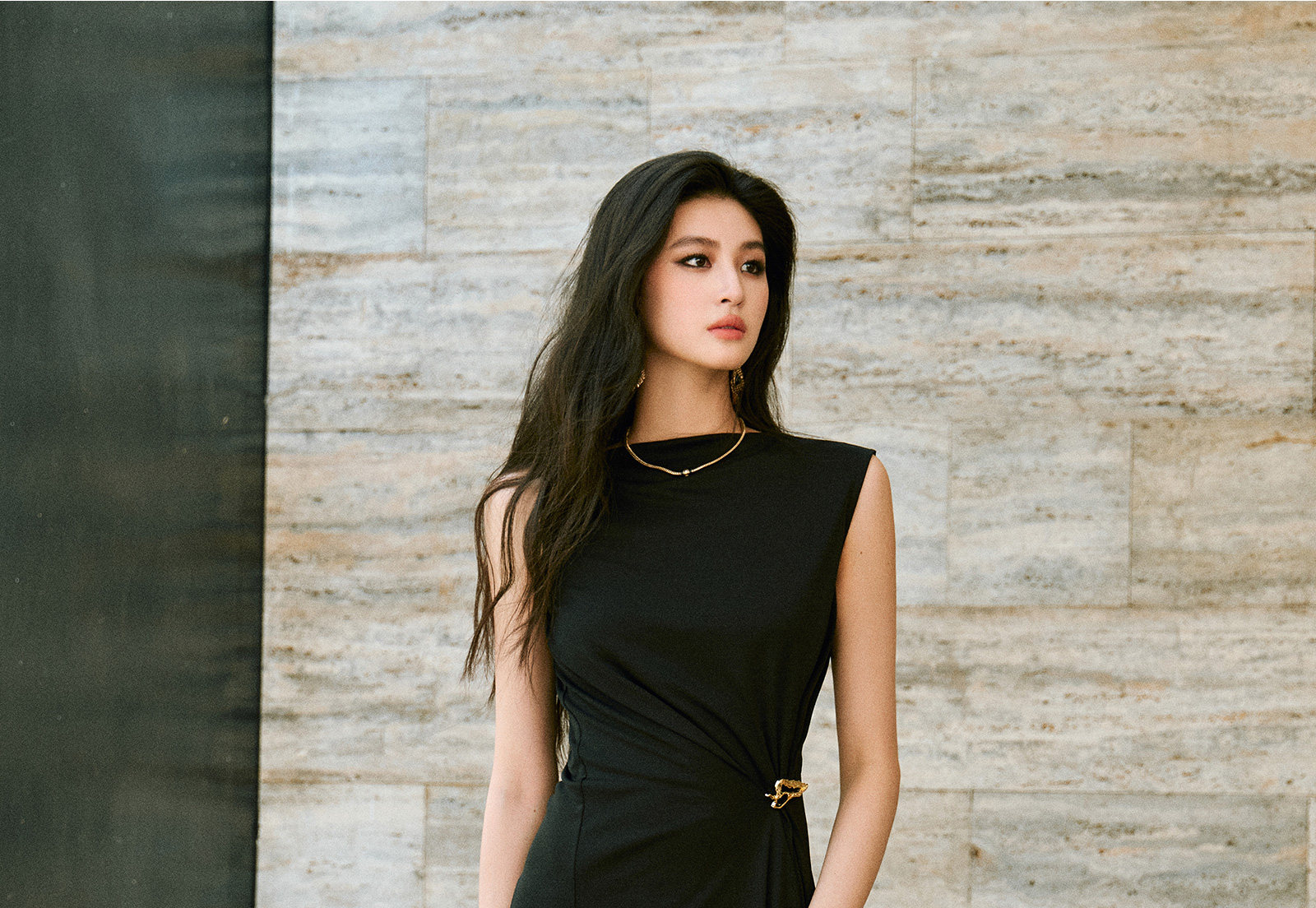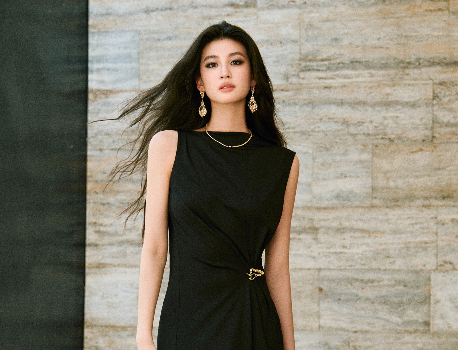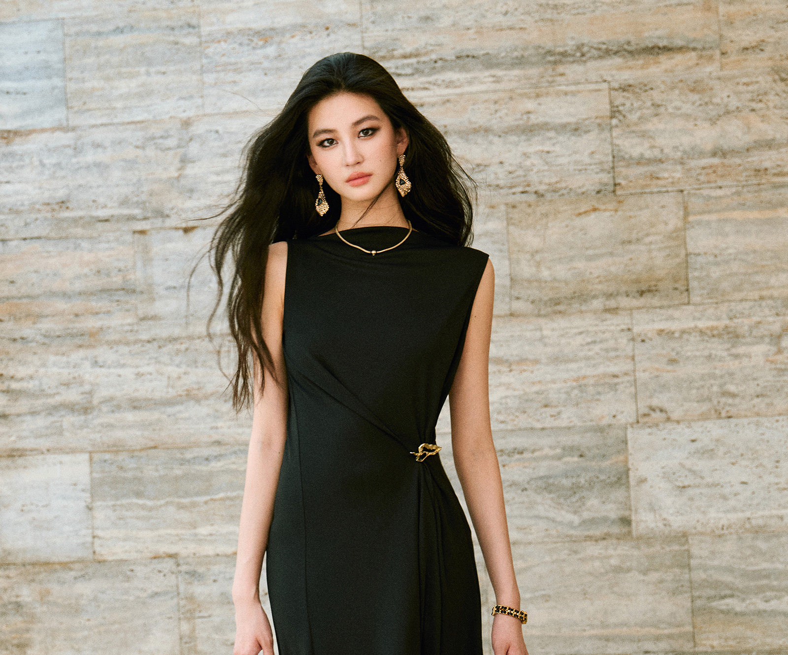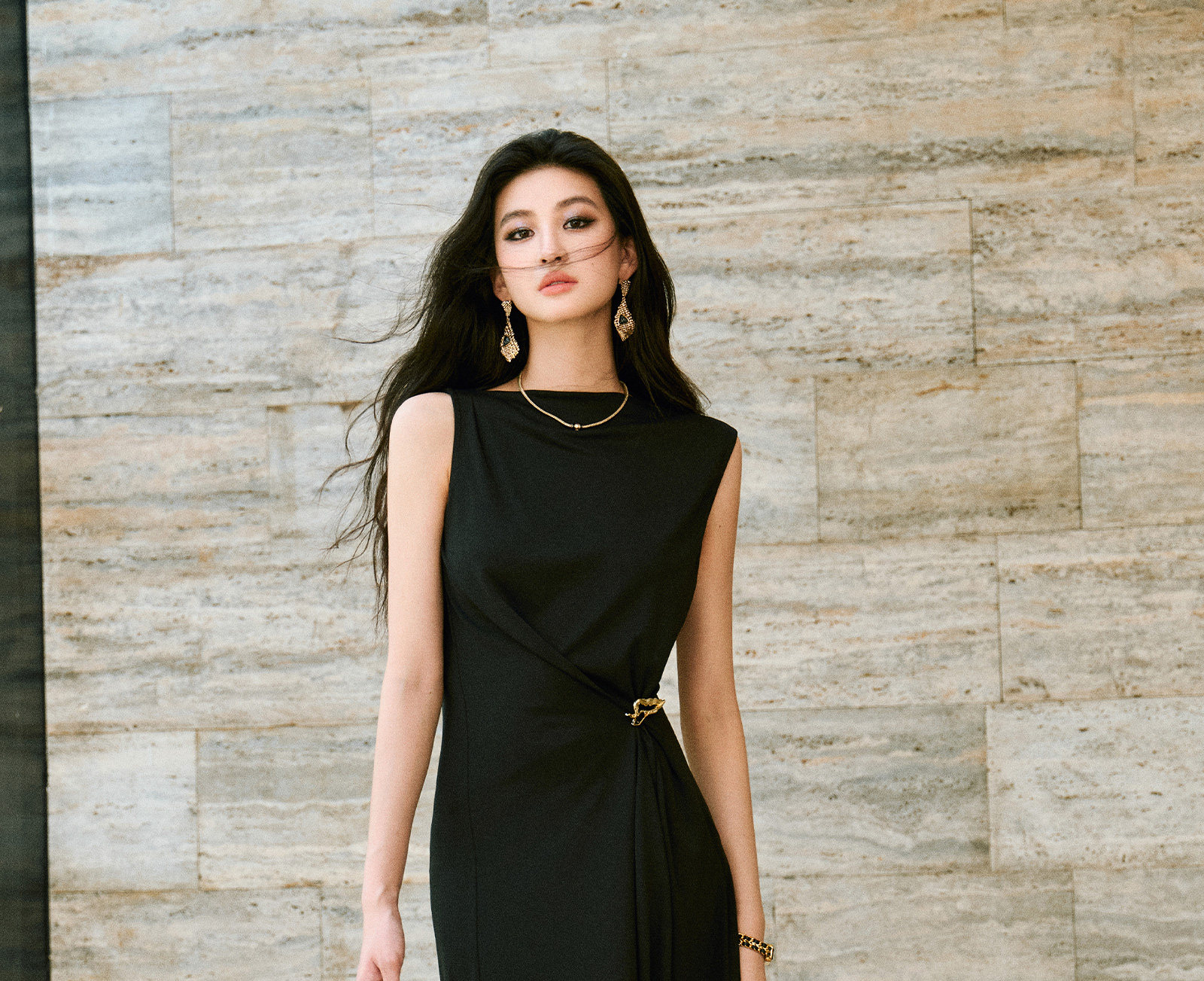 Wangxo|Gold Thread Roman Knit|Detachable Art Pin|Pleated Deconstructed Hem Dress