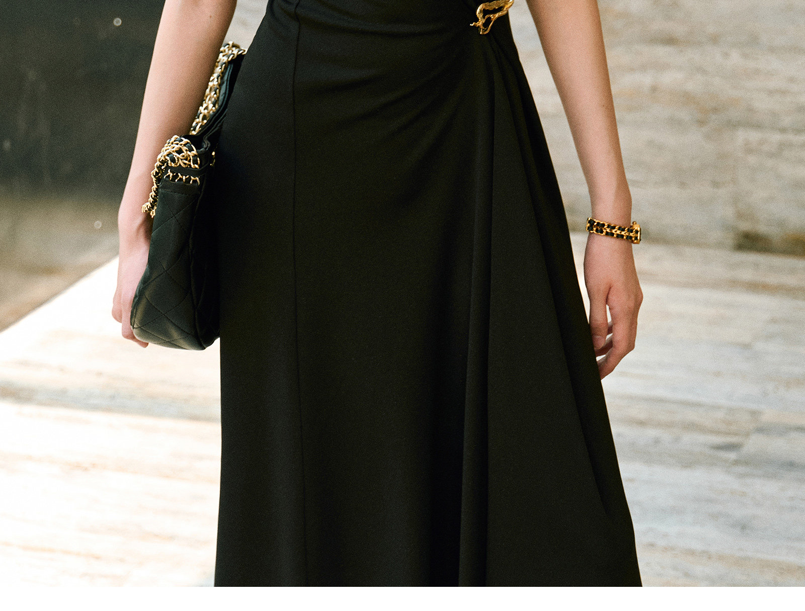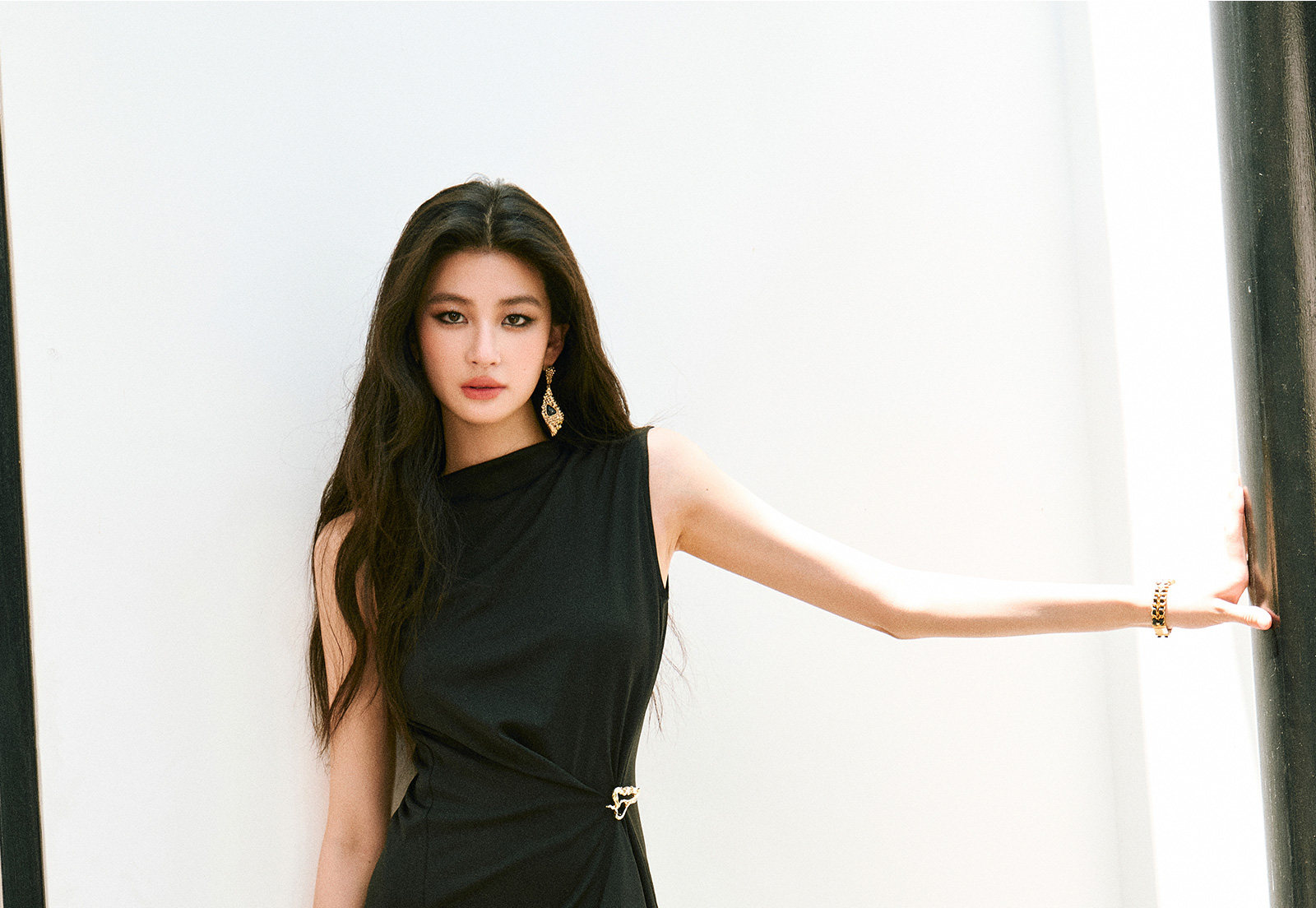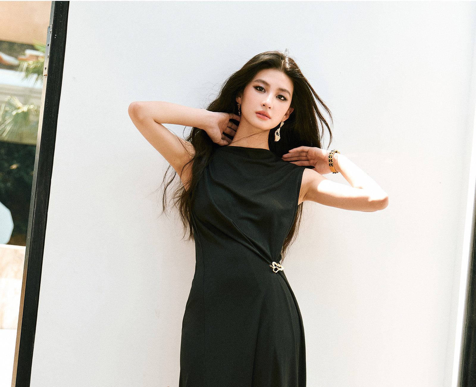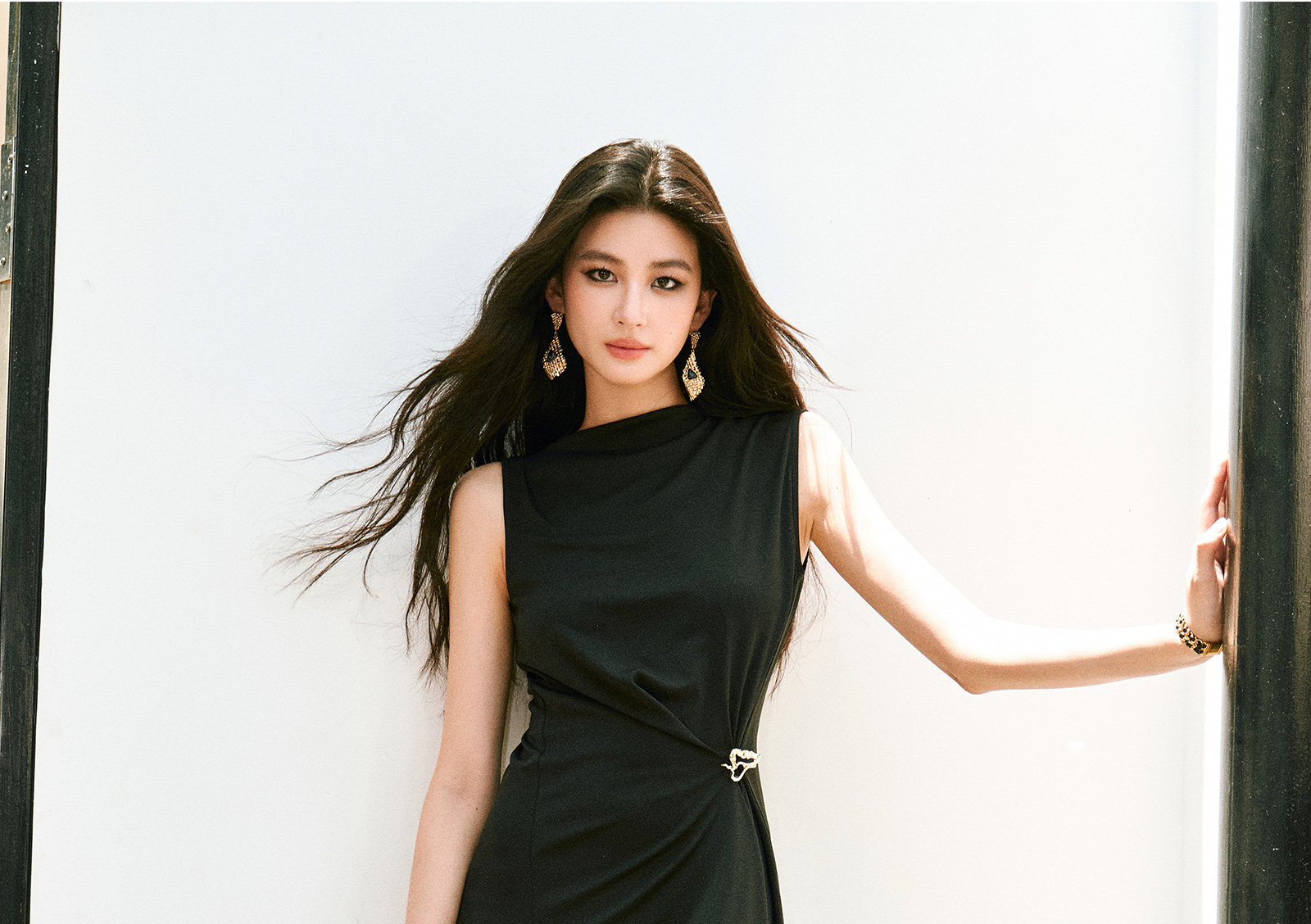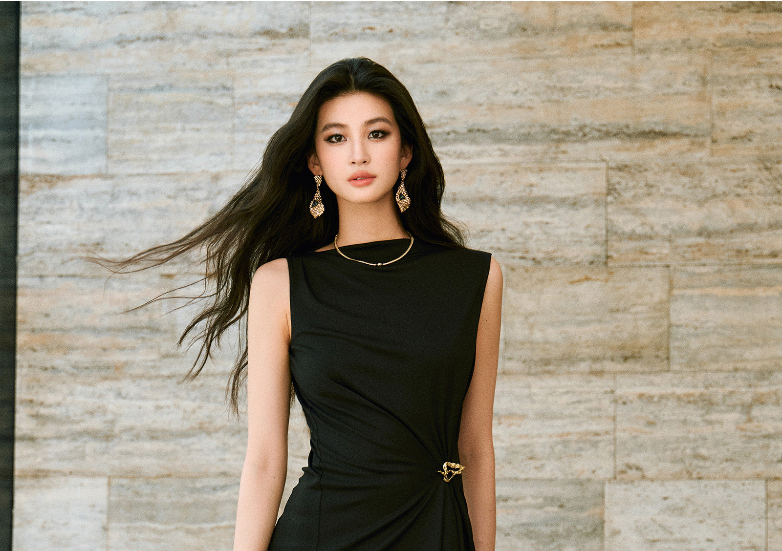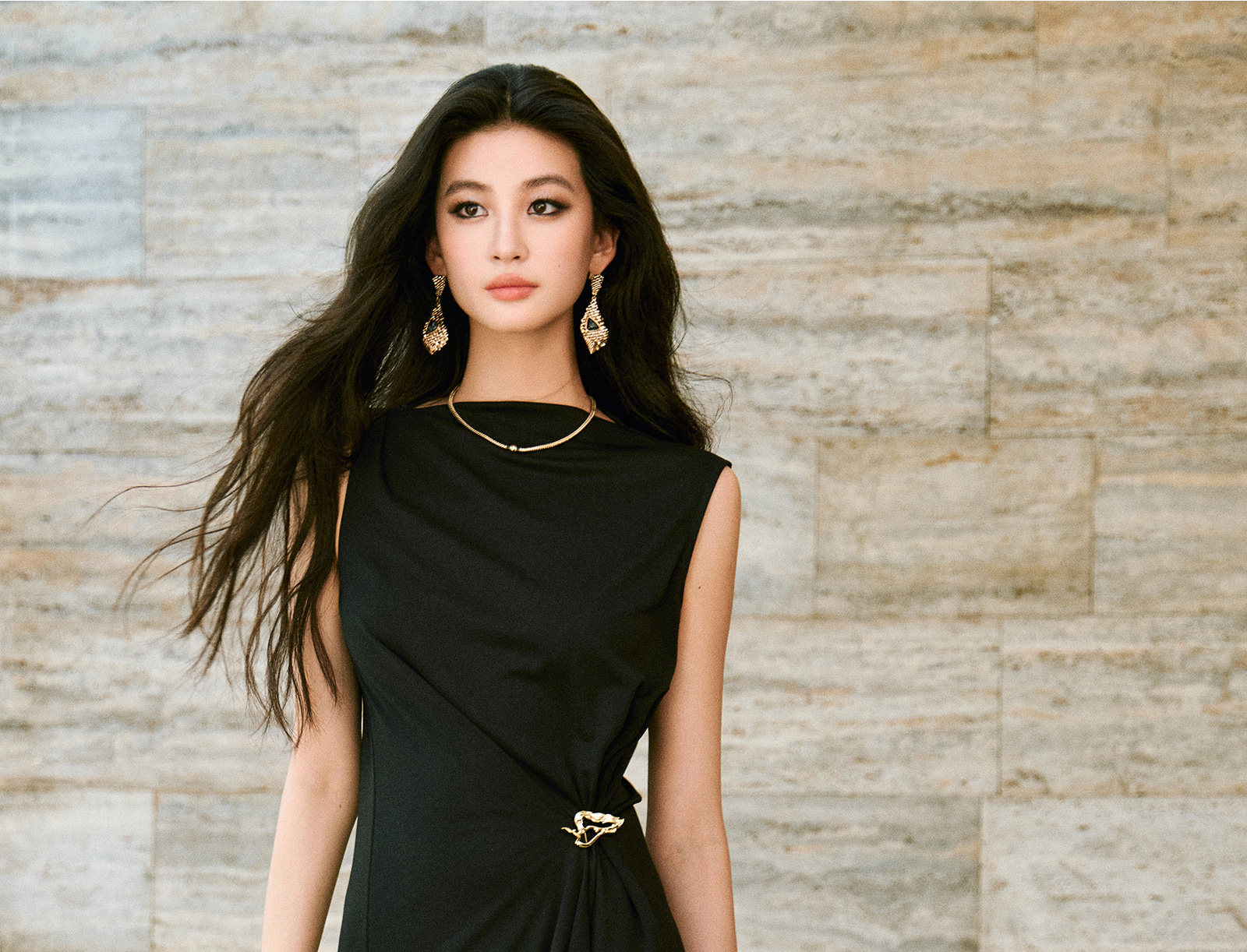Wangxo|Gold Thread Roman Knit|Detachable Art Pin|Pleated Deconstructed Hem Dress