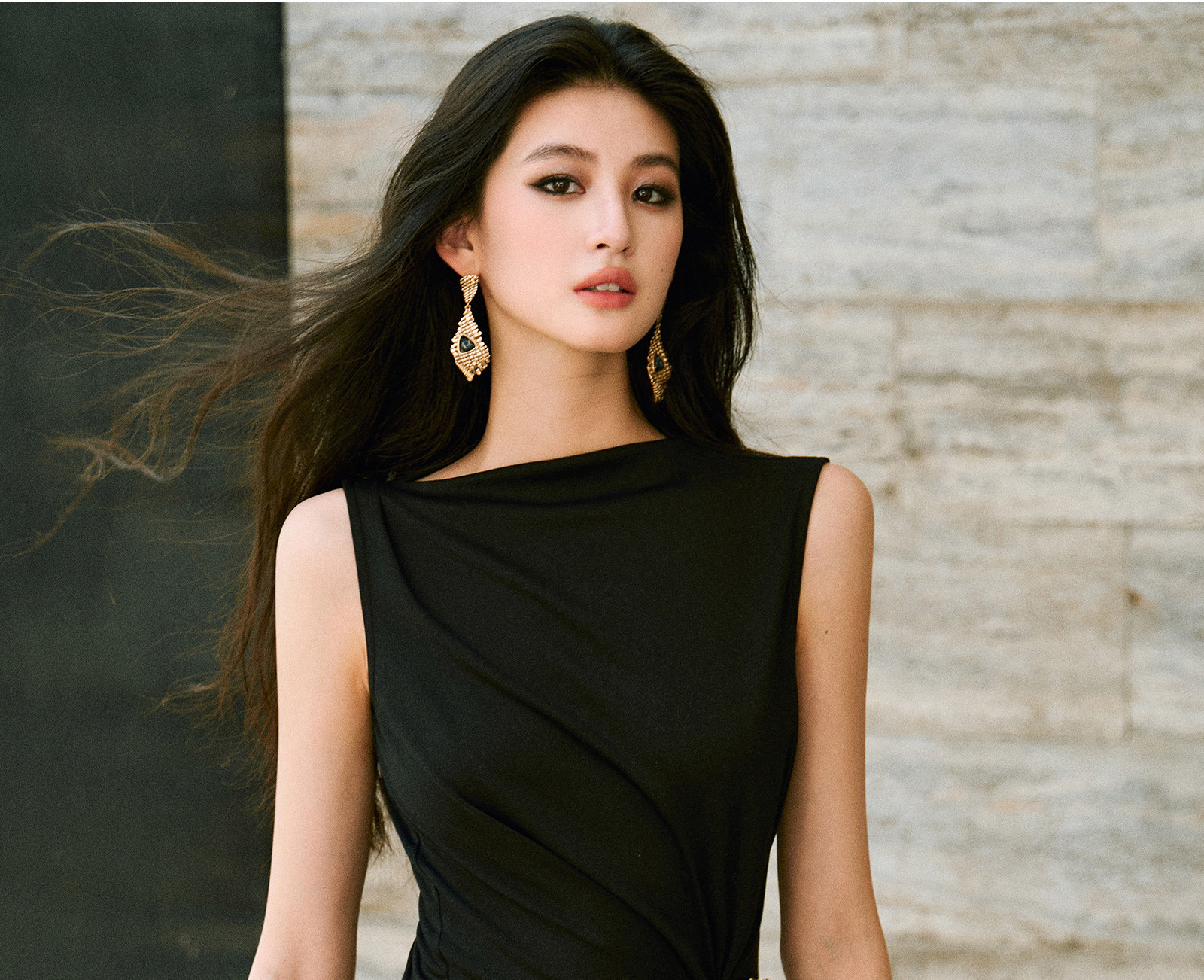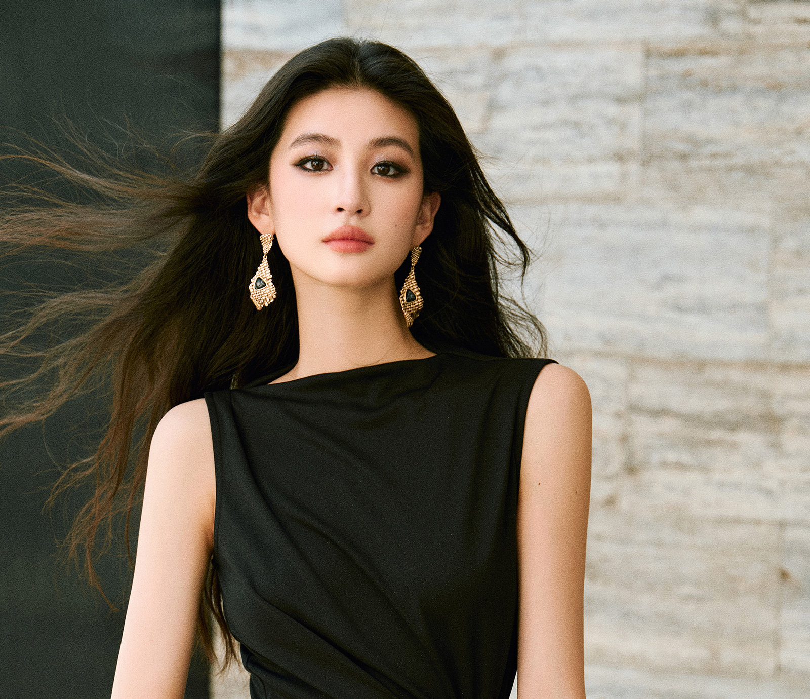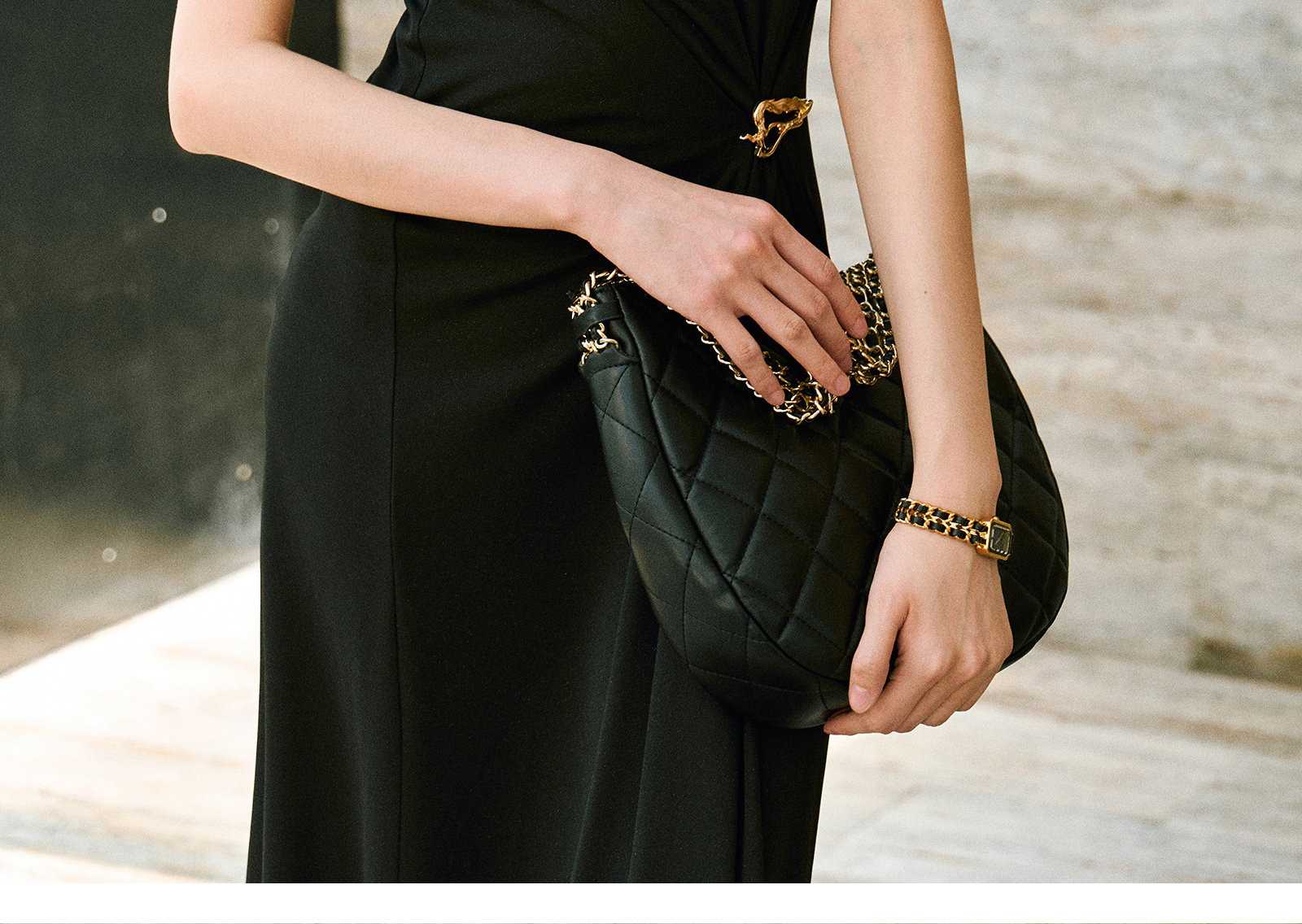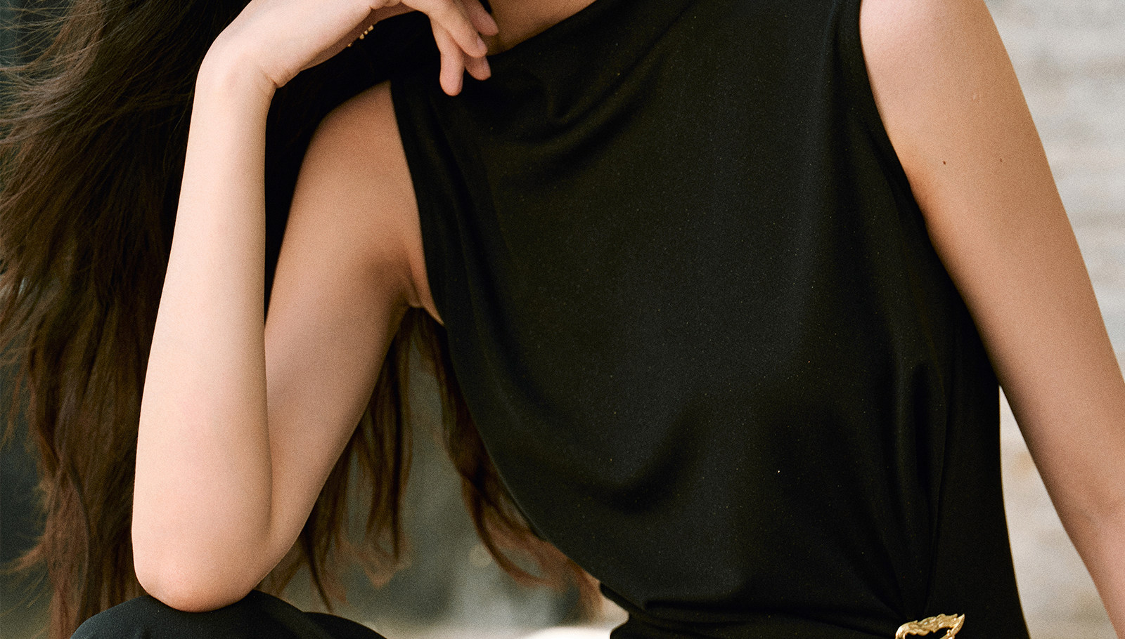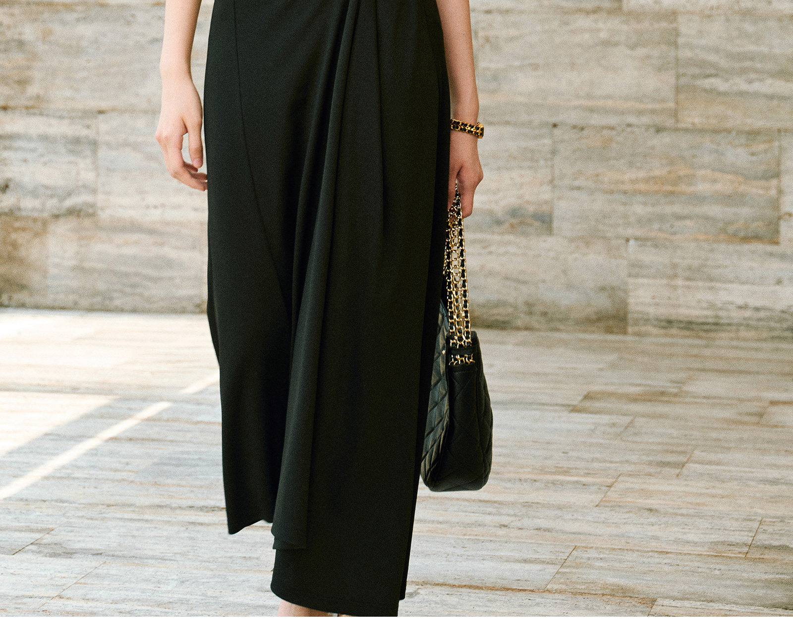 Wangxo|Gold Thread Roman Knit|Detachable Art Pin|Pleated Deconstructed Hem Dress